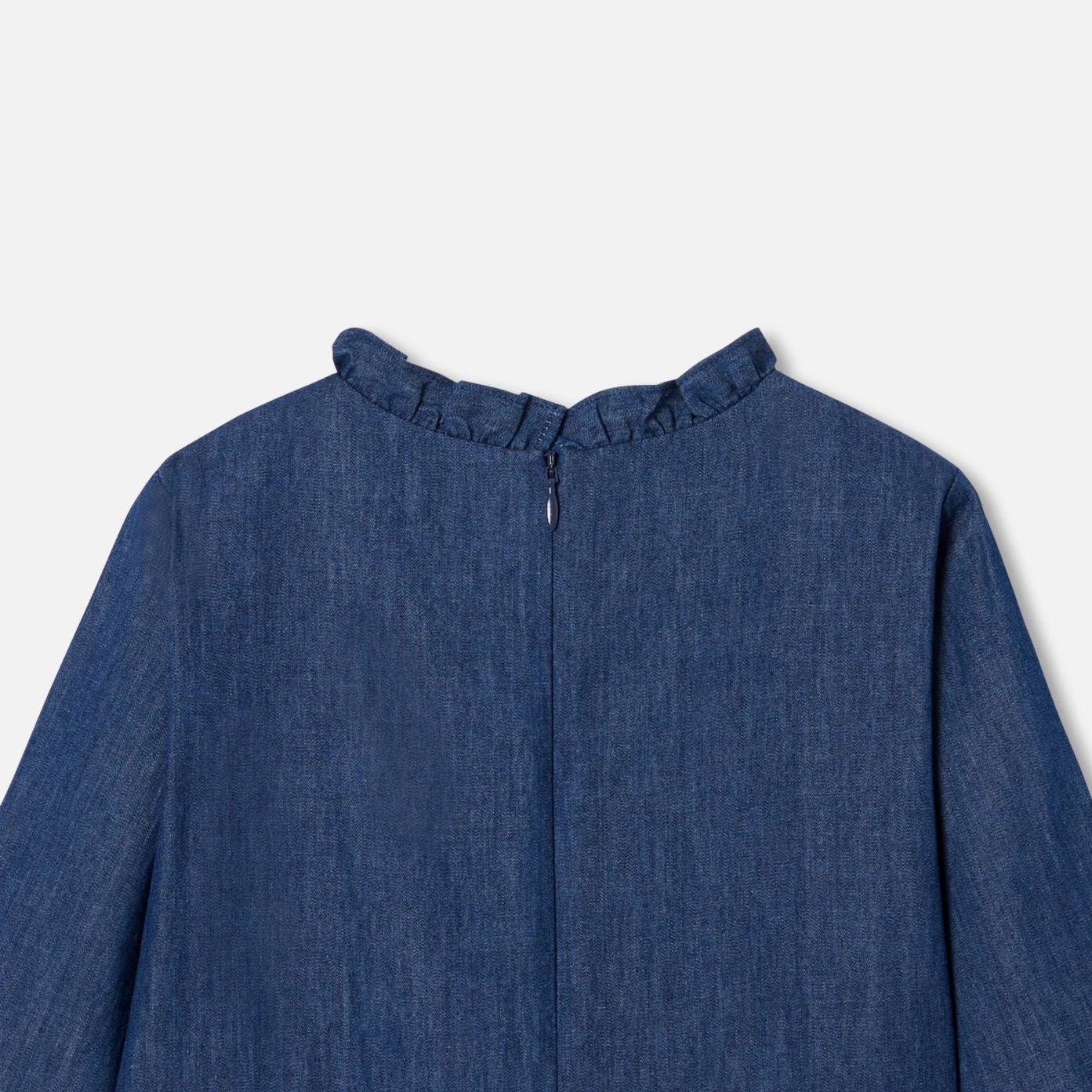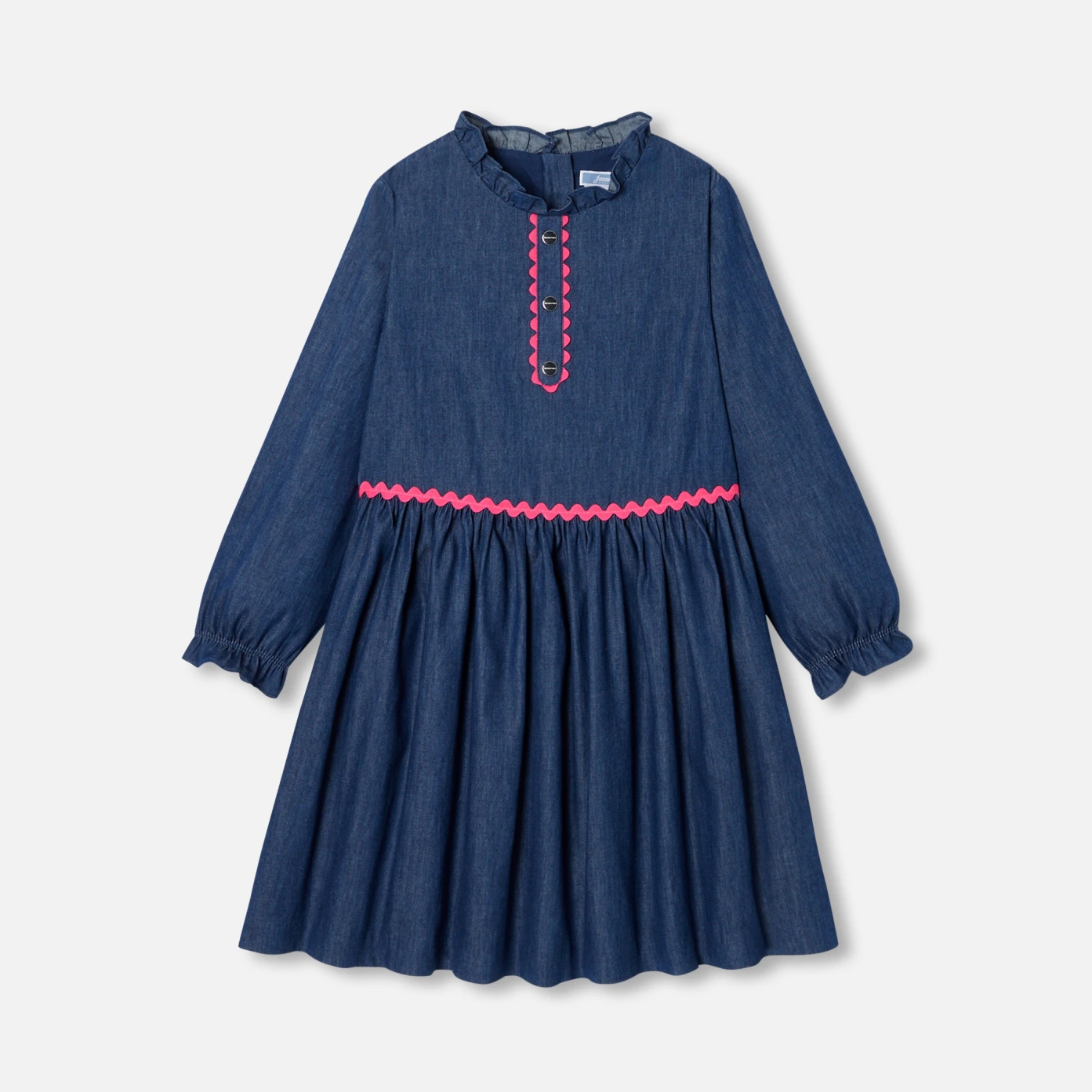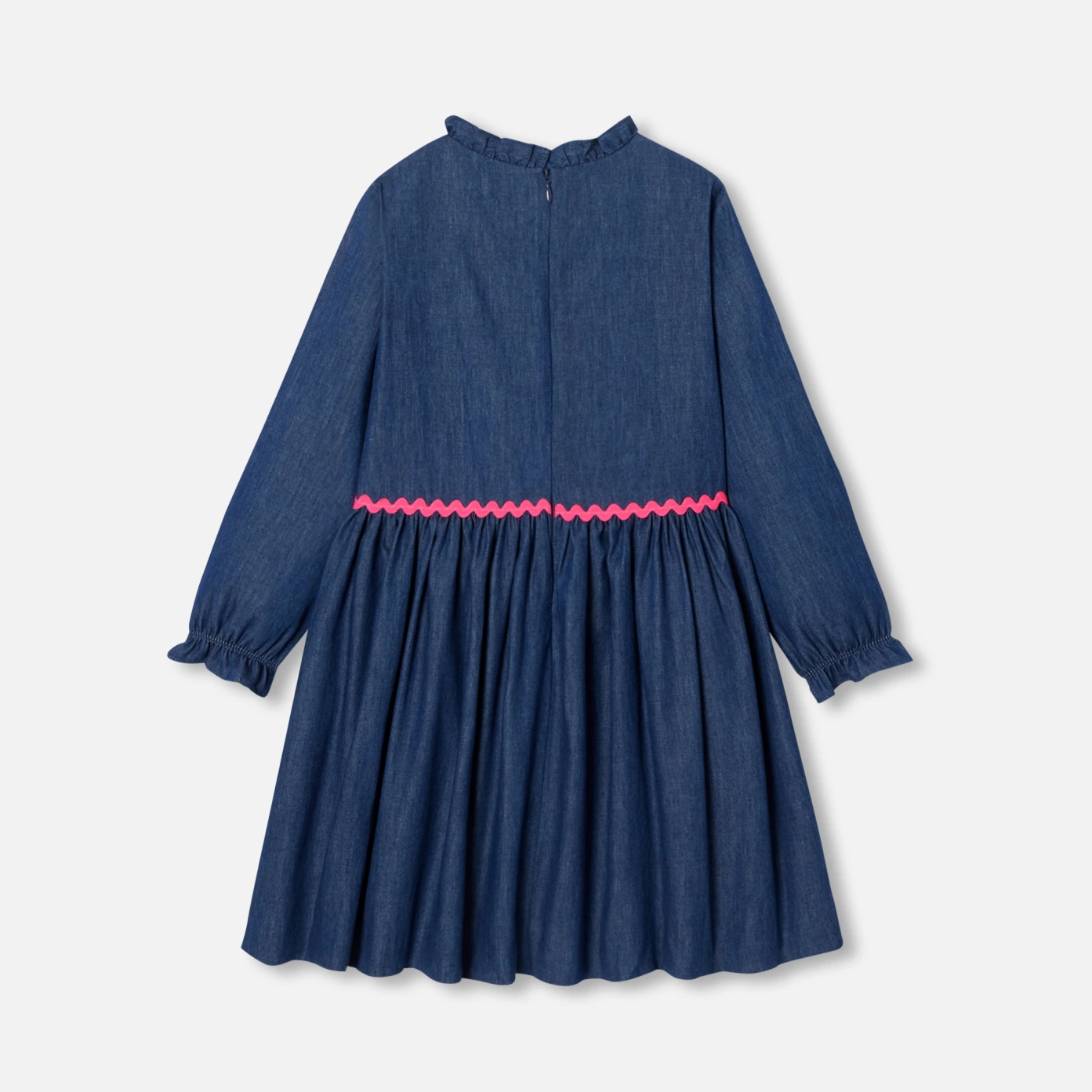 這款女孩洋裝是令人難以抗拒的浪漫魅力單品。以柔軟的丹寧布料重新詮釋,為造型增添現代感。領口和袖口的荷葉邊設計,搭配粉色鉤邊緞帶,讓這款適合上學穿搭的洋裝顯得更加時尚。