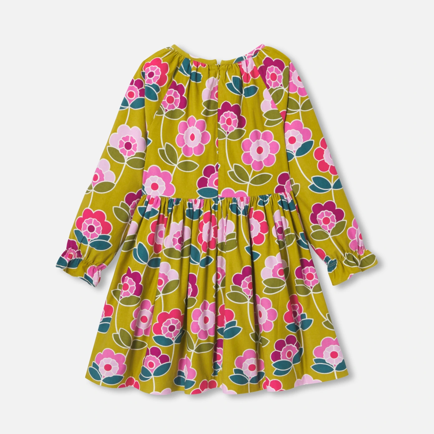 這款女童洋裝以柔軟細條絨布搭配豐富的花卉圖案,領口與腰部的細緻皺褶、棉質襯裡。適合搭配褲襪和一件漂亮的外套,打造出極具現代感的造型。