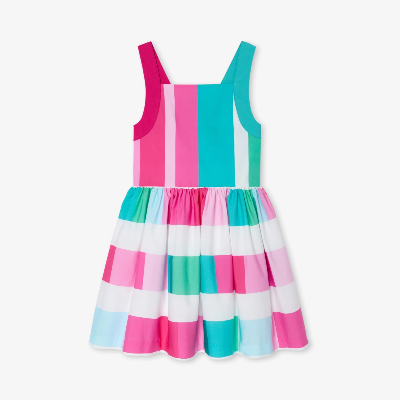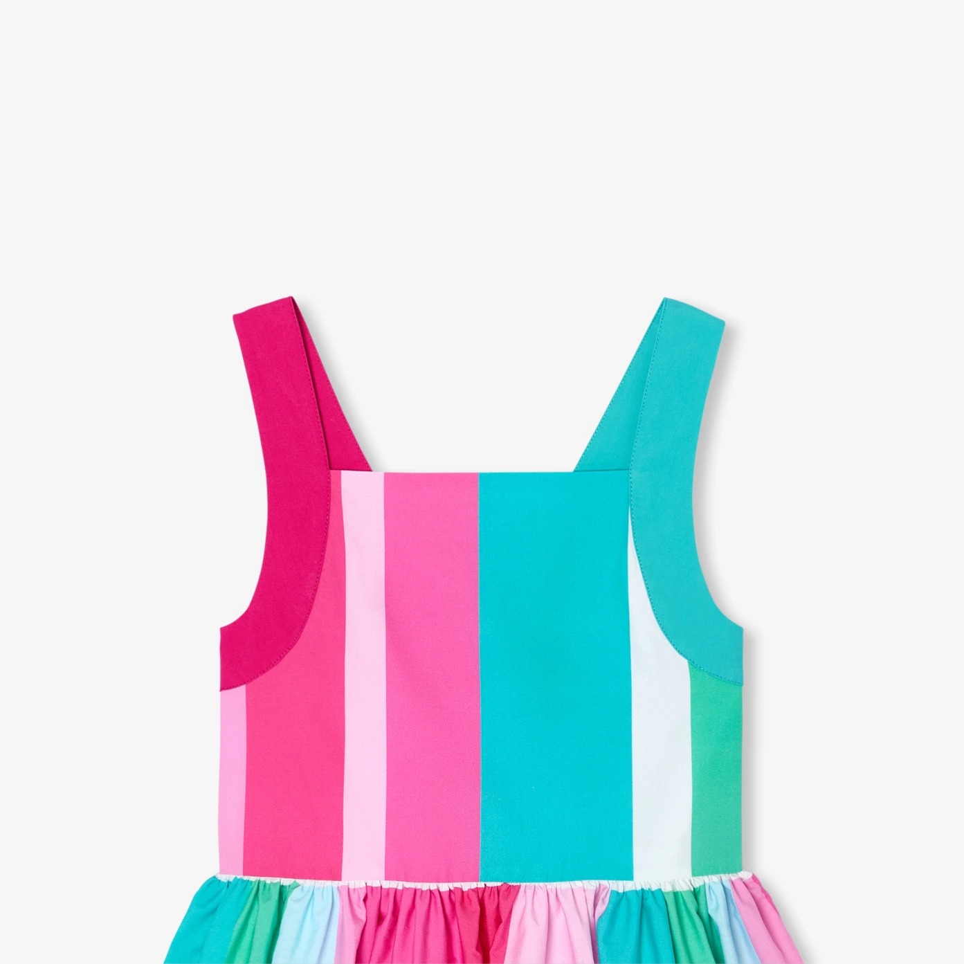 多彩、寬窄版條紋交織出今季的時尚主旋律,這款女童洋裝以輕盈柔軟的棉質府綢打造,腰間細緻打摺設計搭配對比色肩帶,背後交叉剪裁更添活潑俏皮,是夏日贈禮的完美之選。