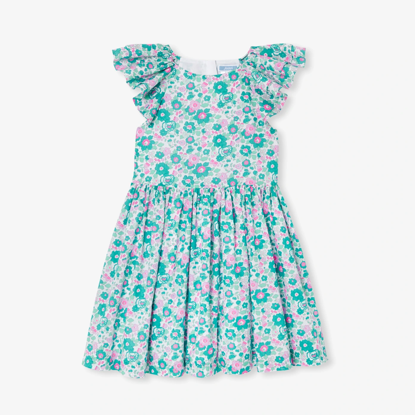 這款女孩洋裝以浪漫荷葉袖點綴,搭配柔和輕盈的 Liberty 印花布,彷彿將孩子帶入夢幻花園。高腰抓皺剪裁營造優雅輪廓,內裡全棉襯裡,穿著舒適透氣。搭配同色系涼鞋與髮夾,打造精緻迷人的夏日造型。