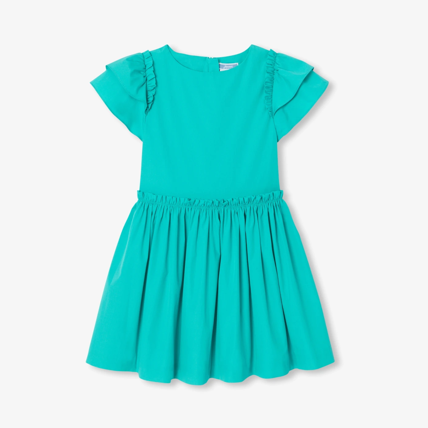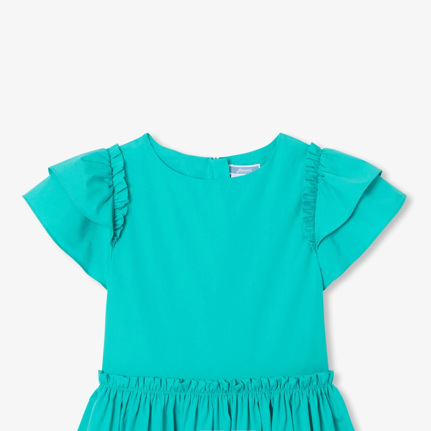 這款女童洋裝以幾何細節詮釋春日優雅。選用鮮豔的祖母綠棉質府綢,層疊荷葉袖與細緻抓褶設計,為這款浪漫單品增添造型感,完美迎接陽光燦爛的季節。