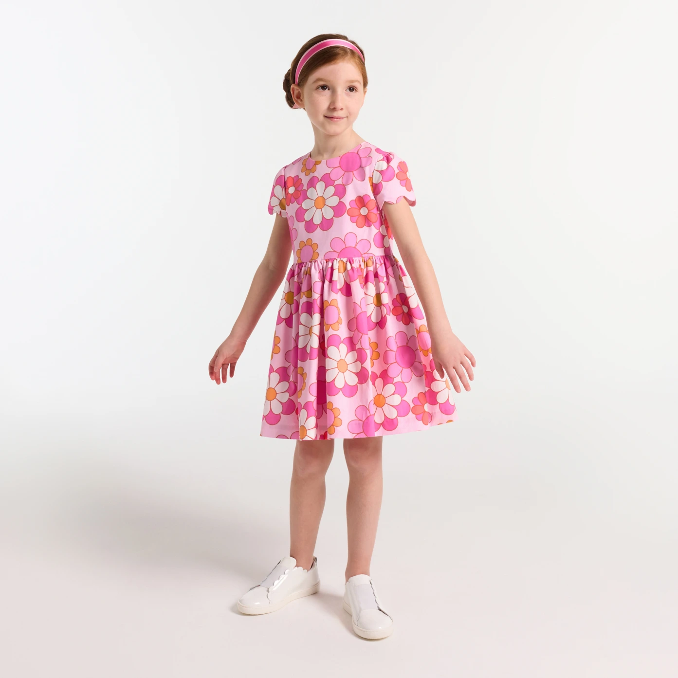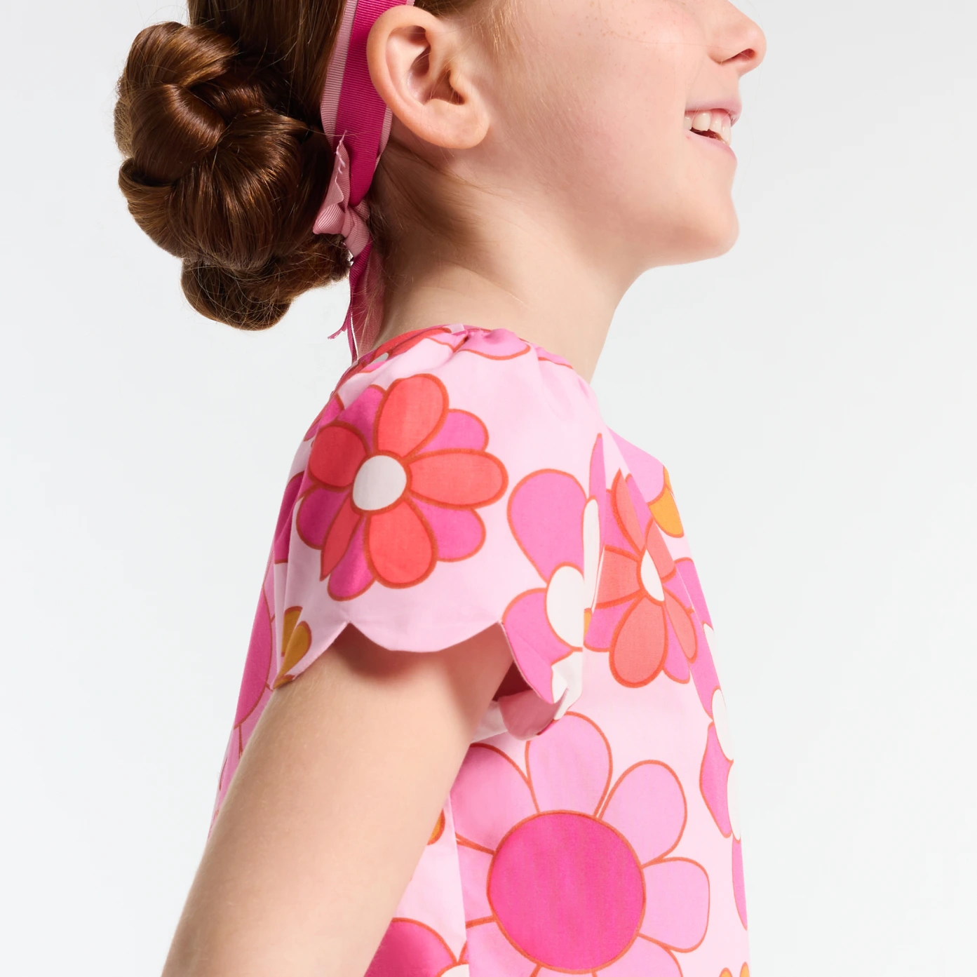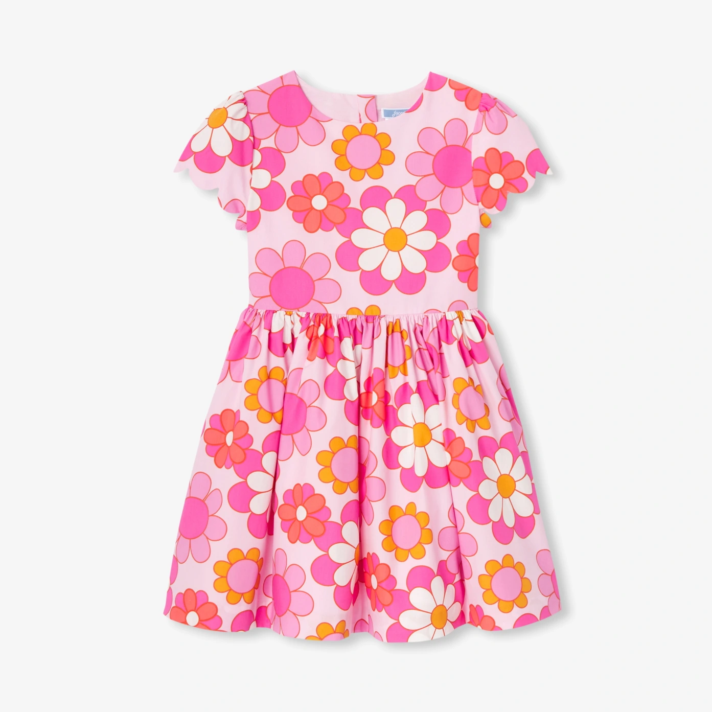復古花卉大圖案的優雅韻味,搭配結構分明的剪裁,這款70年代風格女童洋裝必能打造出時尚清新的輪廓。選用有機棉府綢製成,設計短花瓣袖與收腰細節,內裡全襯,提升穿著舒適感。適合慶祝夏末活動,是開學季衣櫥中不可或缺的單品。