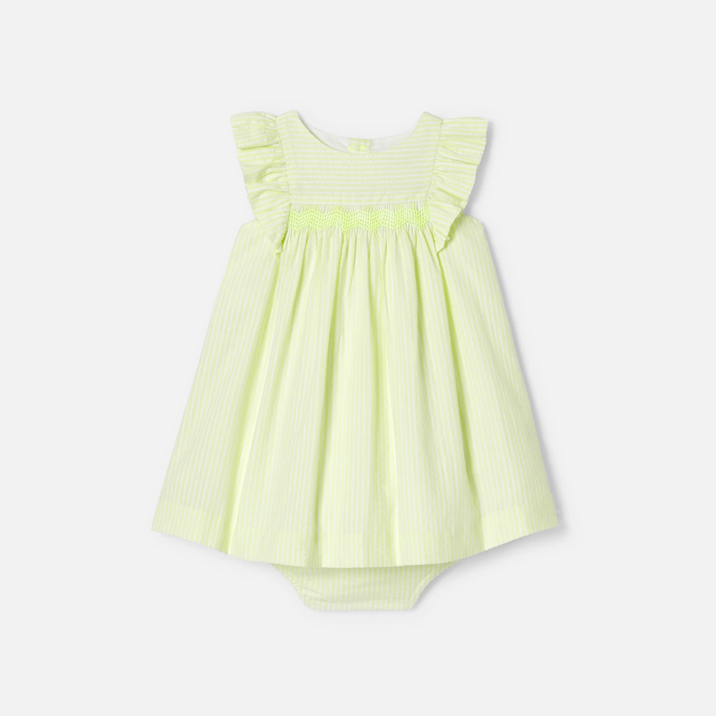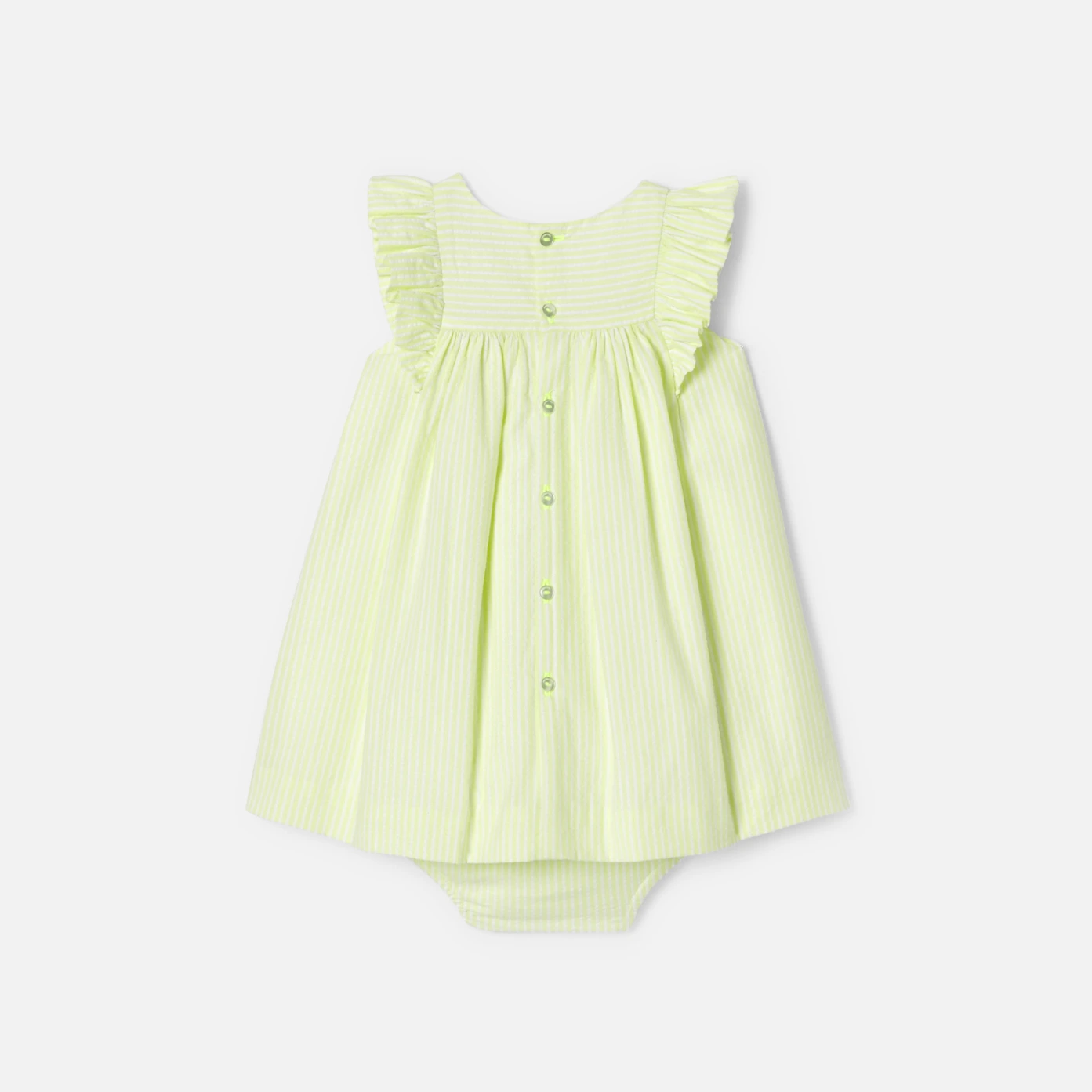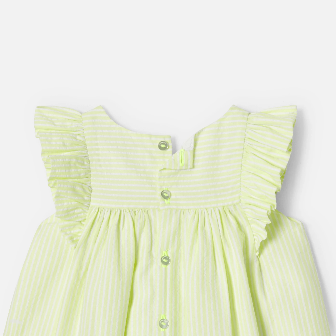 別緻且富含清新活力,這款女童洋裝展現了夏季衣櫥的所有必備元素。採用條紋泡泡紗、荷葉邊袖孔、霓虹色繡花褶皺設計,適合搭配配套燈籠褲穿著,適合度假或慶祝活動。