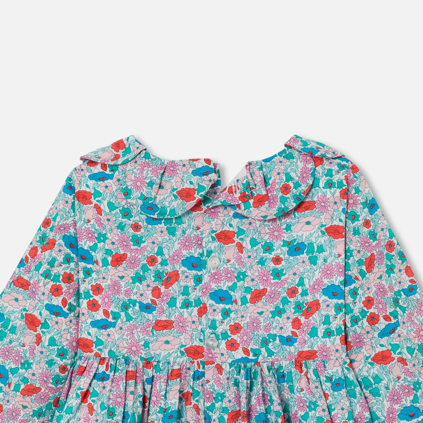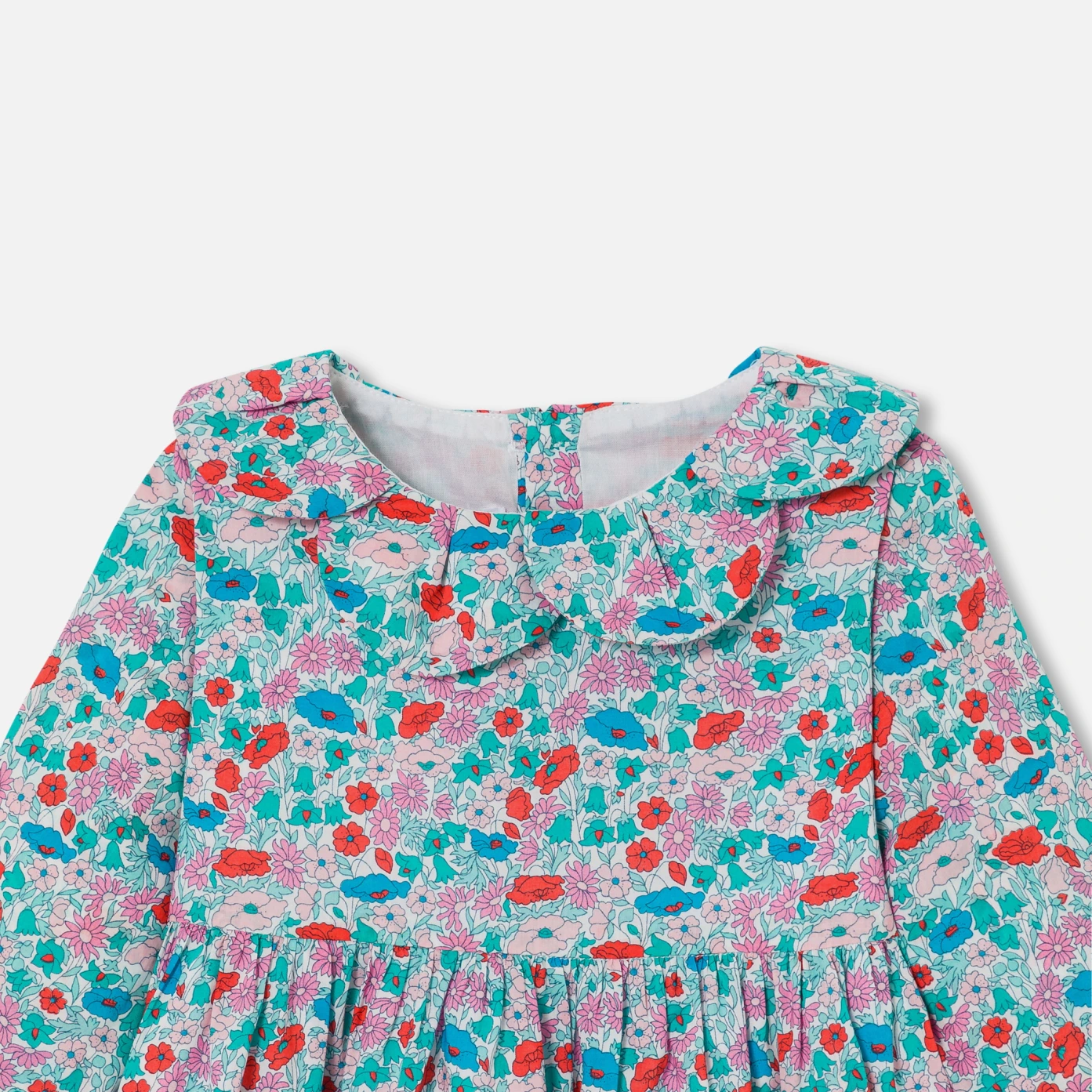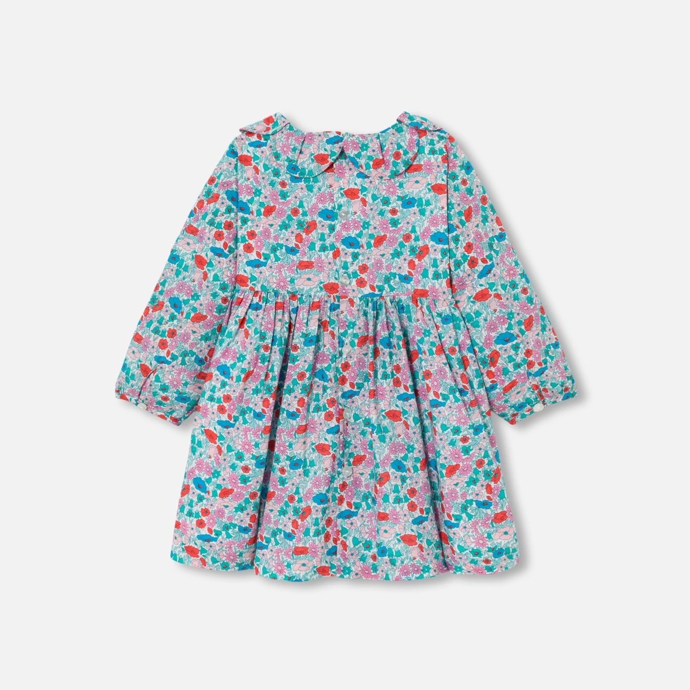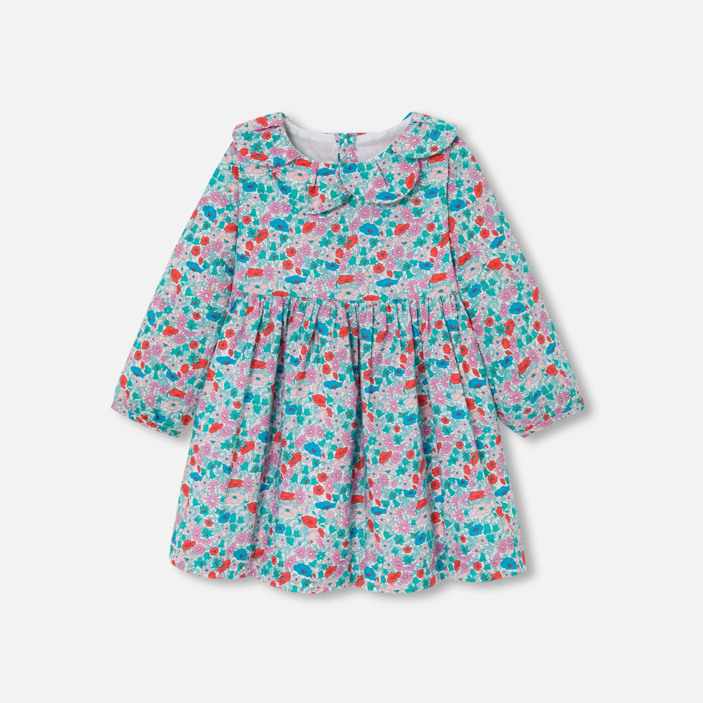 這款小女童洋裝以閃亮的 Liberty 布料打造,為新一季增添法式魅力。花瓣領和腰部的打褶設計,帶來優美的立體感,搭配素色褲襪和芭蕾舞鞋,完美呈現法式優雅造型。