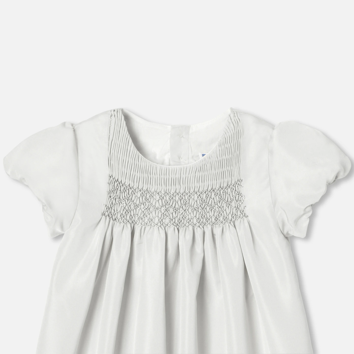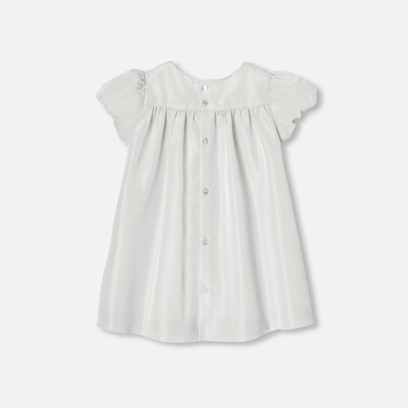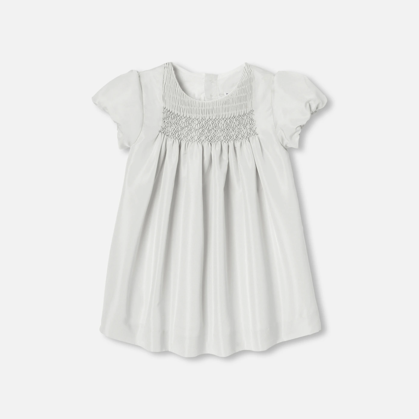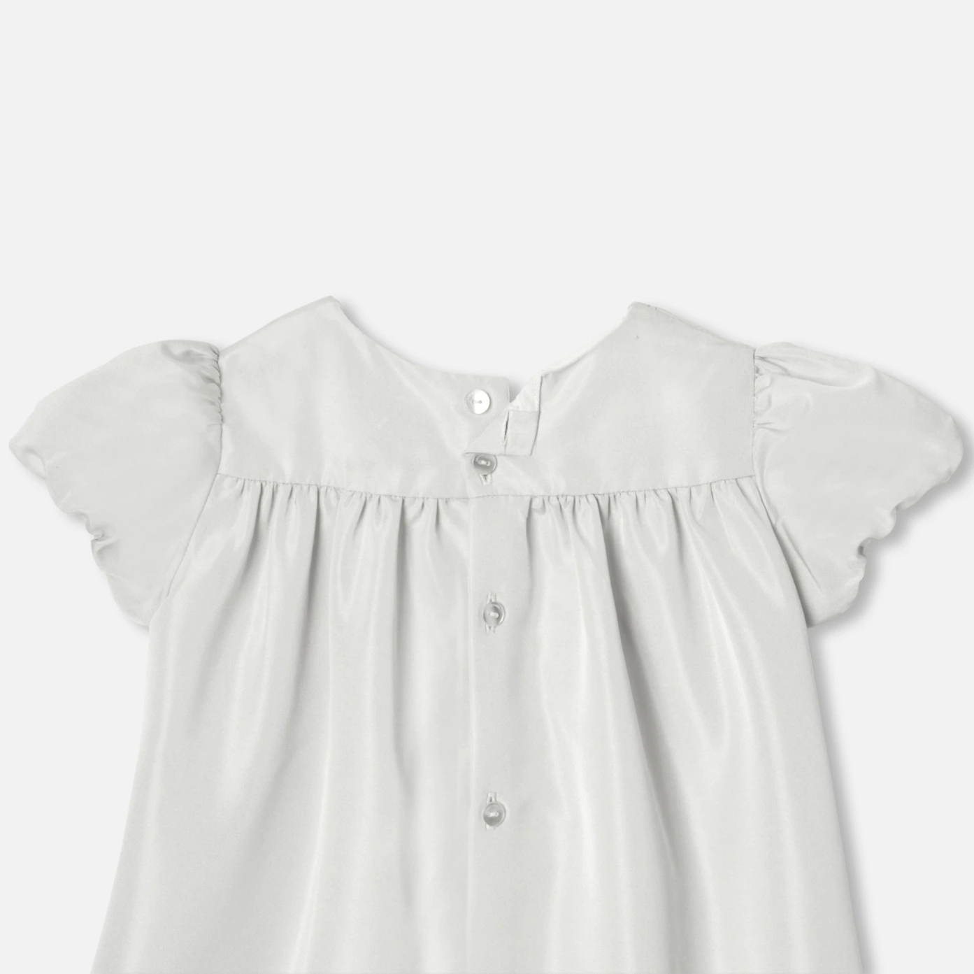 這款銀色塔夫綢小女童寶洋裝,以精緻手工燙褶點綴,結合短澎袖設計,完美演繹高雅與舒適兼具的法式美學。無領剪裁搭配細緻抓皺,營造極簡卻奢華的層次感,適合參加派對、典禮等重要時刻,讓寶貝閃耀每個珍貴瞬間。