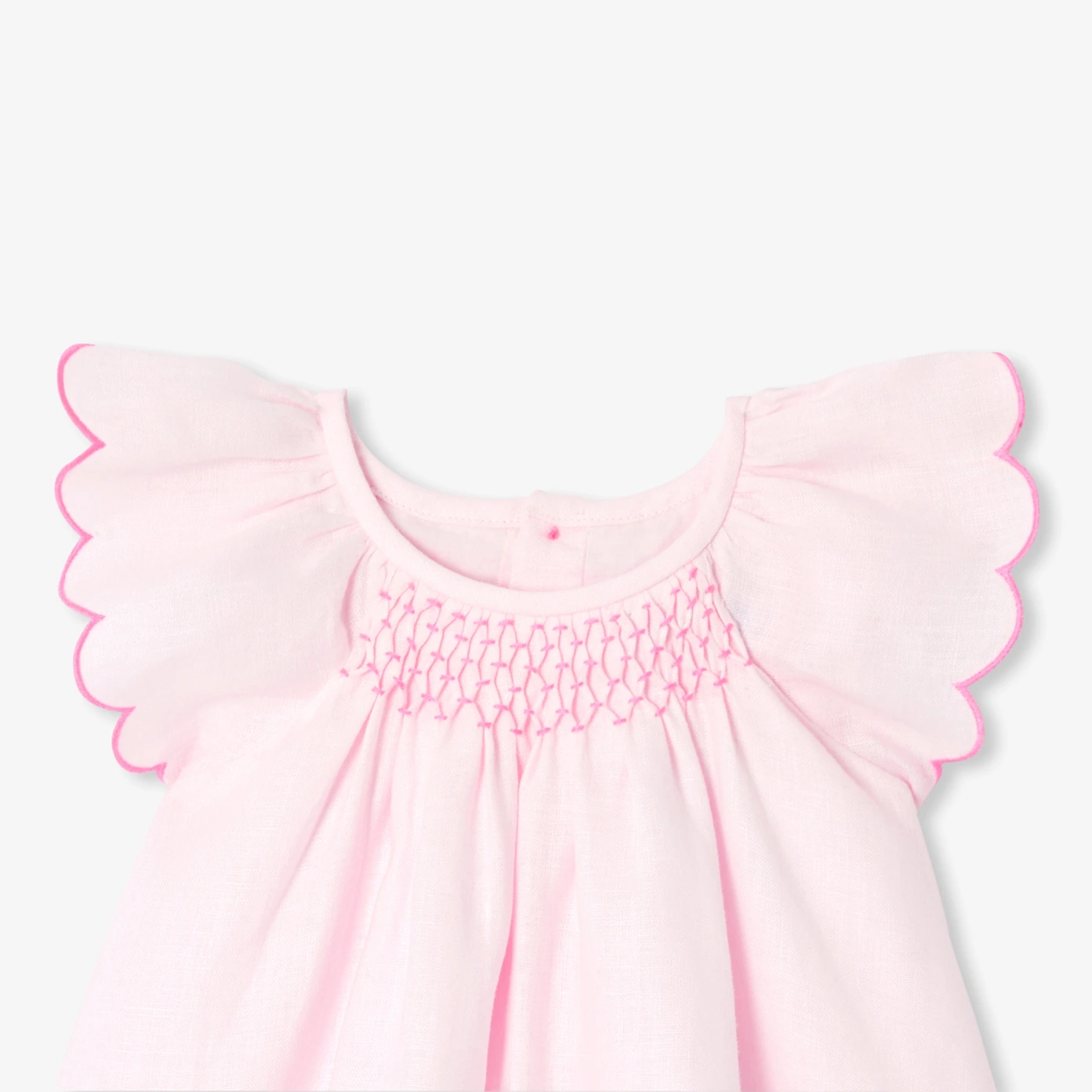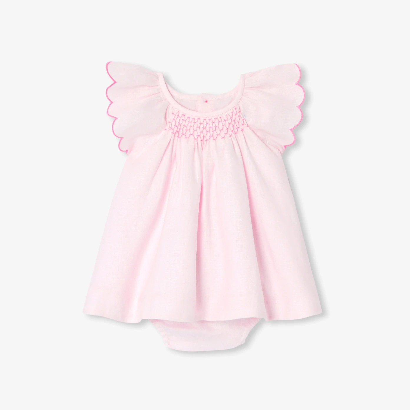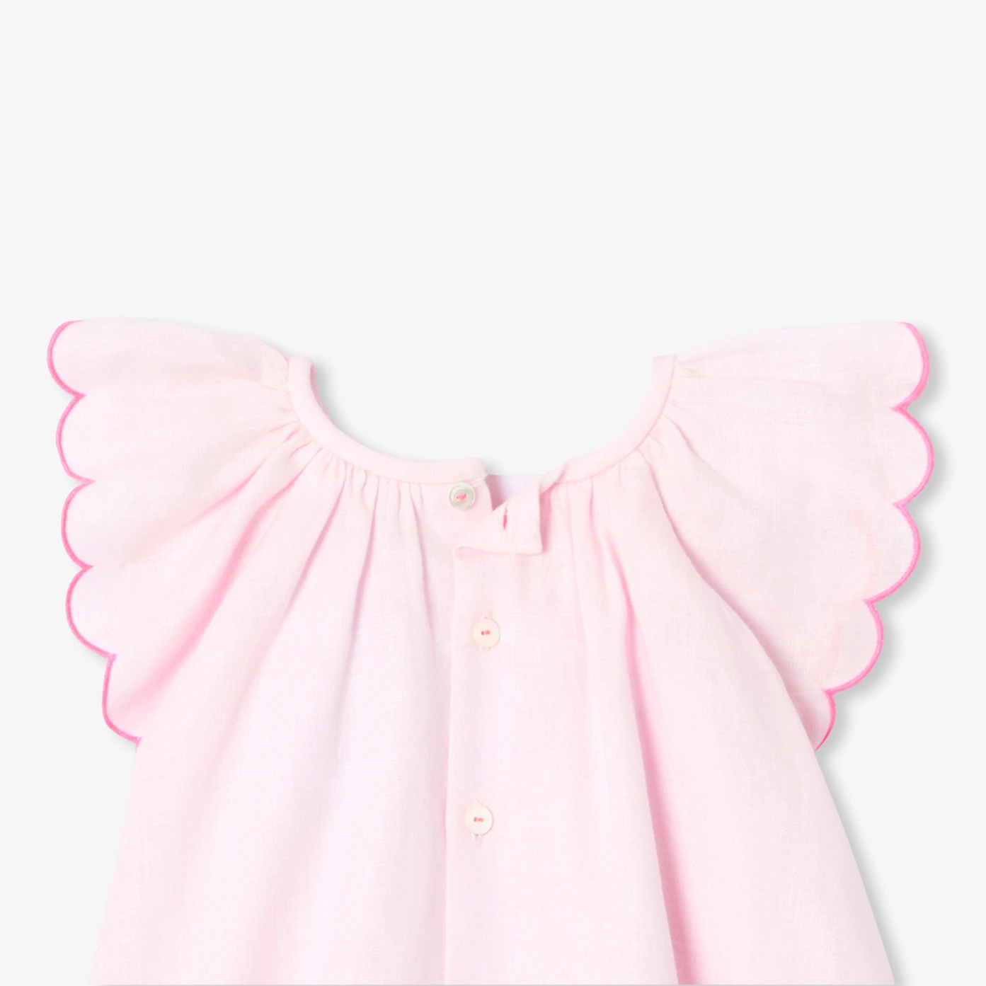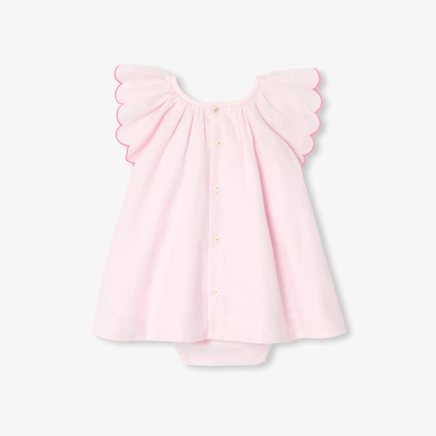 這款優雅的女嬰洋裝,為夏季衣櫥增添現代設計風。採用亞麻材質搭配手工刺繡的前領口,袖口以花瓣剪裁配上粉色包邊縫線點綴,內襯棉質裡布,整體設計精緻細膩。附有同色系鬆緊腰頭內搭褲,是送禮或自用的理想選擇。