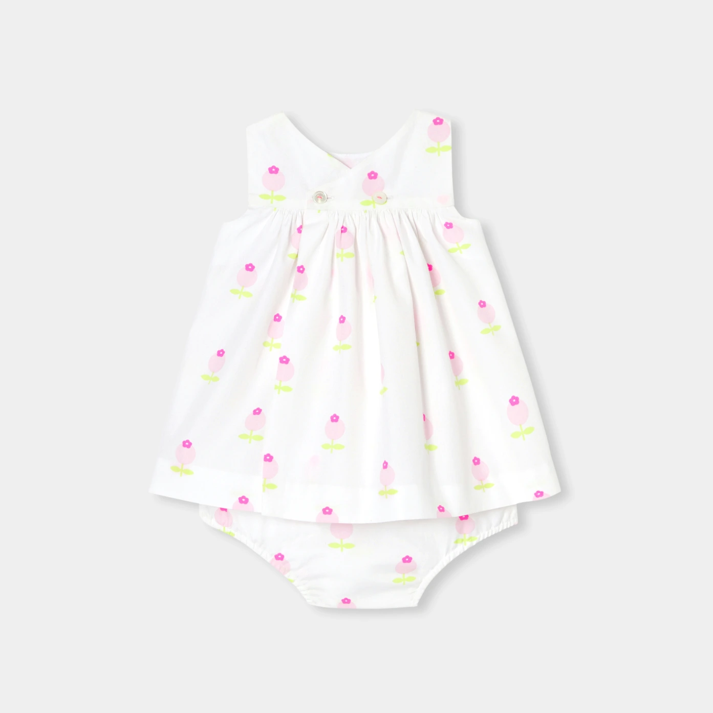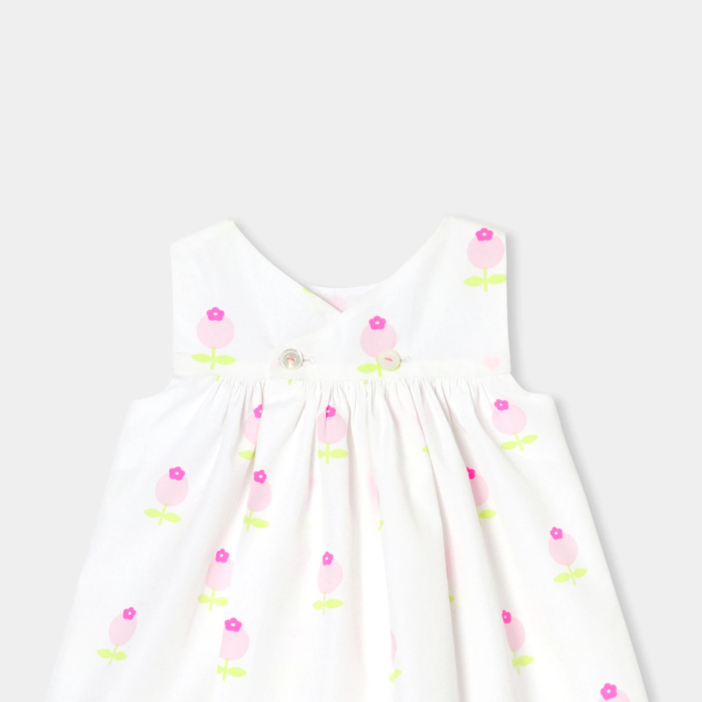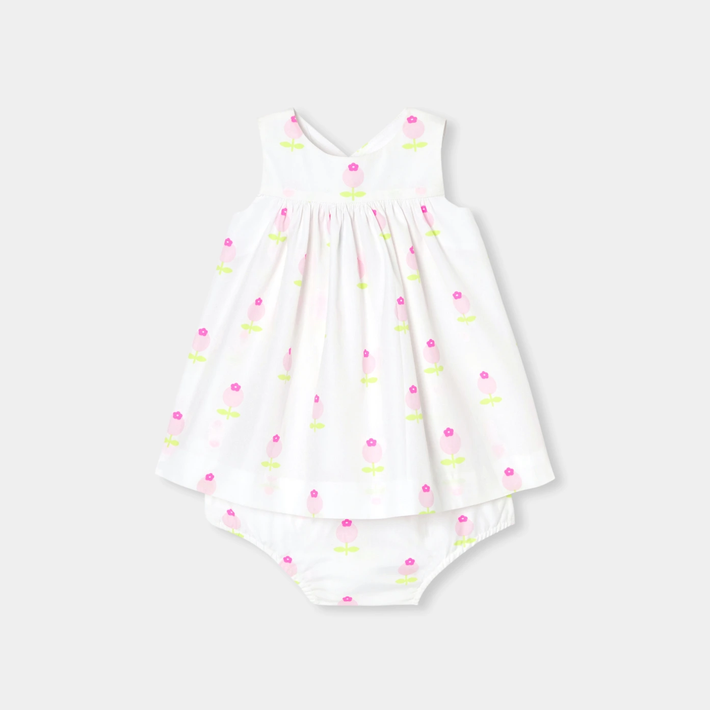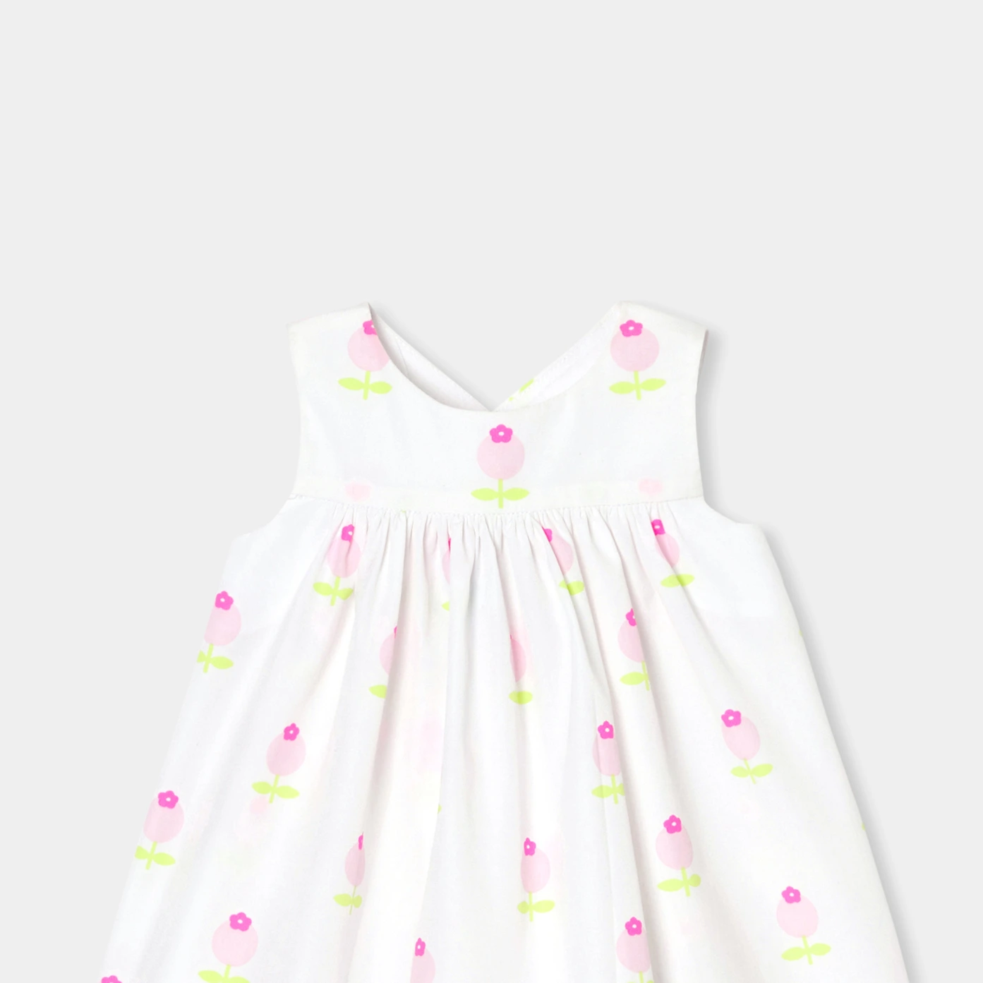 美好的日子即將來臨,伴隨著一件件迷人的新生女嬰洋裝。這款洋裝以柔軟順滑的純棉府綢製成,印上優雅浪漫的花卉圖案,並以細緻的抓皺與交叉背帶設計,營造出唯美造型。春天可搭配針織外套,夏日則可配上一頂可愛的帽子,悠閒漫步於水岸旁。