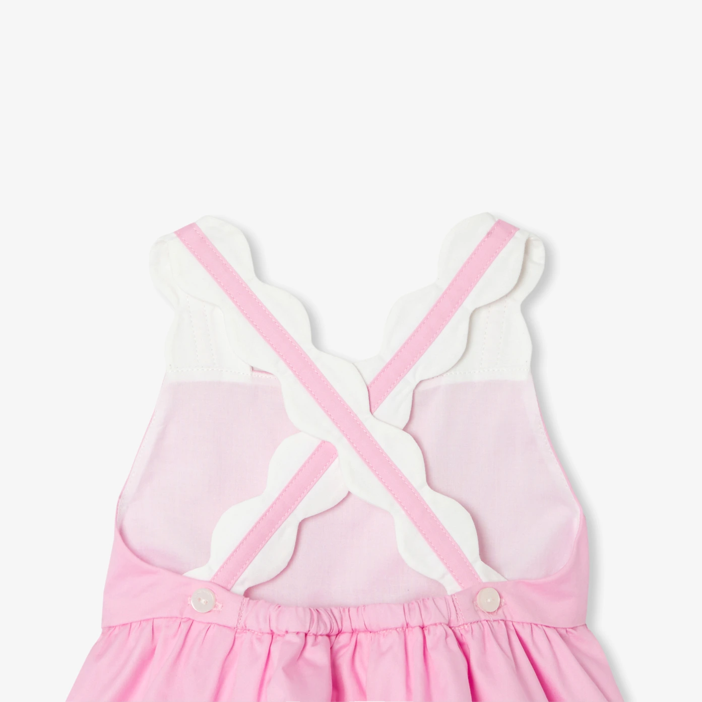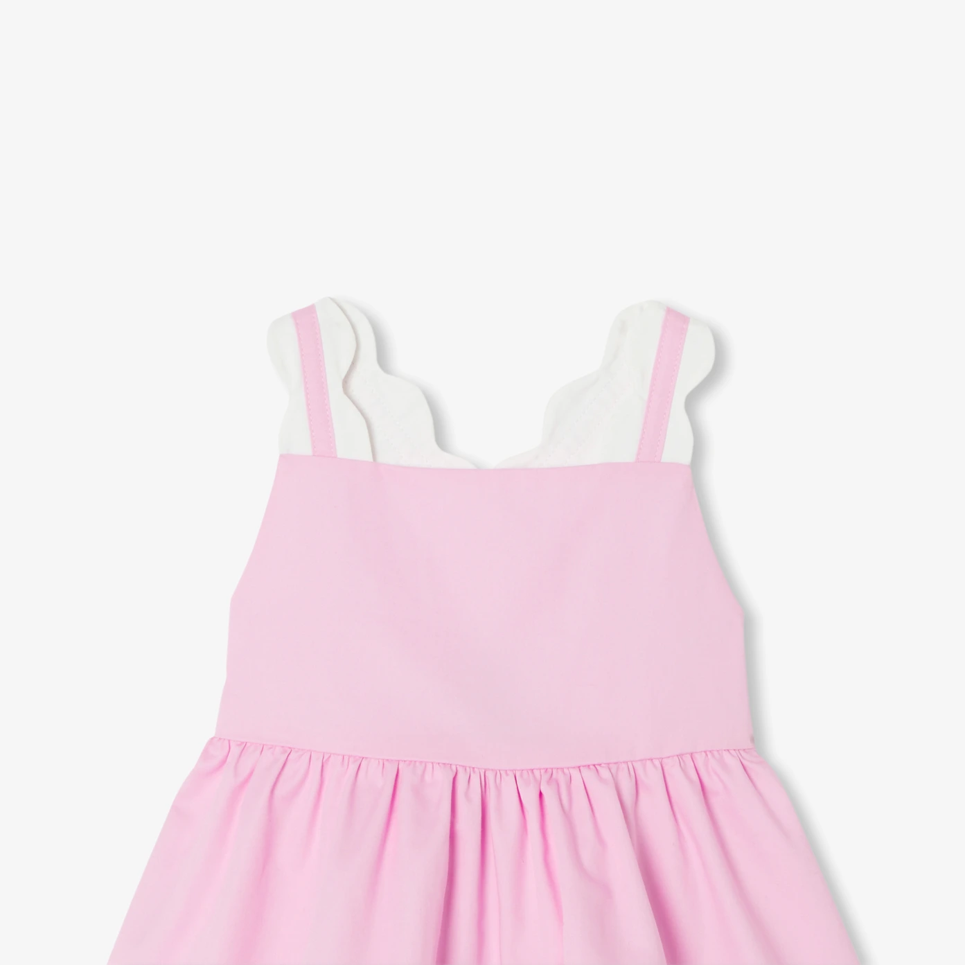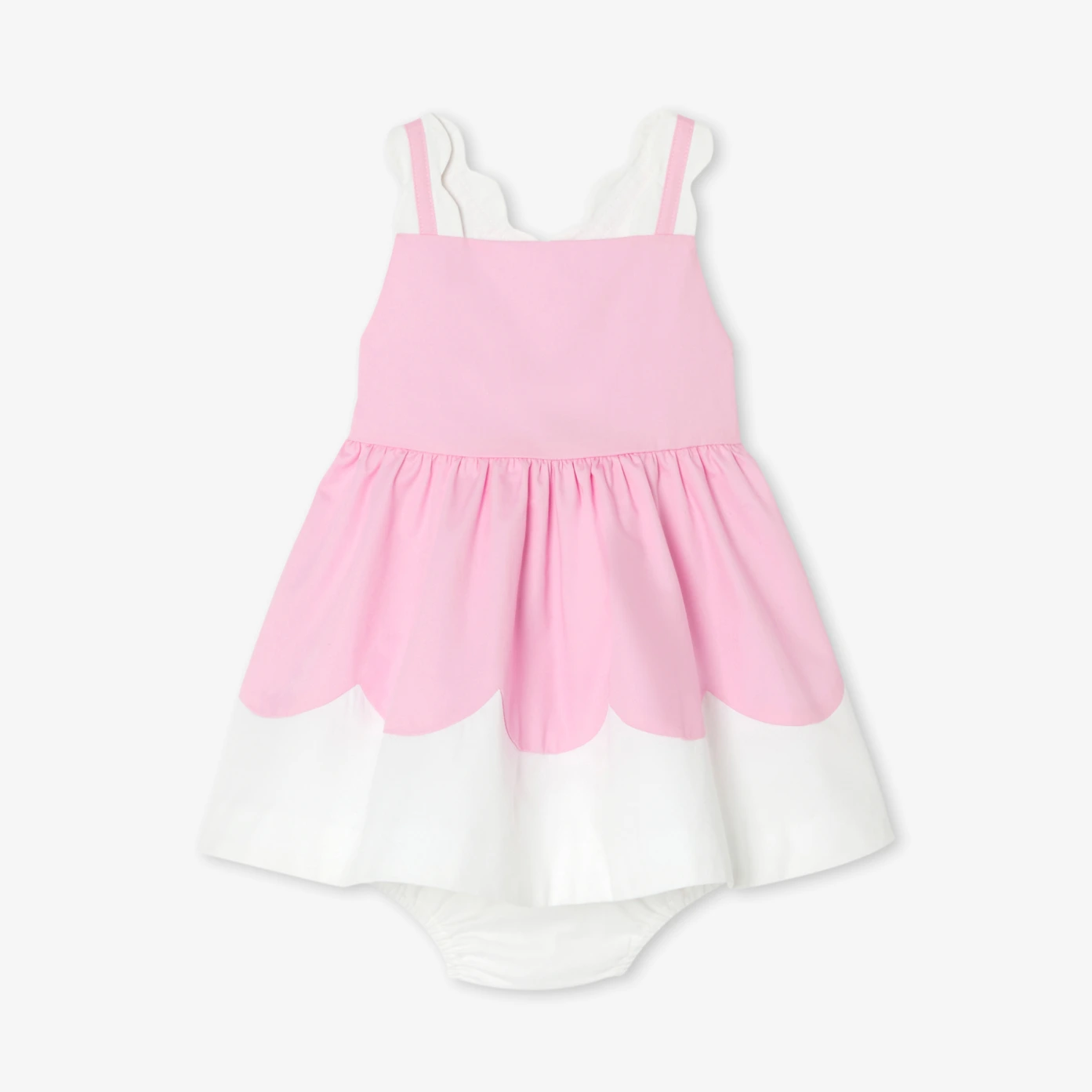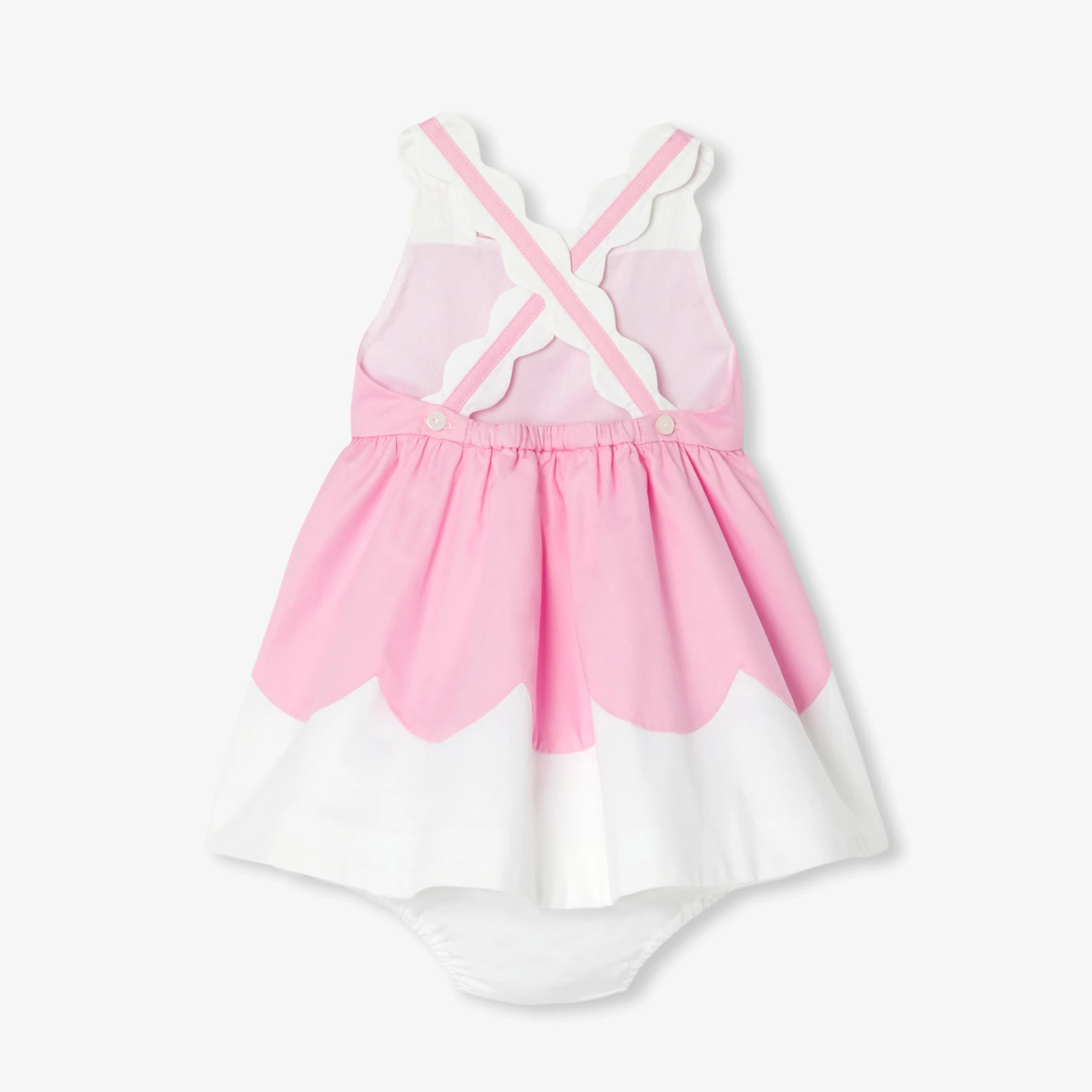 這款女寶寶禮服洋裝以 60 年代高級訂製服精神為靈感,透過精緻的幾何細節展現優雅魅力。專為特殊場合打造,交叉背帶飾以對比色波浪剪裁,裙擺則以撞色波浪邊勾勒俐落外型,演繹現代感十足的法式優雅。搭配涼鞋與帽飾,即可輕鬆打造完美典禮造型。