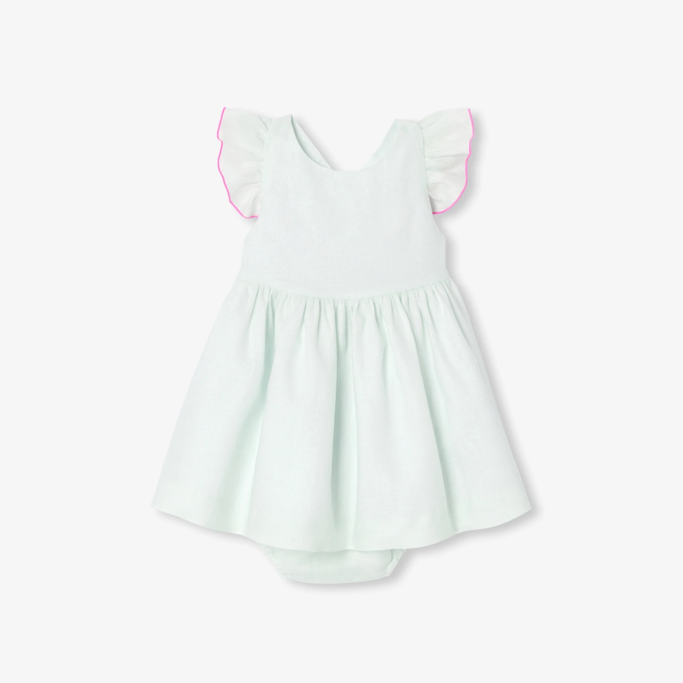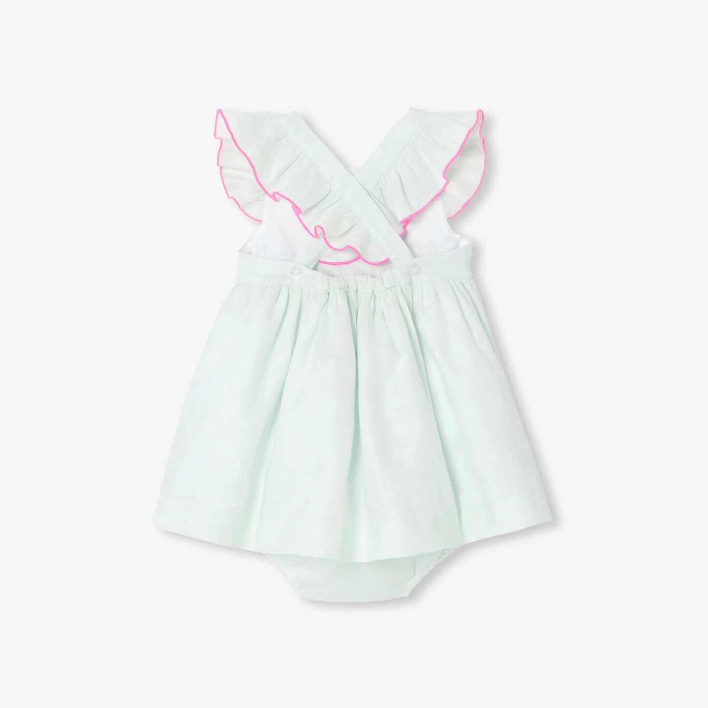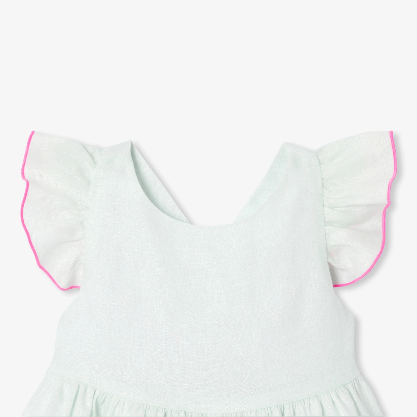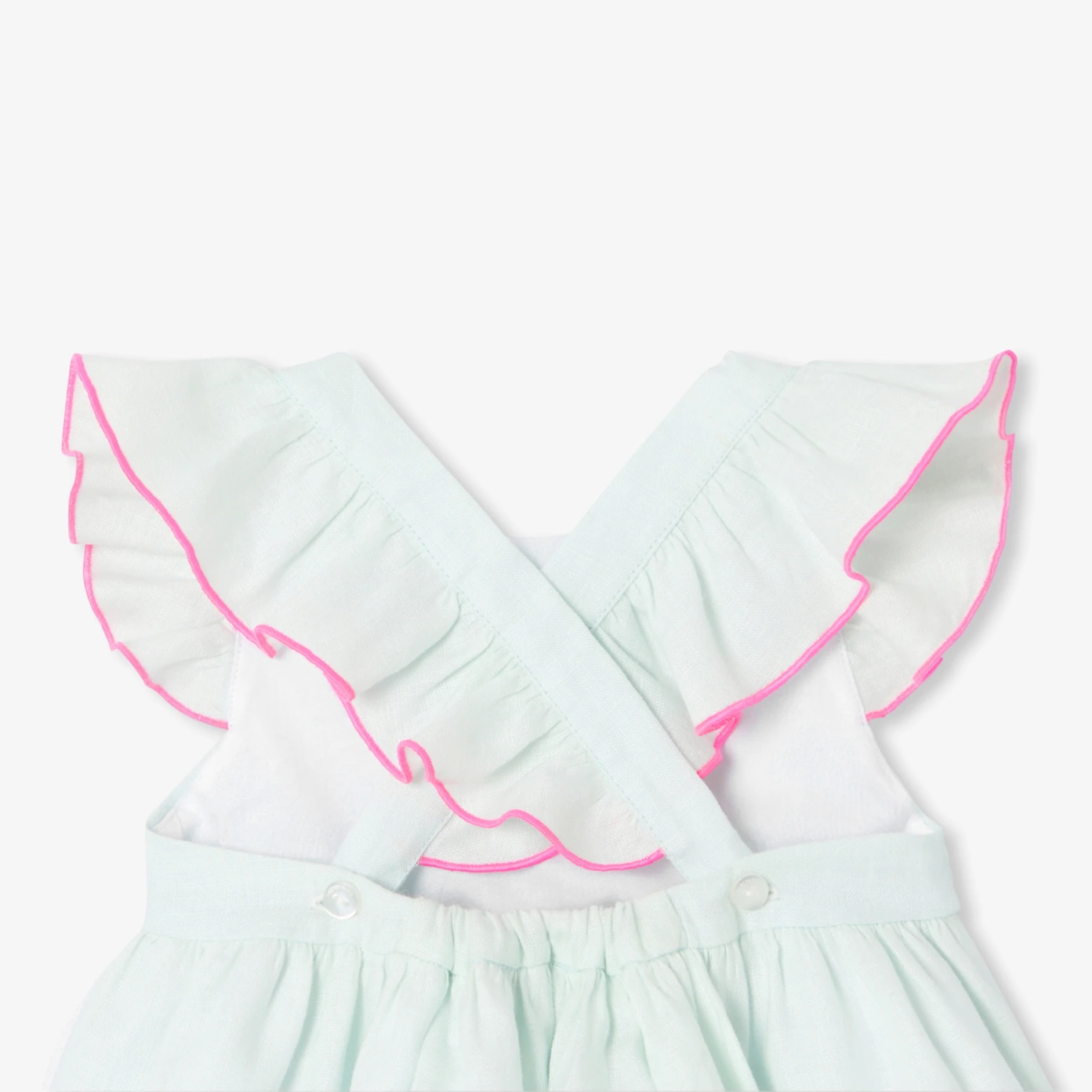 法式浪漫夏日單品,精緻細節盡顯優雅! 這款小女童無袖洋裝 採用細紋棉質平織布,輕盈舒適,適合悶熱夏季。肩部飾有荷葉邊設計,並點綴螢光色刺繡滾邊,細膩優雅。前片經典手工刺繡摺飾,背部則以打褶剪裁呈現靈動外型,搭配彈性束口短褲,打造完美造型。