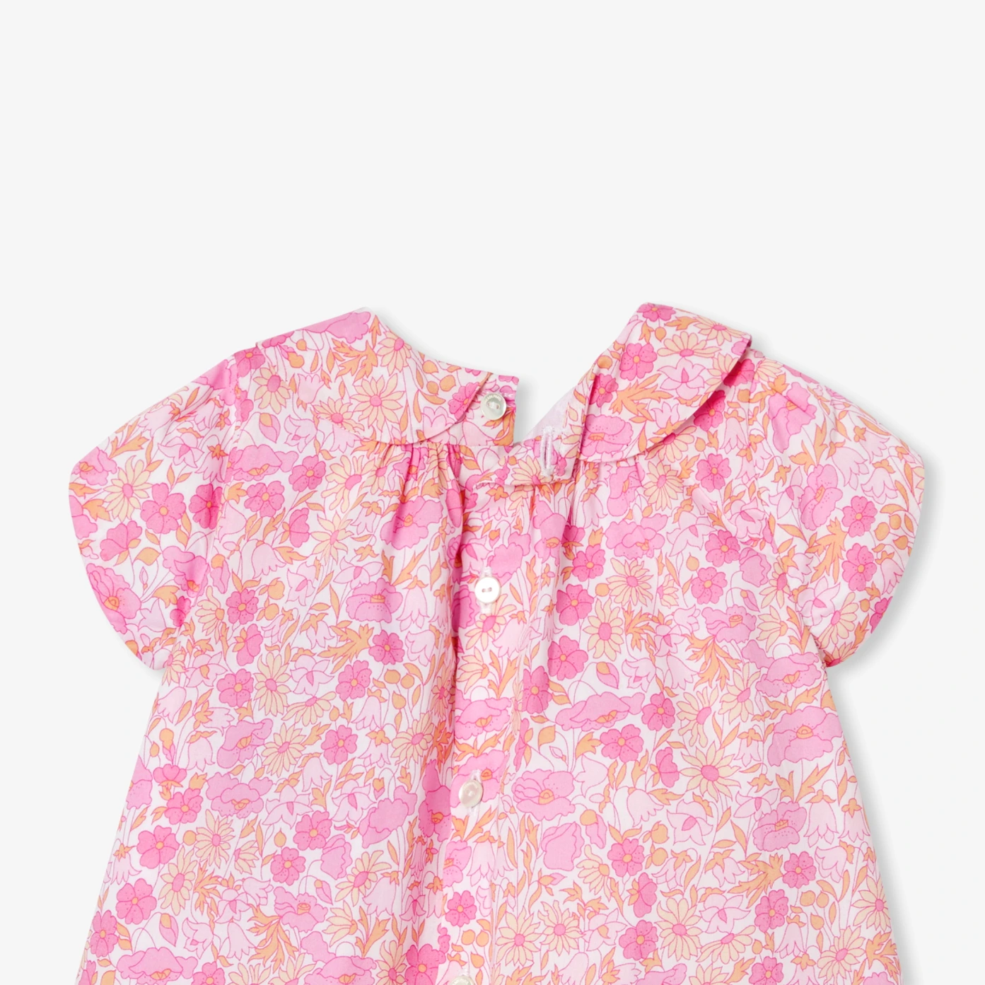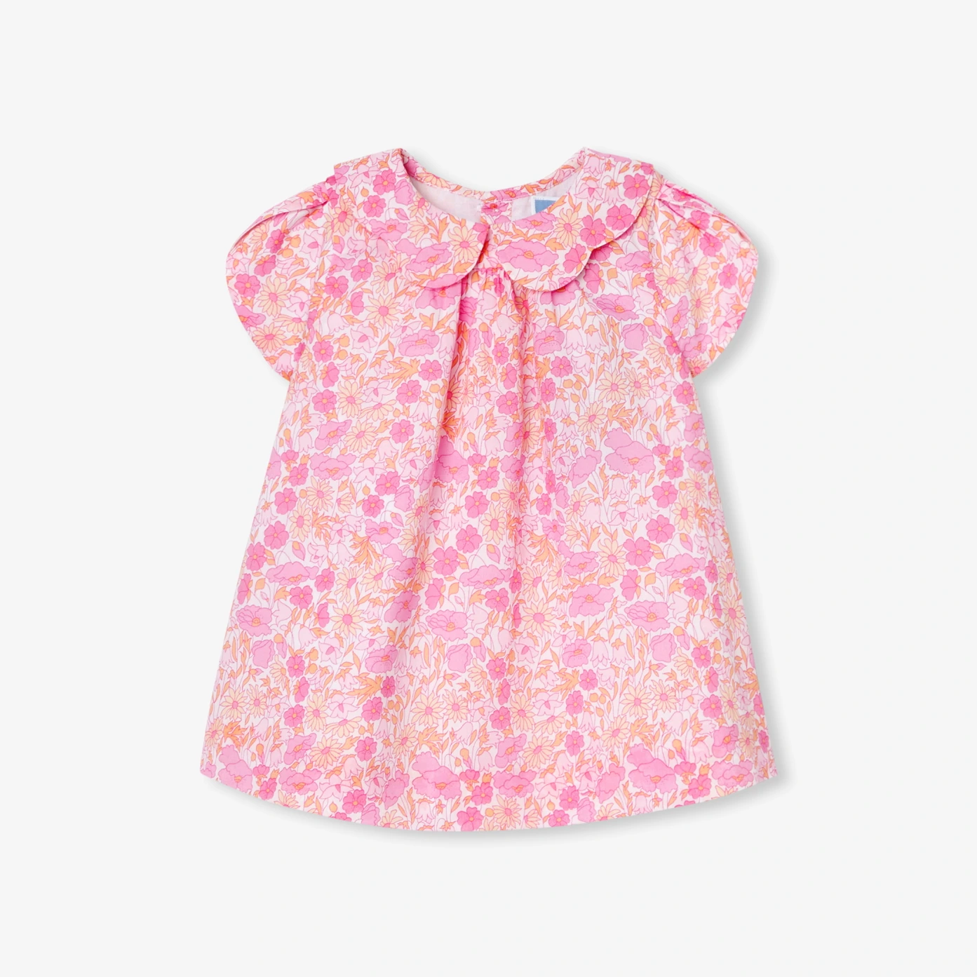 這款Liberty印花新生女洋裝,將夏日的繽紛延續至開學季衣櫥。短泡泡袖與花瓣領剪裁相互呼應,搭配活潑的打褶設計與明亮色彩,展現優雅法式風格。洋裝內裡鋪有親膚棉質巴里紗,背後飾有天然珠母貝鈕釦,方便穿脫。秋季可搭配同系列開襟衫,打造現代俐落造型,是值得珍藏的誕生禮推薦。