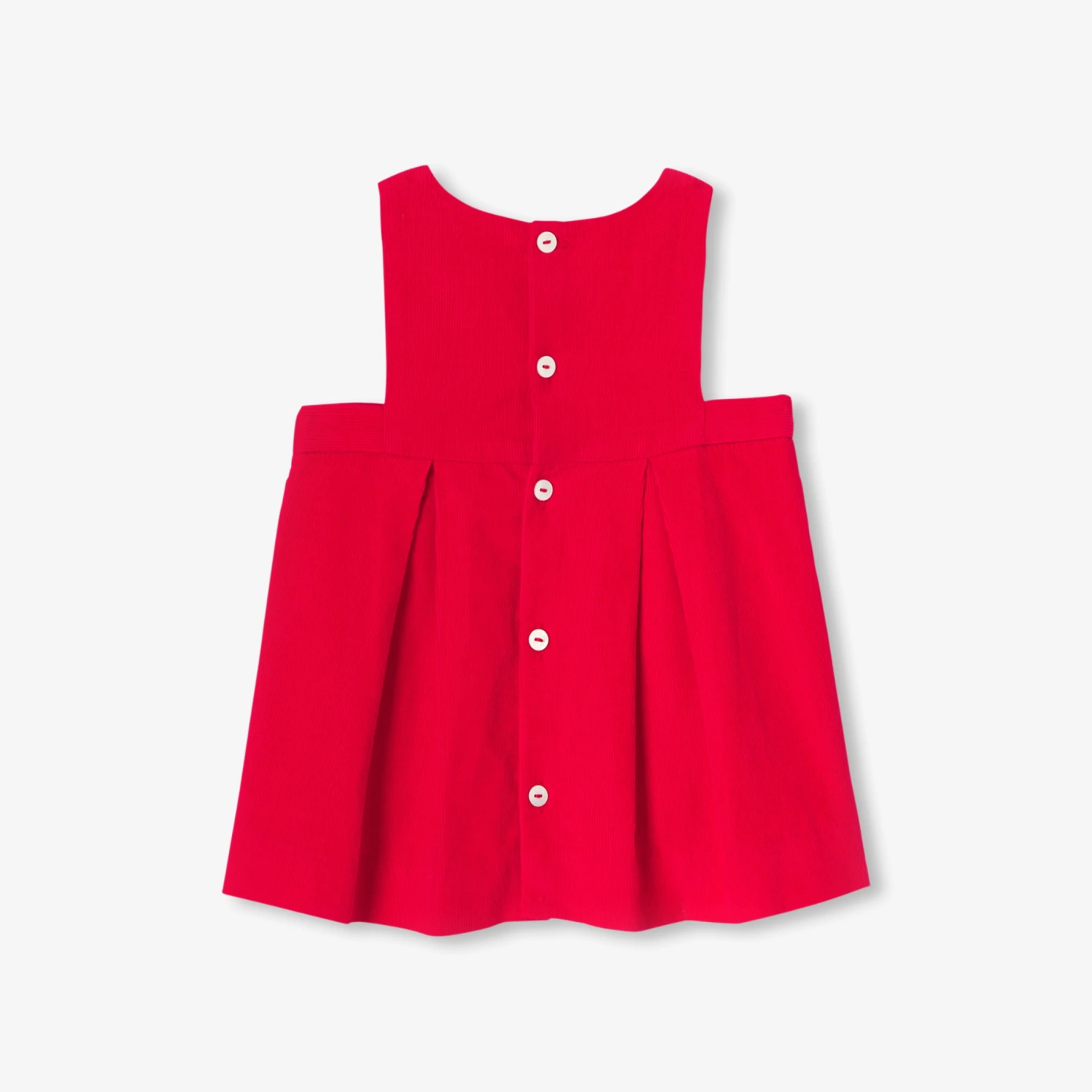 這款經典新生女嬰背心裙經重新設計,展現現代女孩風格。選用亮麗紅色柔軟天鵝絨製成,腰間飾有優雅花瓣與摺褶細節,舒適棉質巴里紗內裡,背面採用珍珠母貝釦設計,方便穿脫。無論是日常托嬰穿搭或出席重要場合,搭配包屁衣與開襟線衫都能展現溫柔氣質。
