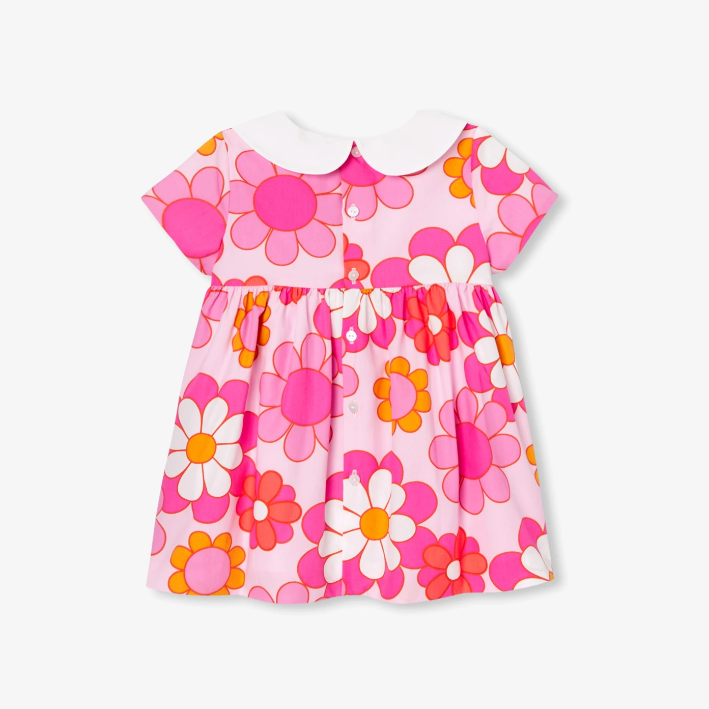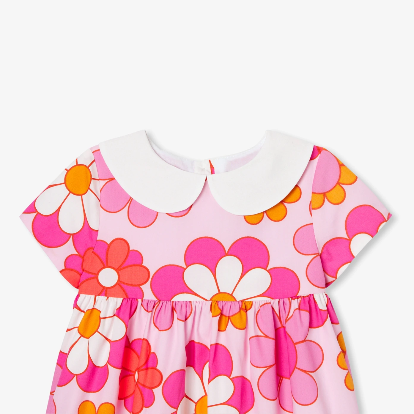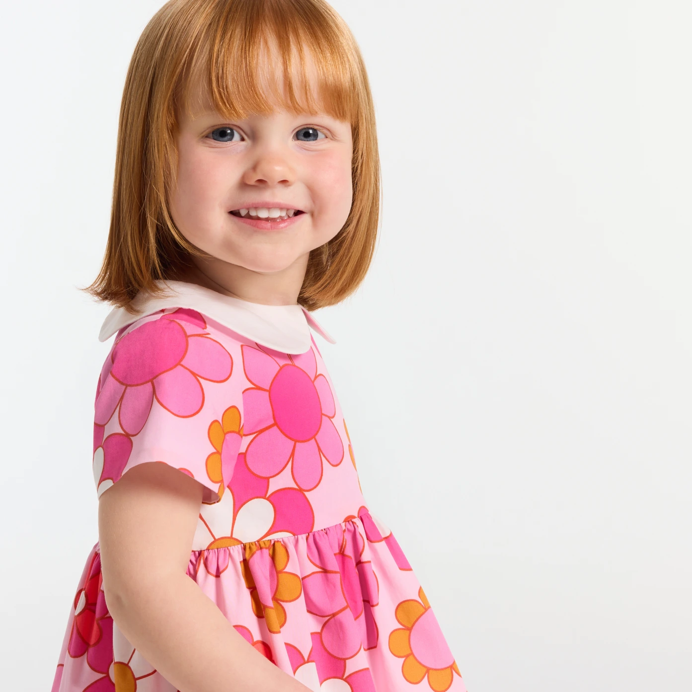 充滿詩意的花卉印花搭配撞色彼得潘領,這款女寶寶洋裝以復古美學重現於 Jacadi 系列中。短袖設計,腰部打褶營造優雅蓬度,無論是夏末外出或開學日常穿搭皆宜,完美適應每一個重要時刻。