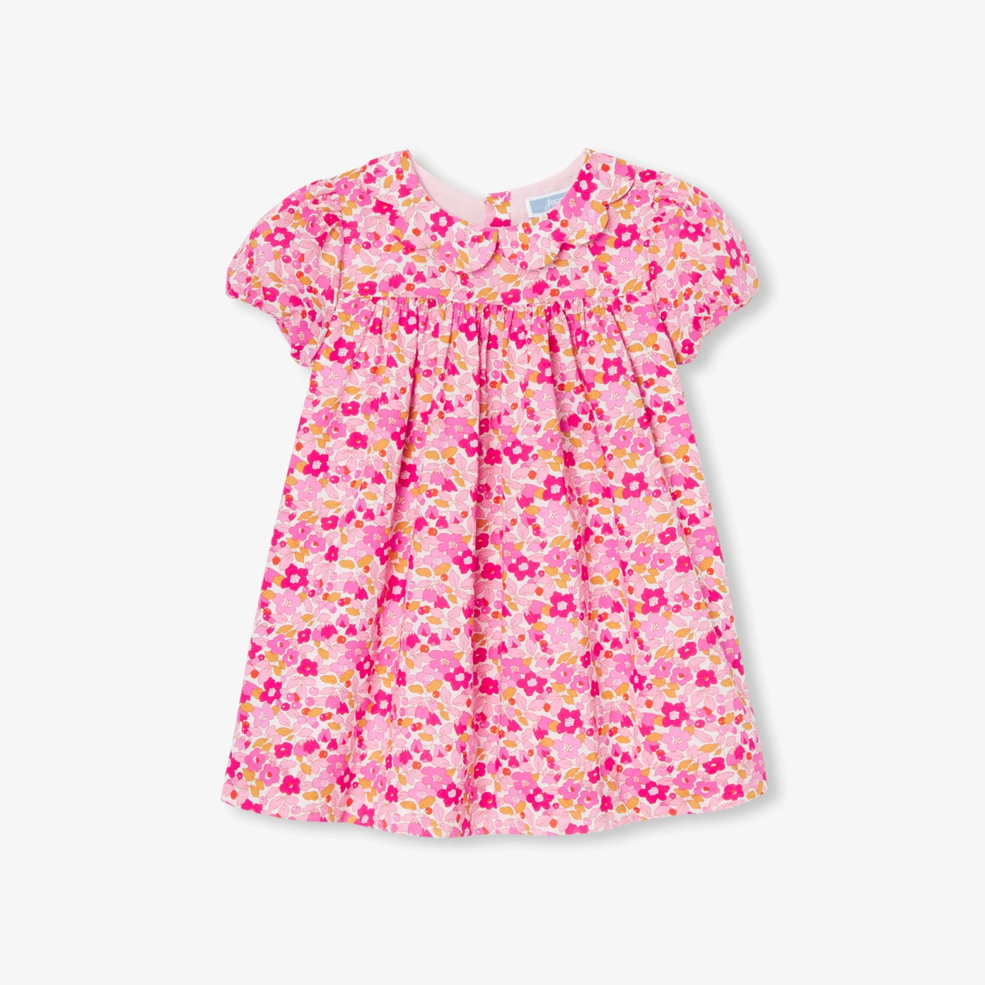 這款女寶寶洋裝彷彿將人帶入一個浪漫繽紛的夏末世界。選用柔軟輕盈的 Liberty 印花布料,搭配花瓣領、泡泡袖與自然抓皺的高腰線,整體造型優雅迷人。富有藝術感的色彩與法式風格,無論是搭配嬰兒連身裝或粉紅色開襟衫,都是生日派對或開學季的亮眼裝扮。