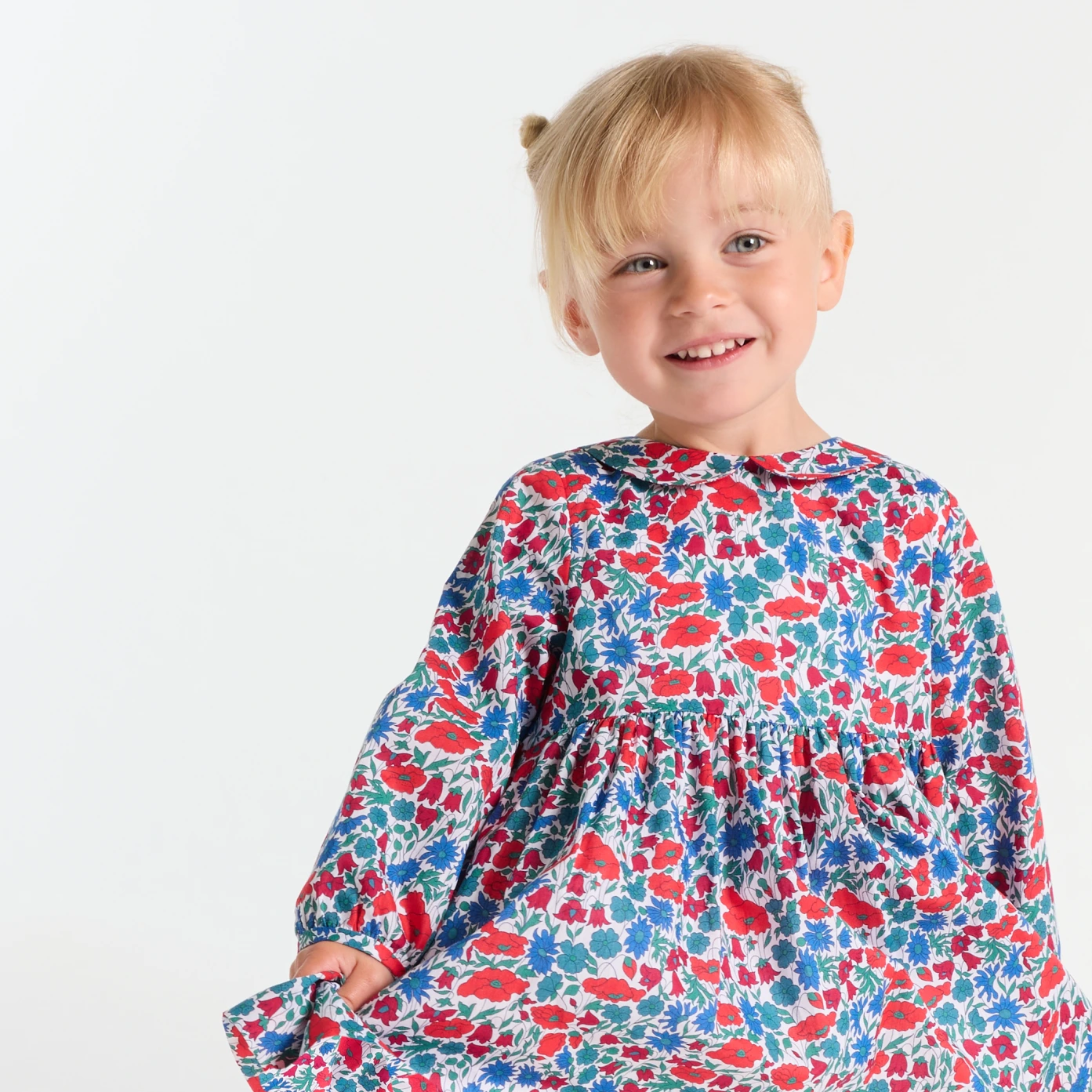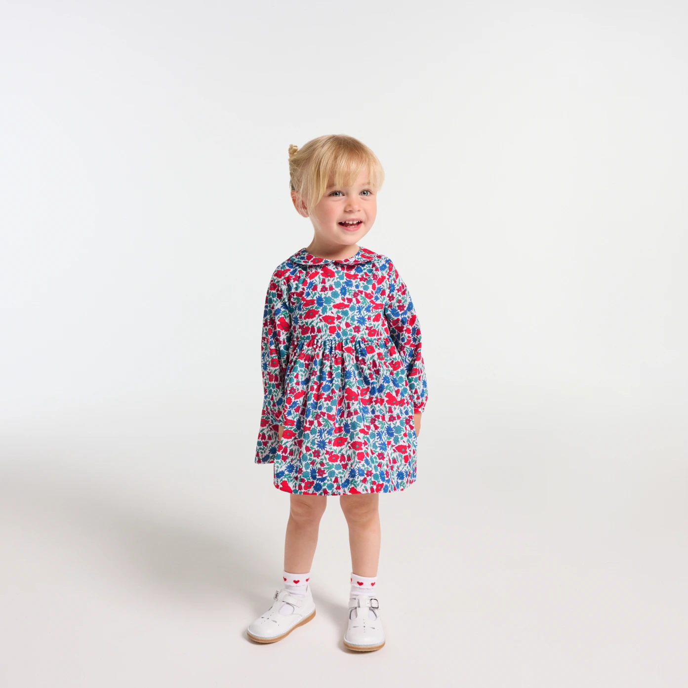這款充滿法式魅力的Liberty布料女寶寶洋裝,帶你進入一個詩意的世界,為開學季增添優雅。搭配可愛的彼得潘領和精緻的腰部皺褶設計,營造出蓬鬆感,這款剪裁精美的洋裝搭配素色緊身褲和瑪莉珍鞋,呈現出純粹的法式風格。