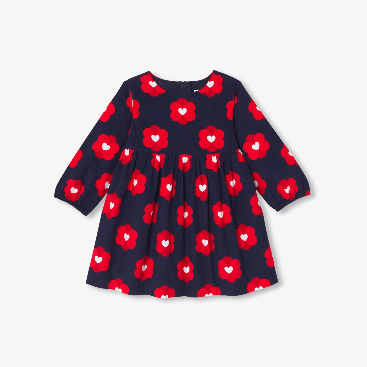這款經典女寶寶細條絨洋裝展現復古風格,以充滿童趣的花卉印花點綴,腰間剪接與細緻打褶營造出優雅立體感,提升整體造型層次。內襯輕柔棉紗布,背面隱藏式拉鍊方便穿脫,是開學季搭配素色褲襪與短靴的理想選擇。