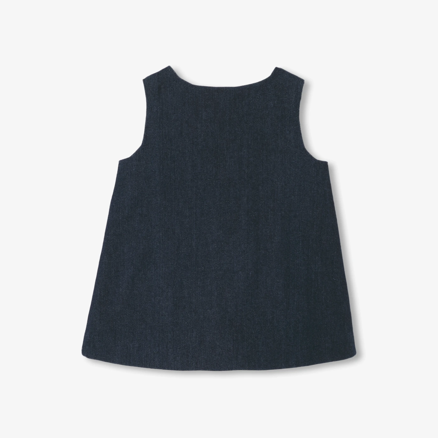 經典不敗的新生女背心洋裝,以牛仔布面料呈現現代感造型。內裡採用柔軟舒適的棉質薄紗,裙身設有花瓣狀拼接口袋,並於肩部設計品牌標誌性按釦,細節滿分。可搭配荷葉邊包屁衣與愛心圖案開襟衫,打造優雅巴黎風格造型。