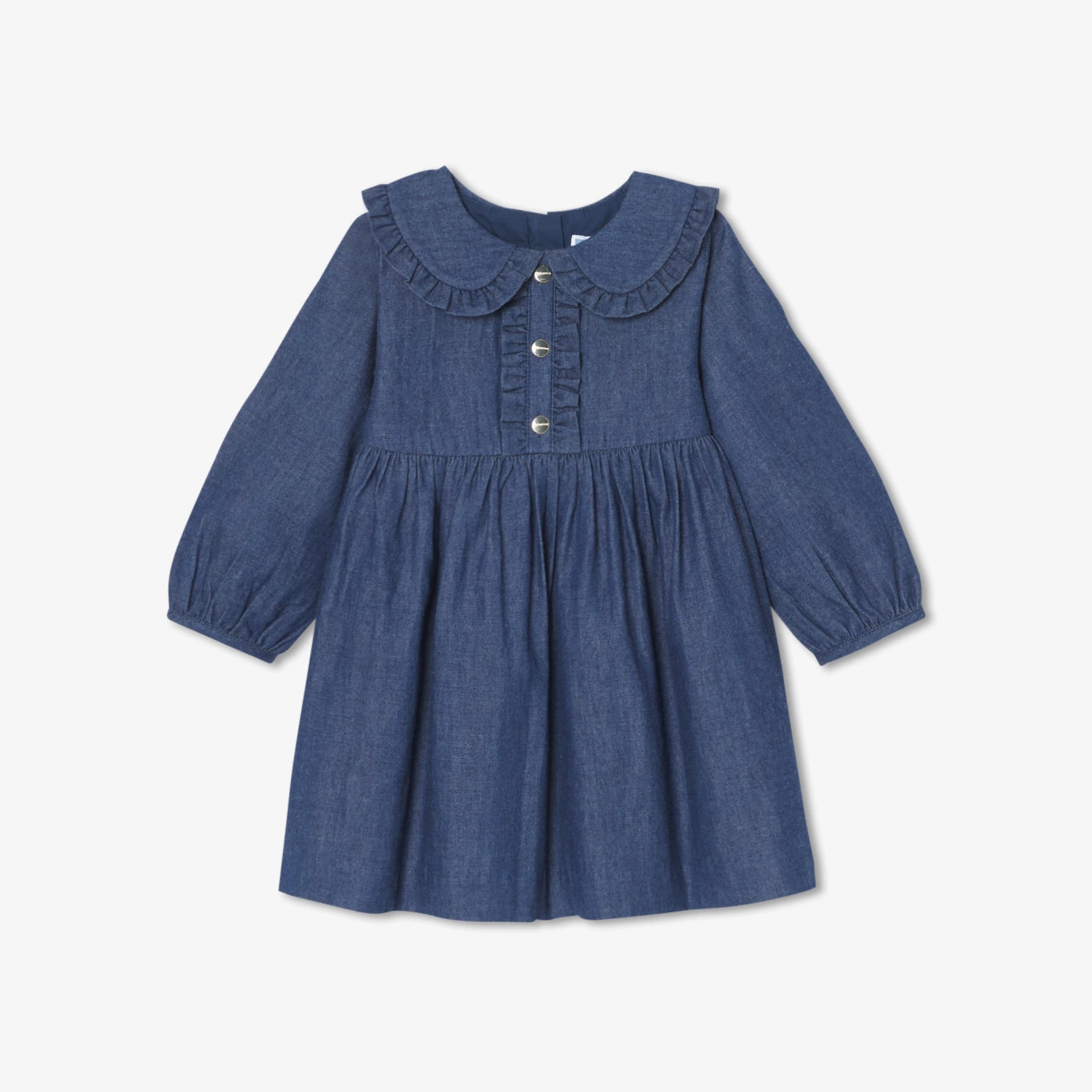 這款經典不敗的女寶寶牛仔洋裝,以輕盈柔軟的牛仔布重新詮釋秋日風格。優雅的荷葉高領搭配假門襟設計,收褶腰身與對比色滾邊細節,展現細膩工藝感。可搭配褲襪與瑪莉珍鞋,輕鬆打造都會學院風造型。