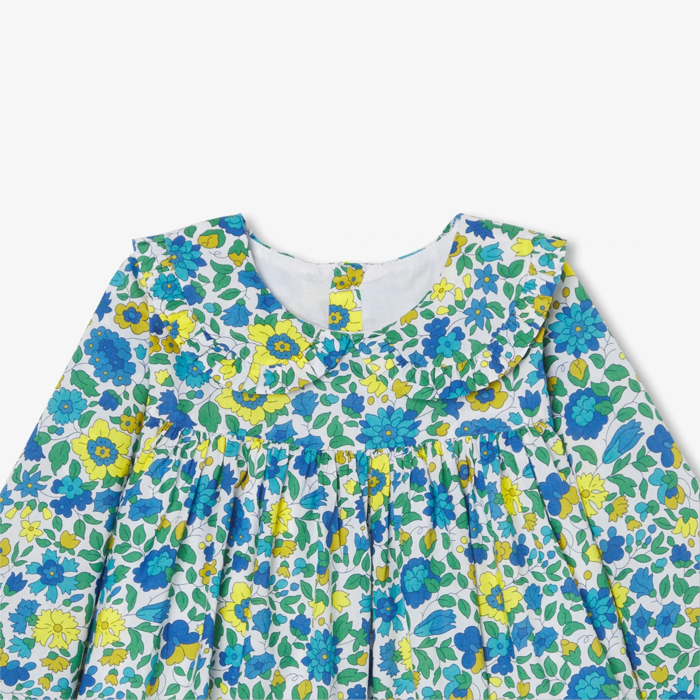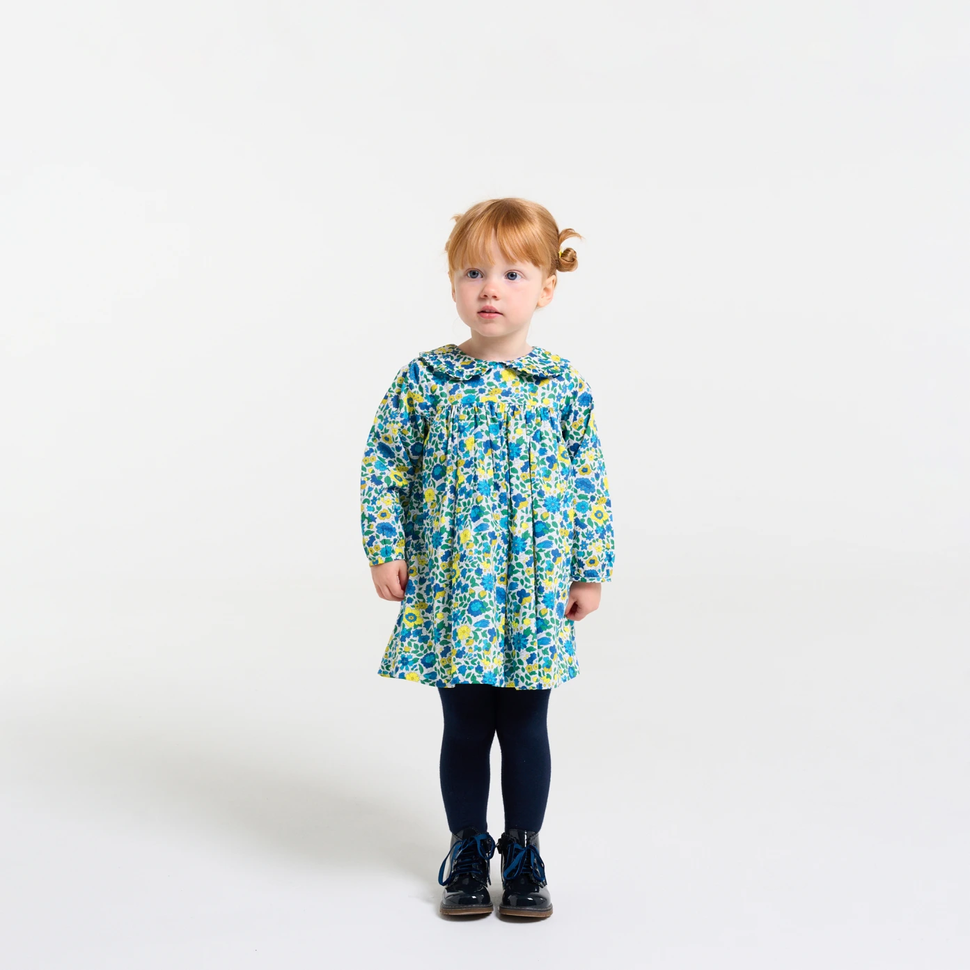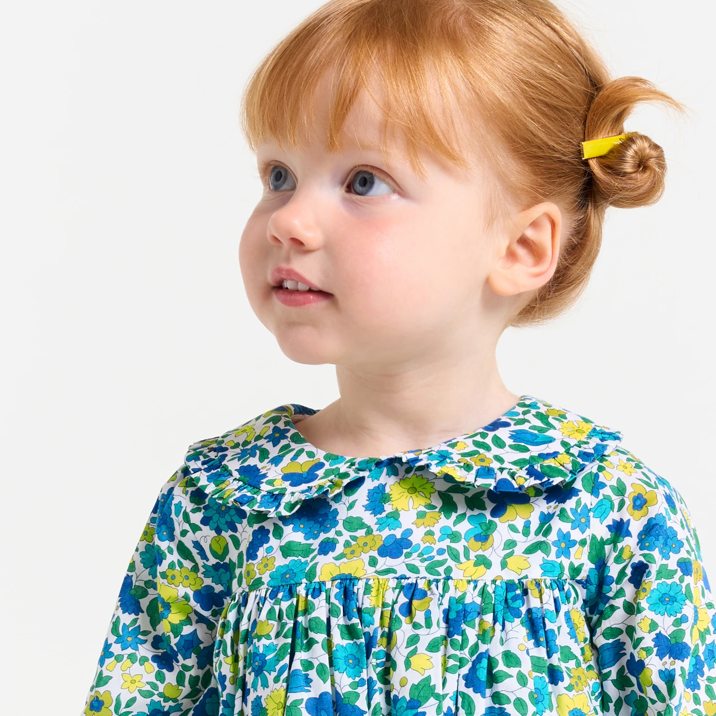 Jacadi 經典的 Liberty 印花洋裝,以秋冬專屬的天鵝絨面料優雅登場。搭配荷葉邊彼得潘領、微高腰細褶設計與束口袖剪裁,完美演繹法式精緻花卉風格。內襯柔軟純棉薄紗,適合搭配英倫風大衣,為造型增添溫柔且高雅的秋日氛圍。