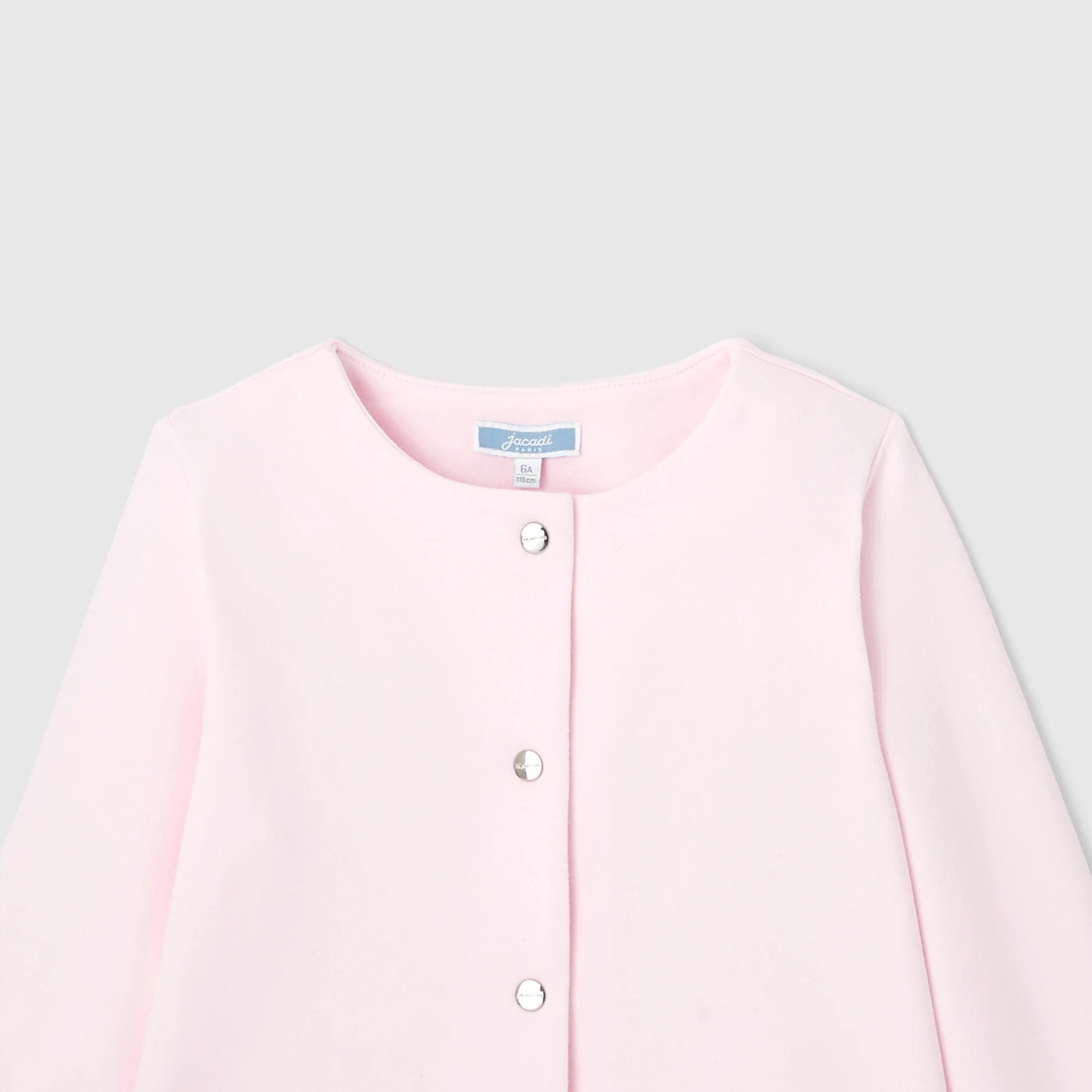 這款女孩開襟外套選用有機棉製成,內裡刷毛設計,柔軟舒適又保暖。簡約俐落的剪裁搭配波浪形下擺,增添優雅細節,正面壓釦開合方便穿脫,輕鬆搭配T恤或襯衫,成為四季皆宜的衣櫥必備單品。