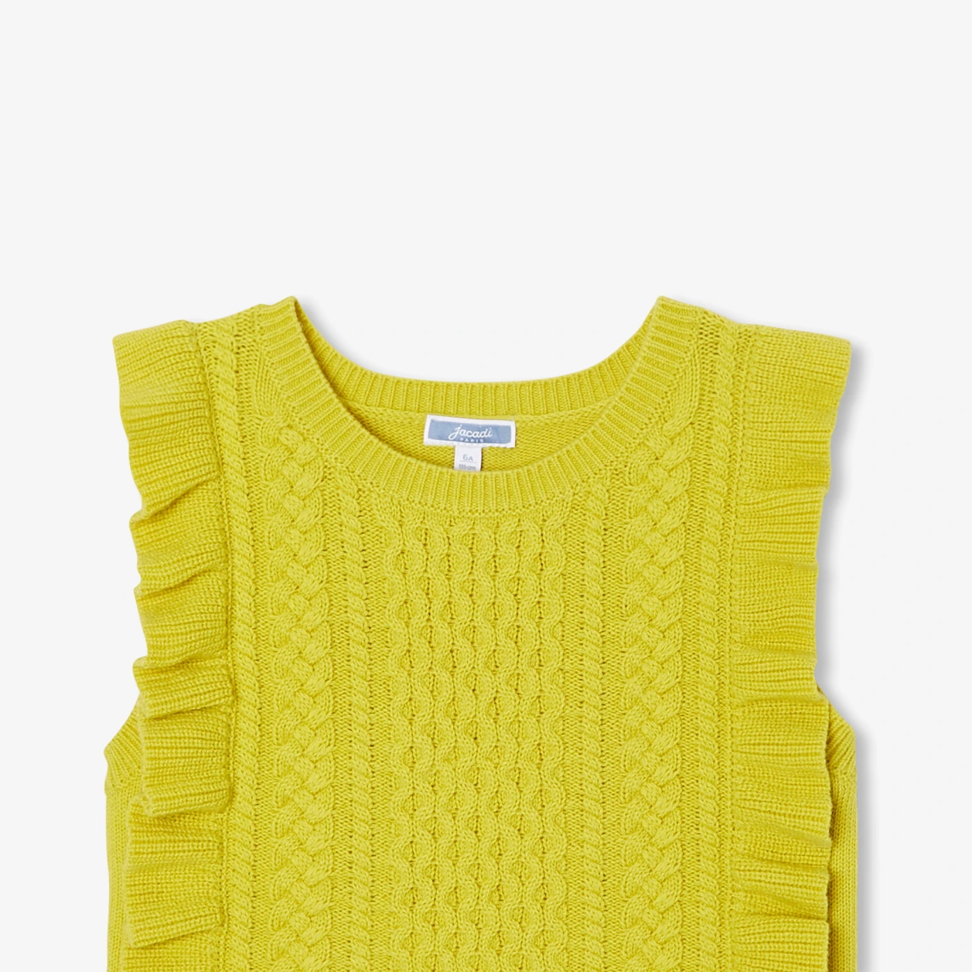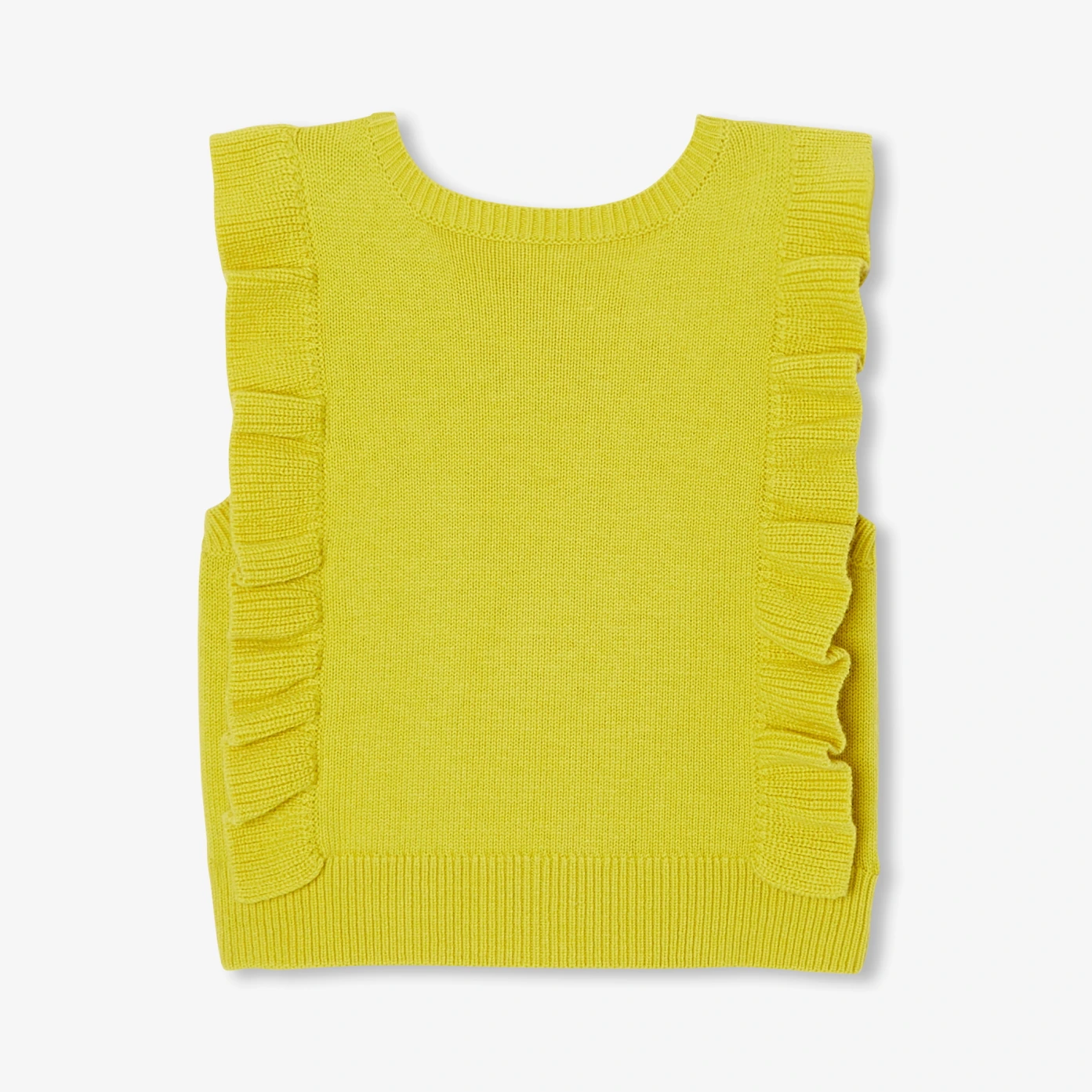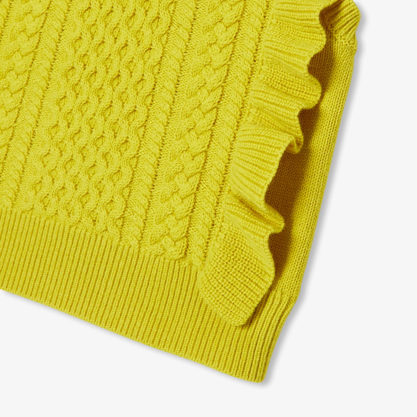 這款大女童毛線背心在這個秋冬季展現出更加時尚和浪漫的一面,選用了非常現代的色彩設計。靈感源自愛爾蘭毛衣的經典編織圖案,前片的麻花織紋和精美的荷葉邊肩口設計,使這款毛衣充滿活力。搭配T恤、短褲或寬褲,展現出獨具特色的秋冬造型。