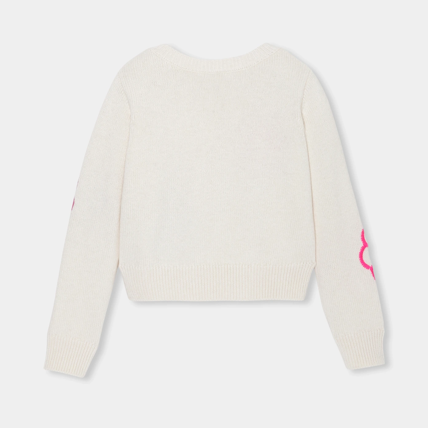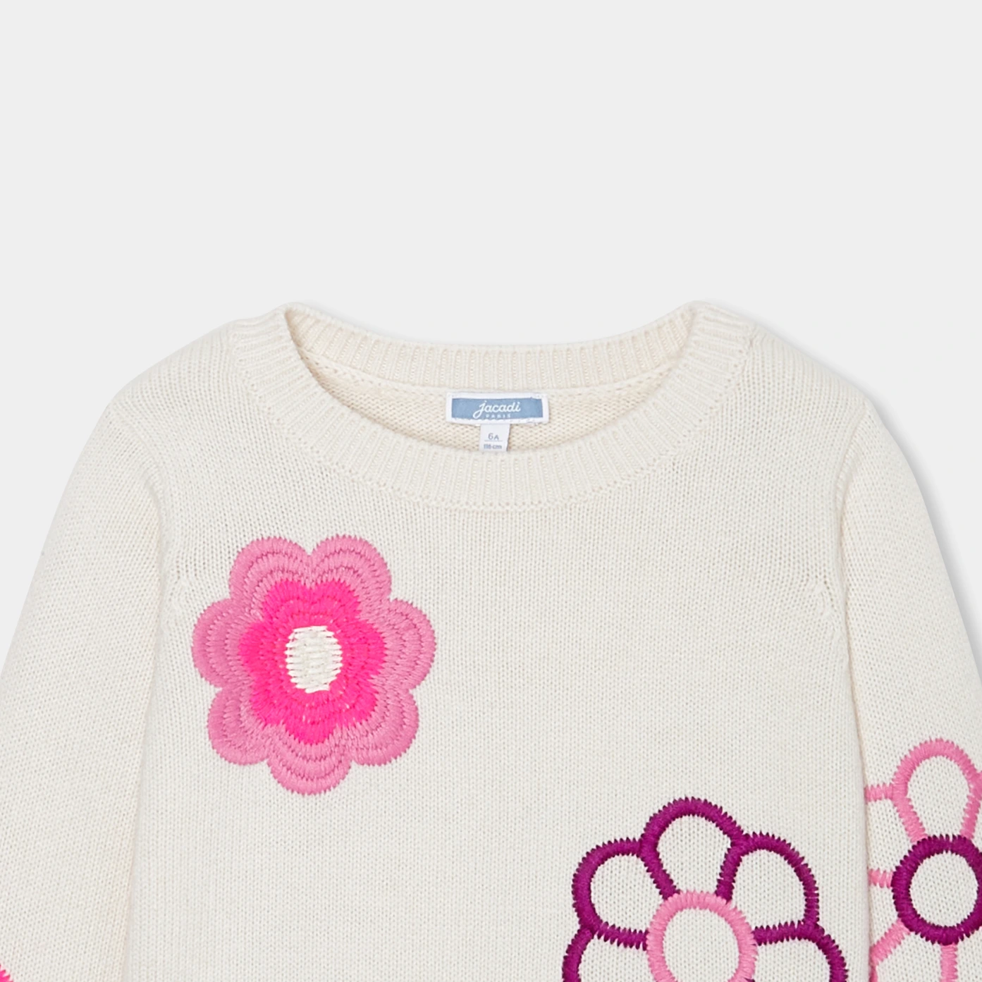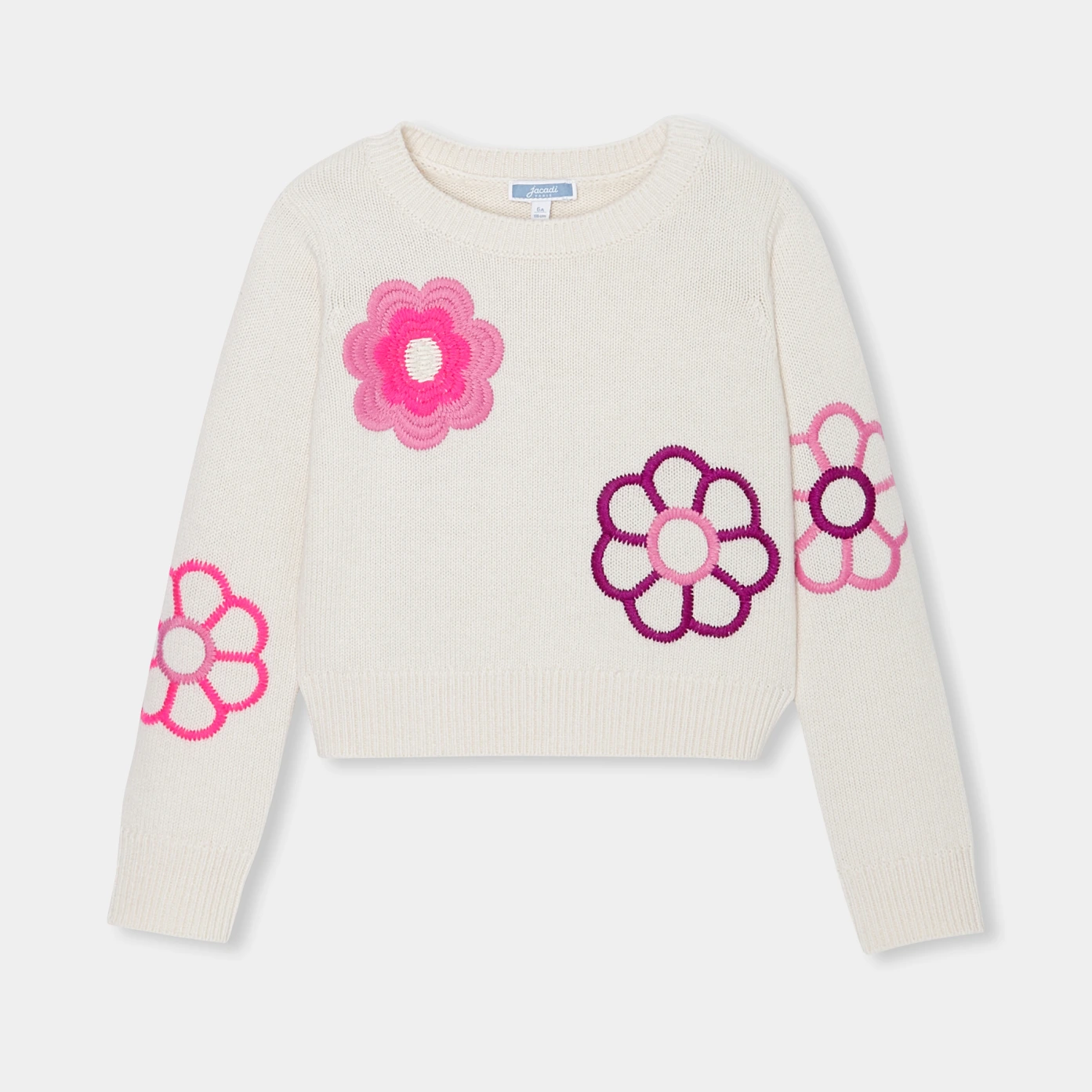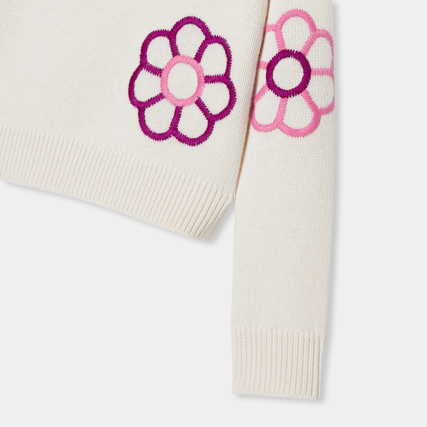 這款女孩毛衣以短版剪裁與繡花設計,富有現代感。搭配寬版白色長褲與運動鞋,呈現出時尚都會的休閒風格。女孩一定會愛上這款毛衣的繽紛花卉圖案及友善環境羊毛的柔軟質感。