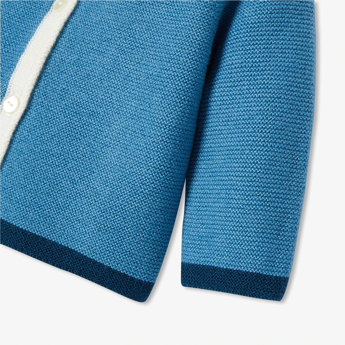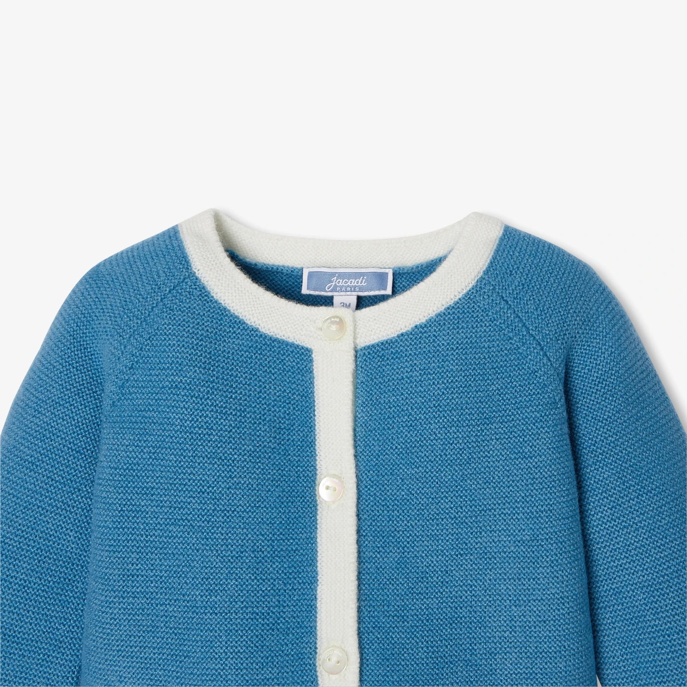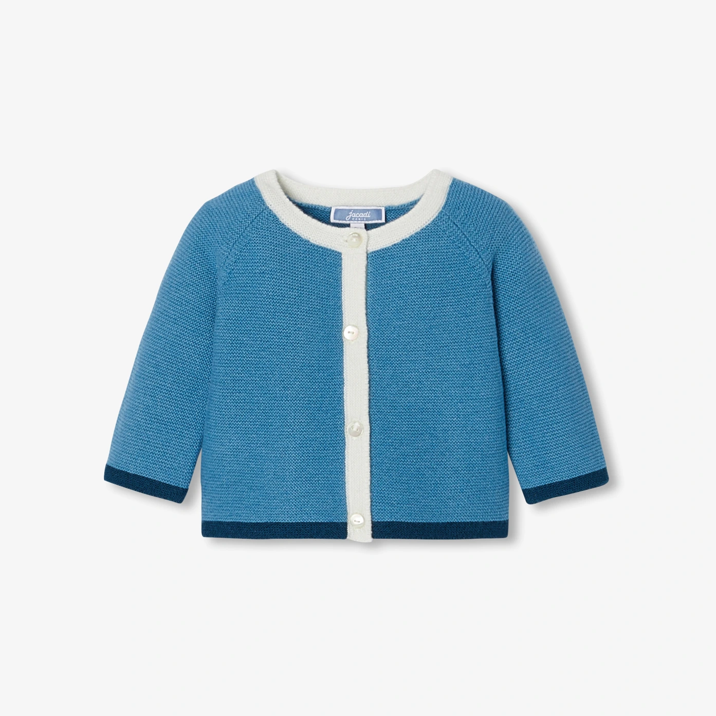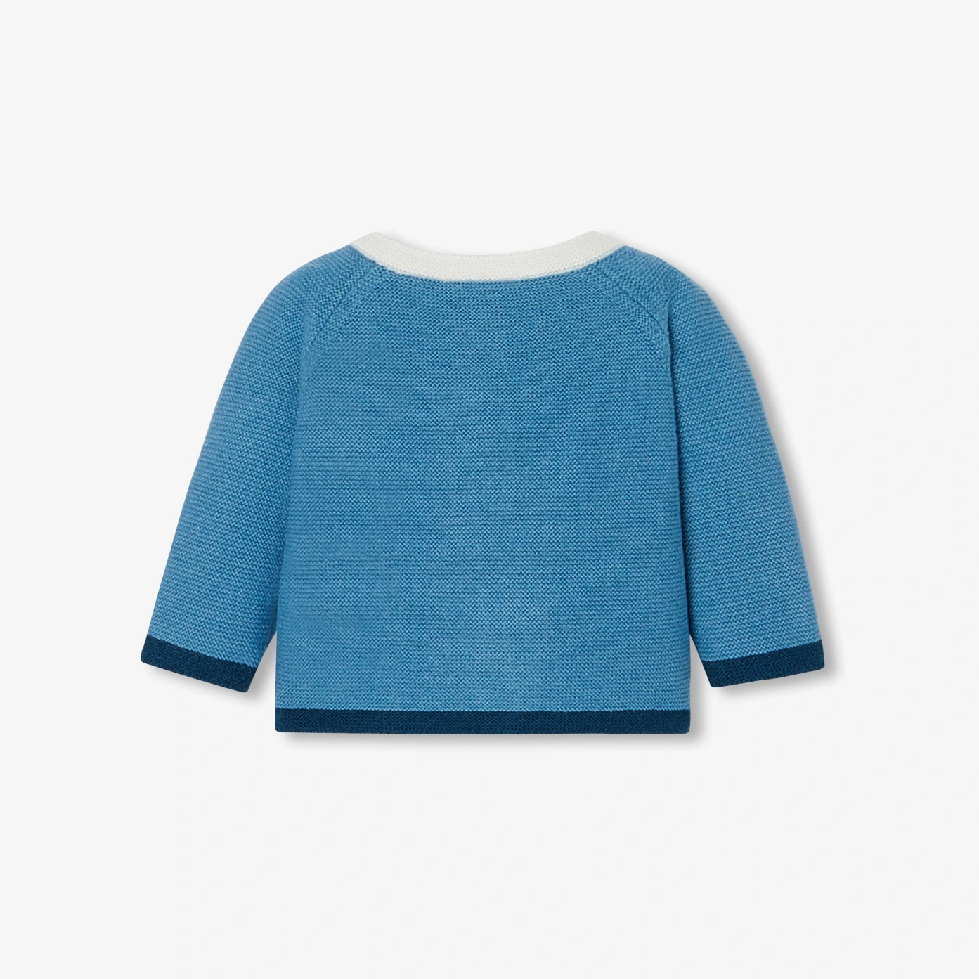 這款嬰兒開襟毛衣採用色塊對比色的袖口與下襬,領邊與門襟的白色線條設計,別具特色。柔和針織設計,斜肩袖設計,門襟採用天然珍珠母貝釦,為這款溫暖舒適的款式增添了現代氣息,專為日常穿著而設計,