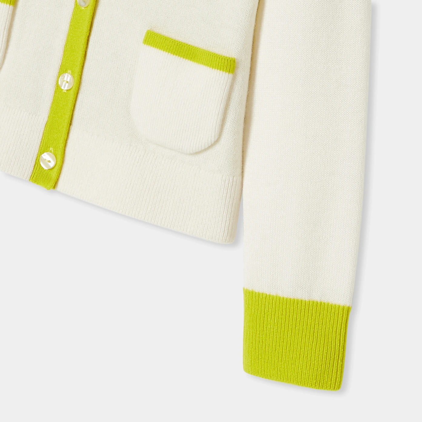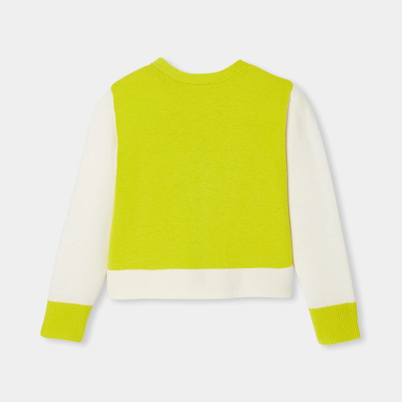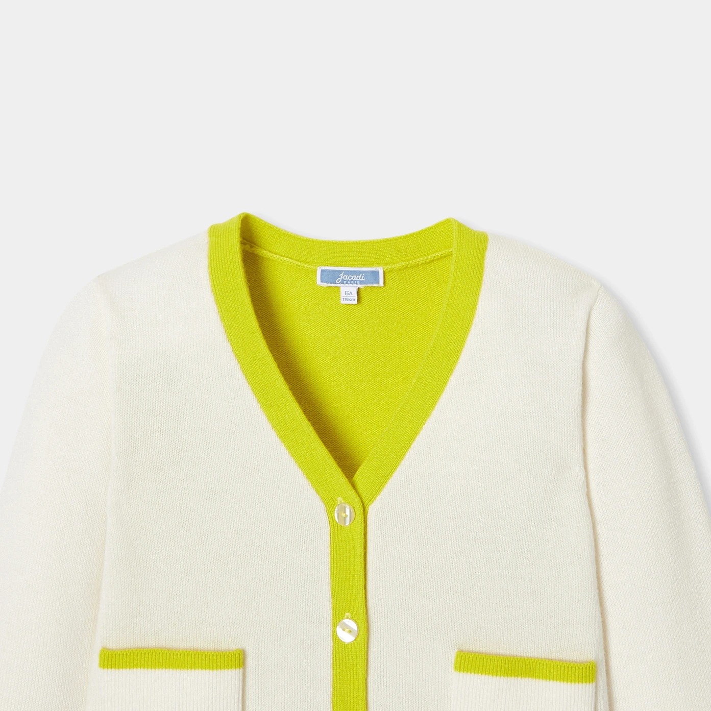這款女孩針織開襟毛衣為冬季穿搭帶來時尚又優雅的氛圍,採用負責任羊毛和羊絨製成,拼接撞色的羅紋邊和小巧的口袋使此款更具立體感,可以搭配上衣與黃色塔夫綢裙穿著,營造聖誕節的氣氛。