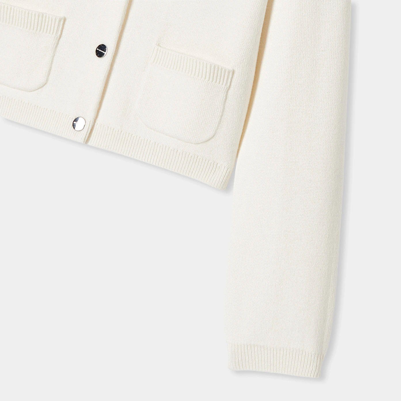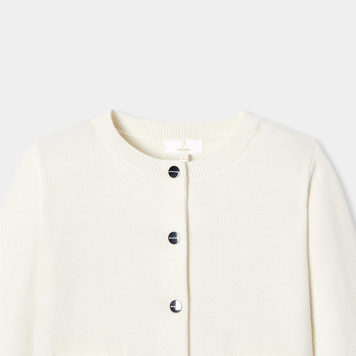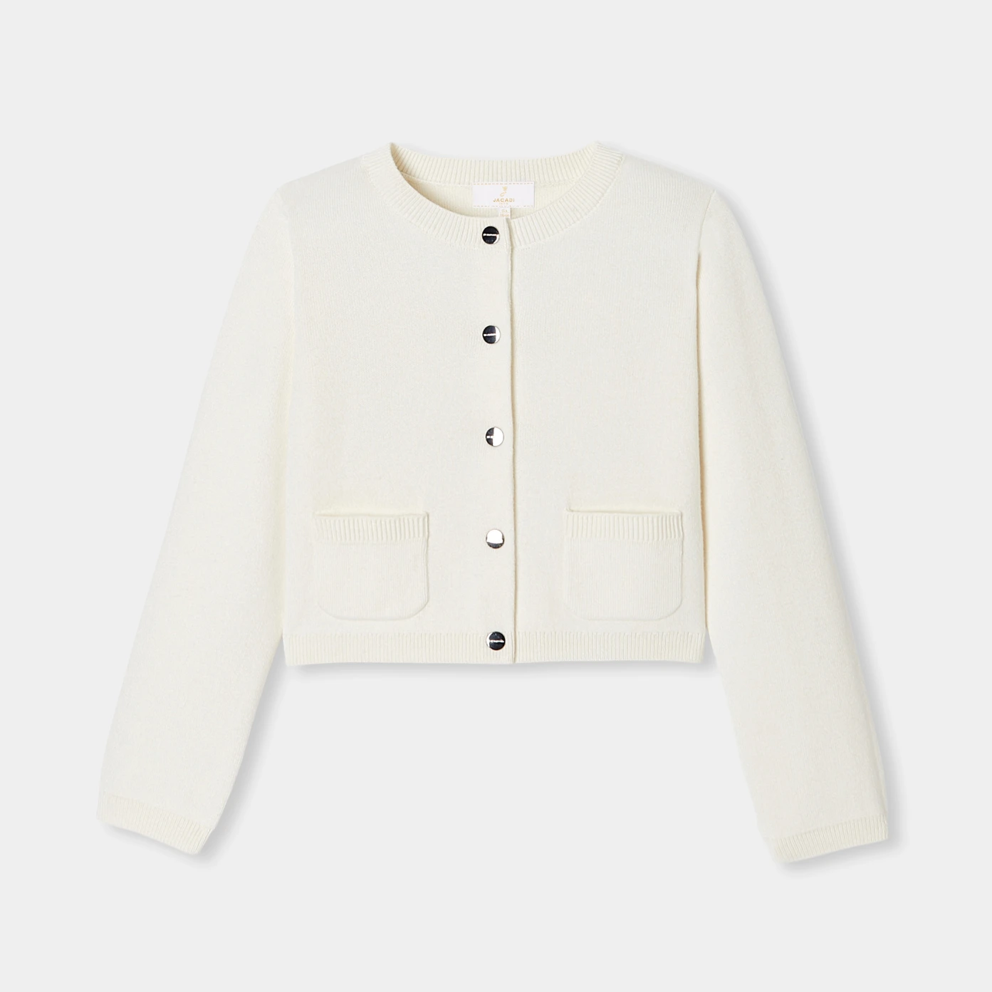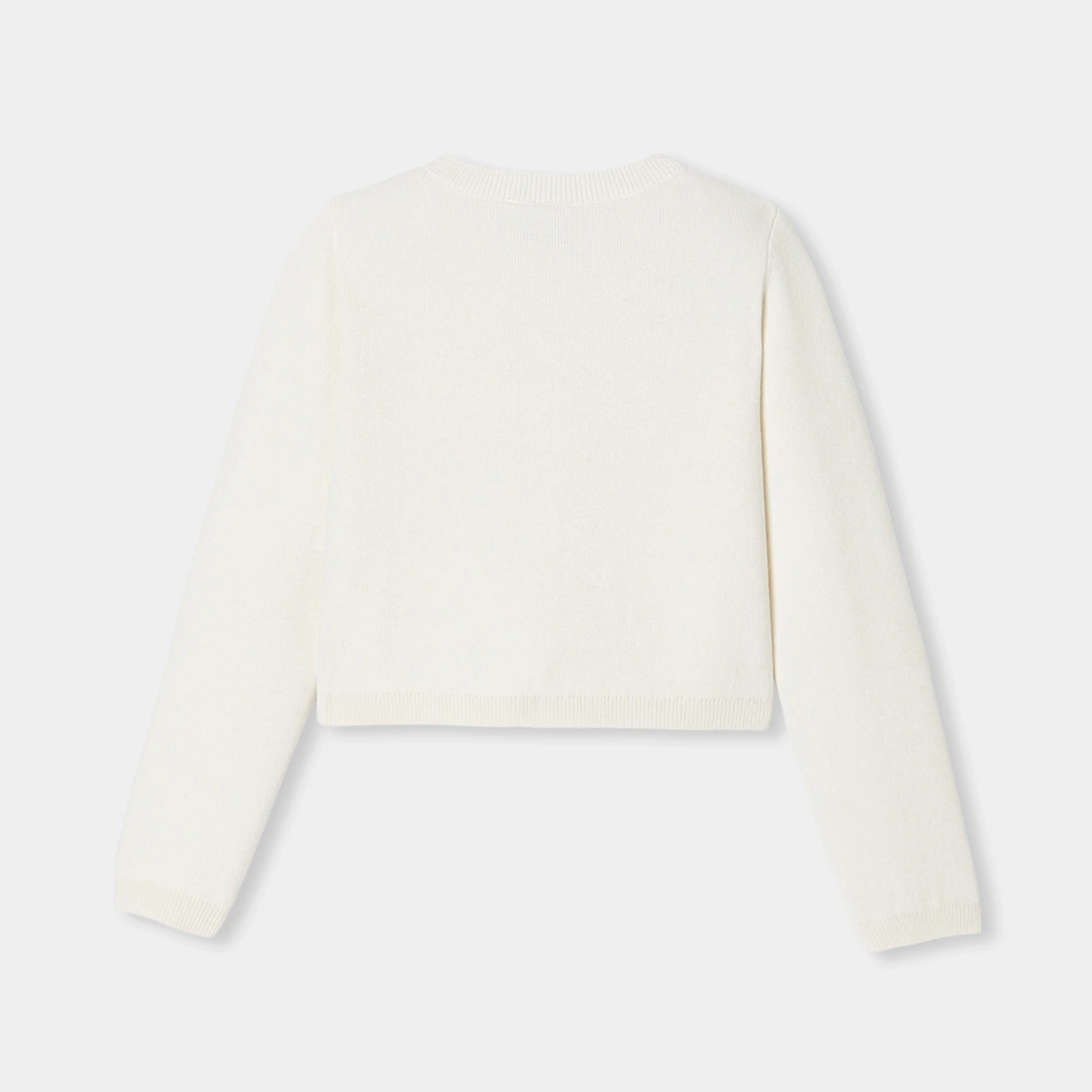 這款女孩羊毛開襟衫以短版設計呈現,彷彿一件小外套,既可搭配上衣與芭蕾舞裙,也能外搭洋裝,營造出優雅且現代的秋冬造型。