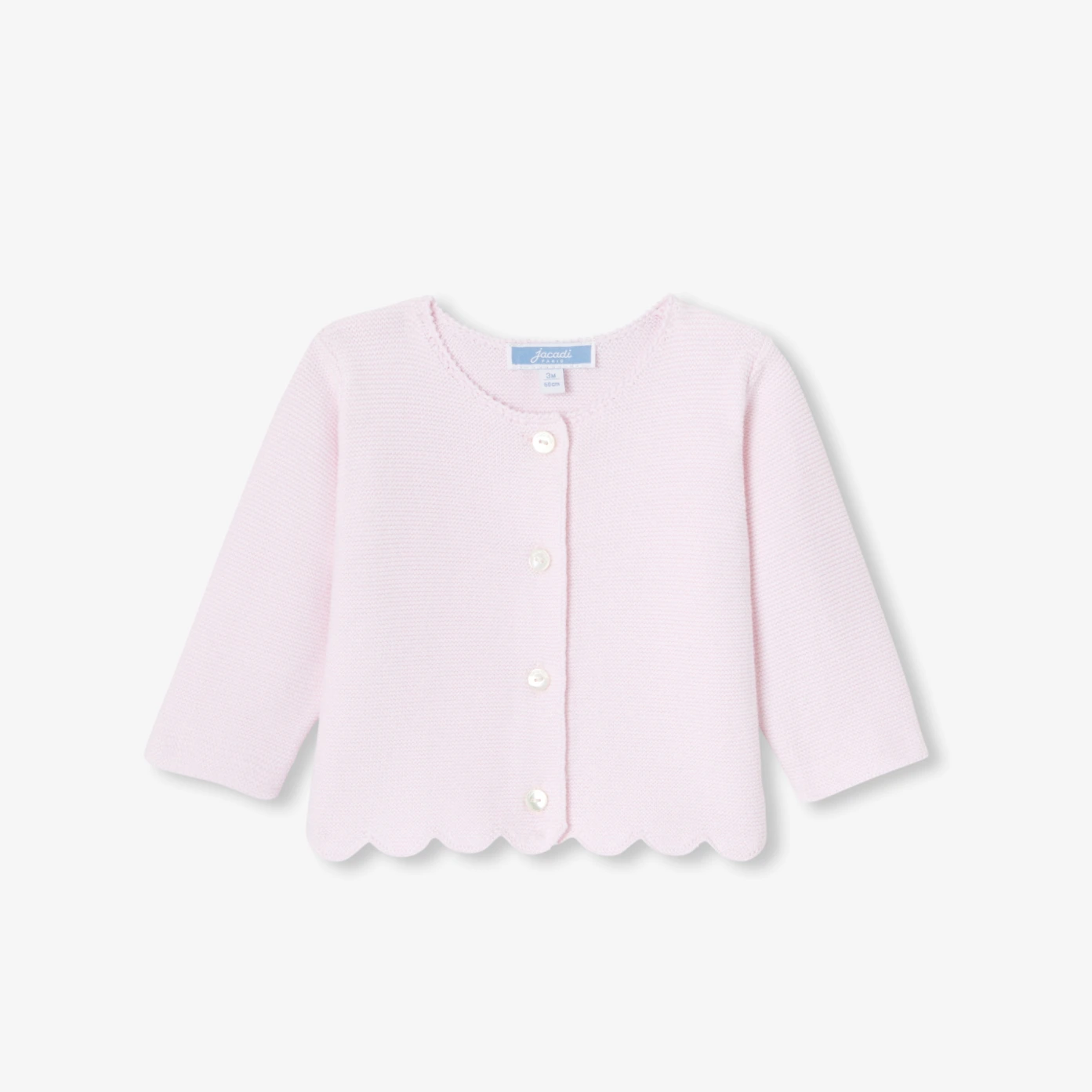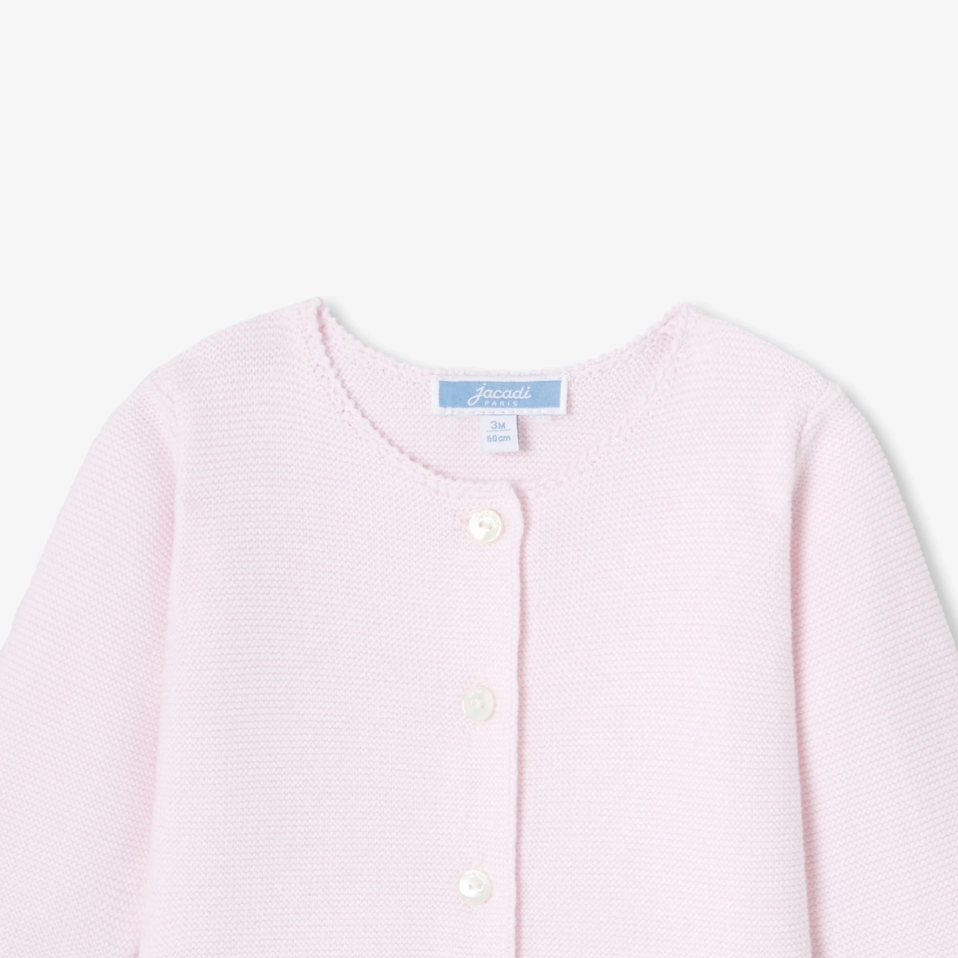 這款柔軟細緻的新生女嬰開襟線衫,是新季衣櫥中不可或缺的單品。選用有機棉製成,以平針織法打造,裙擺飾有優雅波浪邊,並以天然珍珠母貝釦收邊,適合日常穿搭。可搭配襯衫或吊帶褲穿著,柔和的粉色調更能襯托 Jacadi 系列的整體風格。