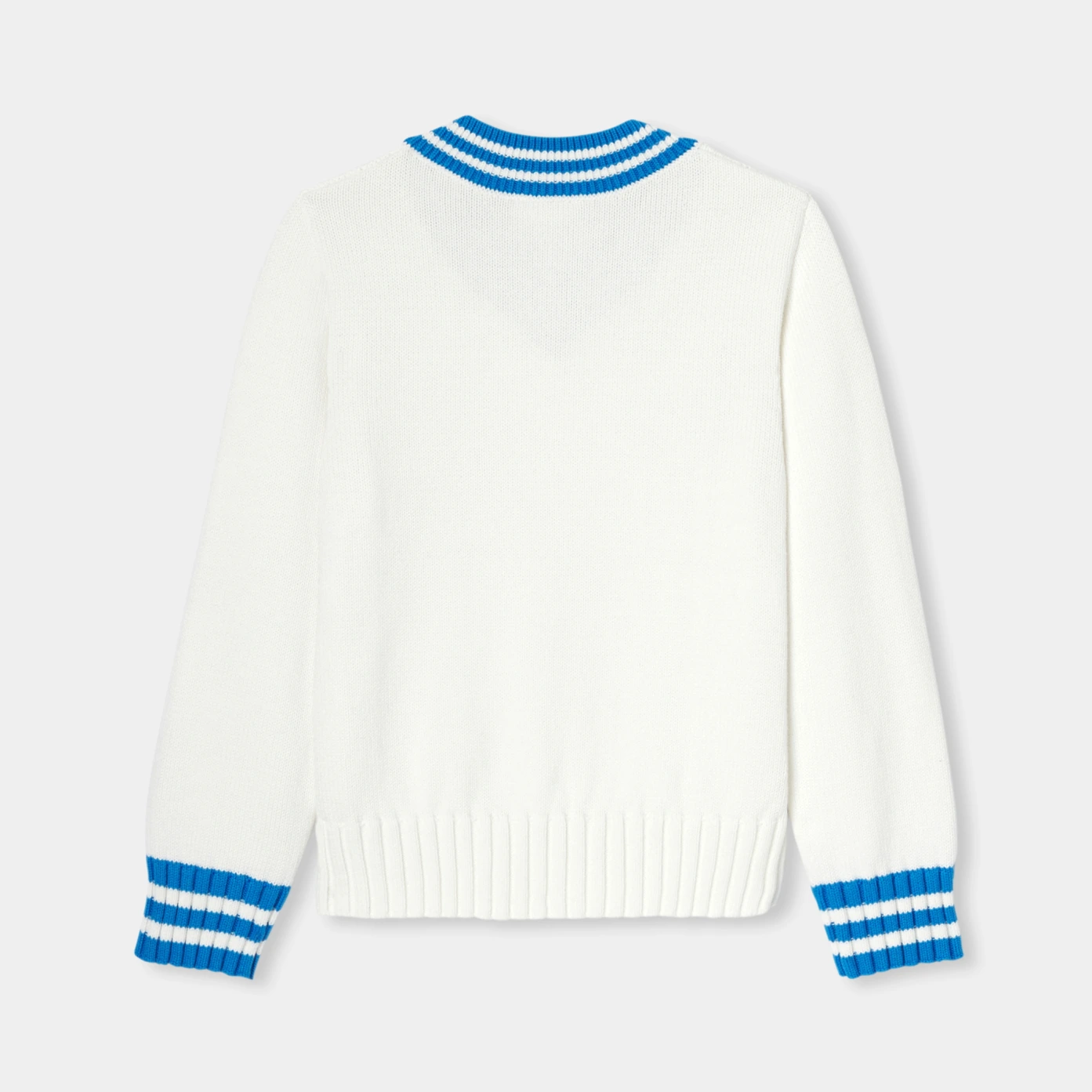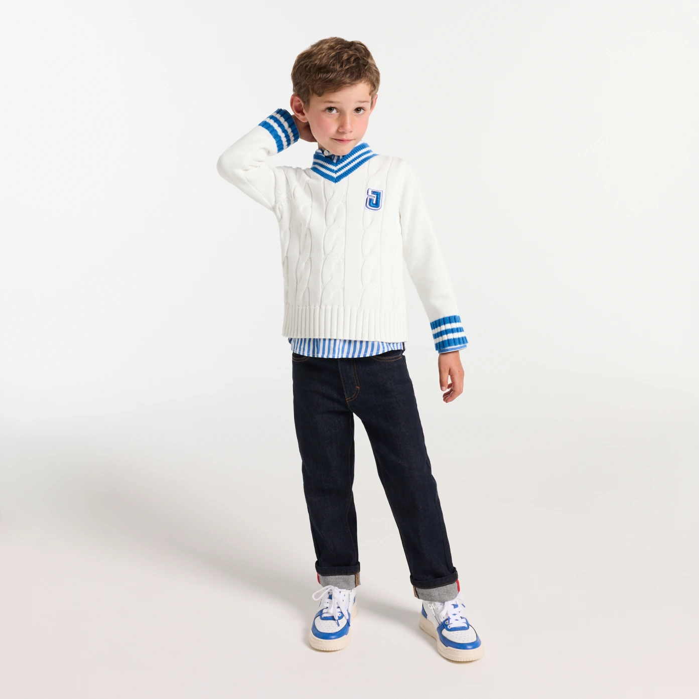 這款套頭上衣以V領設計和條紋羅紋袖口為特色,成為開學季的亮眼之選。採用厚實而優雅的扭花針織面料,胸前繡有J字母,展現出精緻的學院風格,為秋季造型增添一抹優雅與活力。