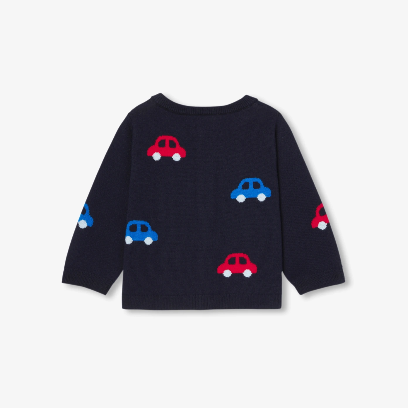 這款新生兒開襟線衫採用柔軟彈性的雙面針織布料製成,搭配童趣十足的圖案設計,營造繽紛幾何的視覺氛圍,深受寶寶喜愛。裝飾有小汽車與老鼠圖案,搭配牛仔吊帶褲與踝靴,即可展現充滿魅力的都市風格穿搭。