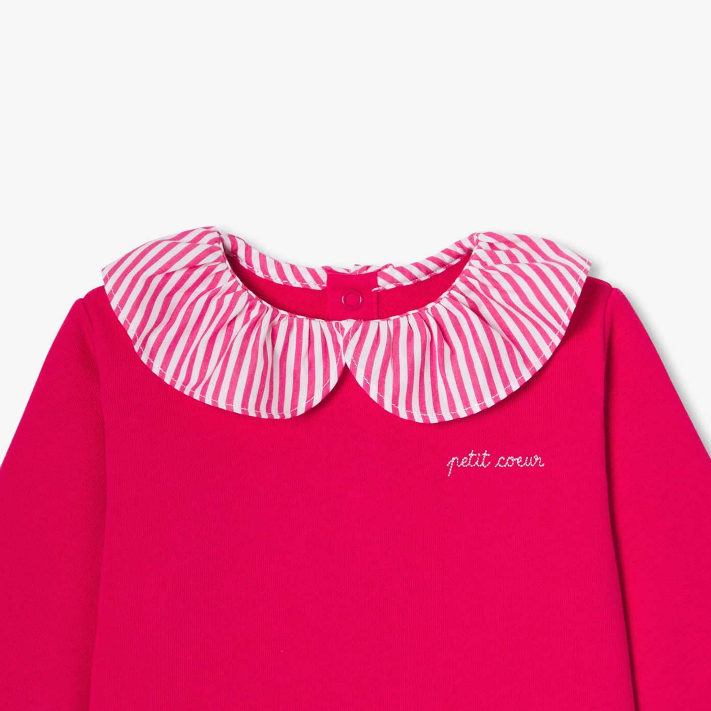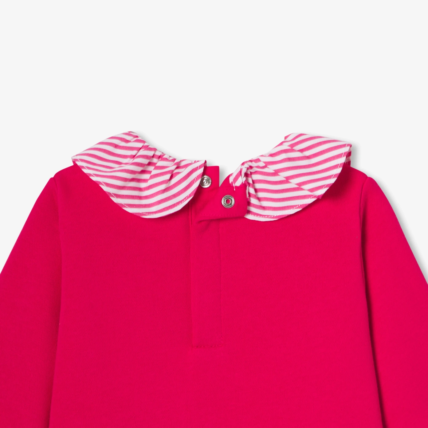 這款女寶寶套頭上衣結合柔軟刷毛的舒適觸感與條紋荷葉領的現代優雅感。背部按釦開合設計方便穿脫,是季節交替時期的實穿單品,搭配牛仔褲與運動鞋即可輕鬆營造出俐落又法式的休閒造型。