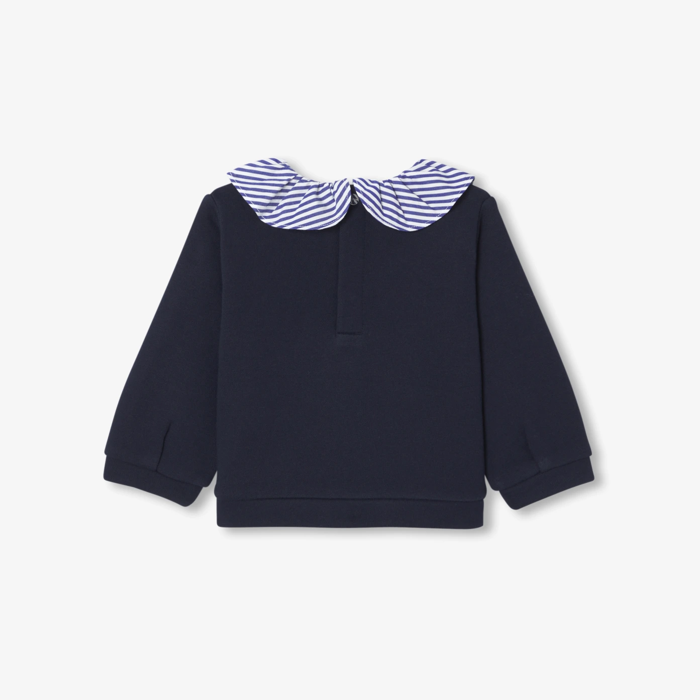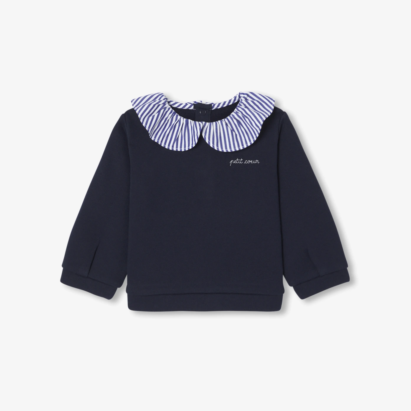 這款女寶寶套頭上衣結合柔軟刷毛的舒適觸感與條紋荷葉領的現代優雅感。背部按釦開合設計方便穿脫,是季節交替時期的實穿單品,搭配牛仔褲與運動鞋即可輕鬆營造出俐落又法式的休閒造型。