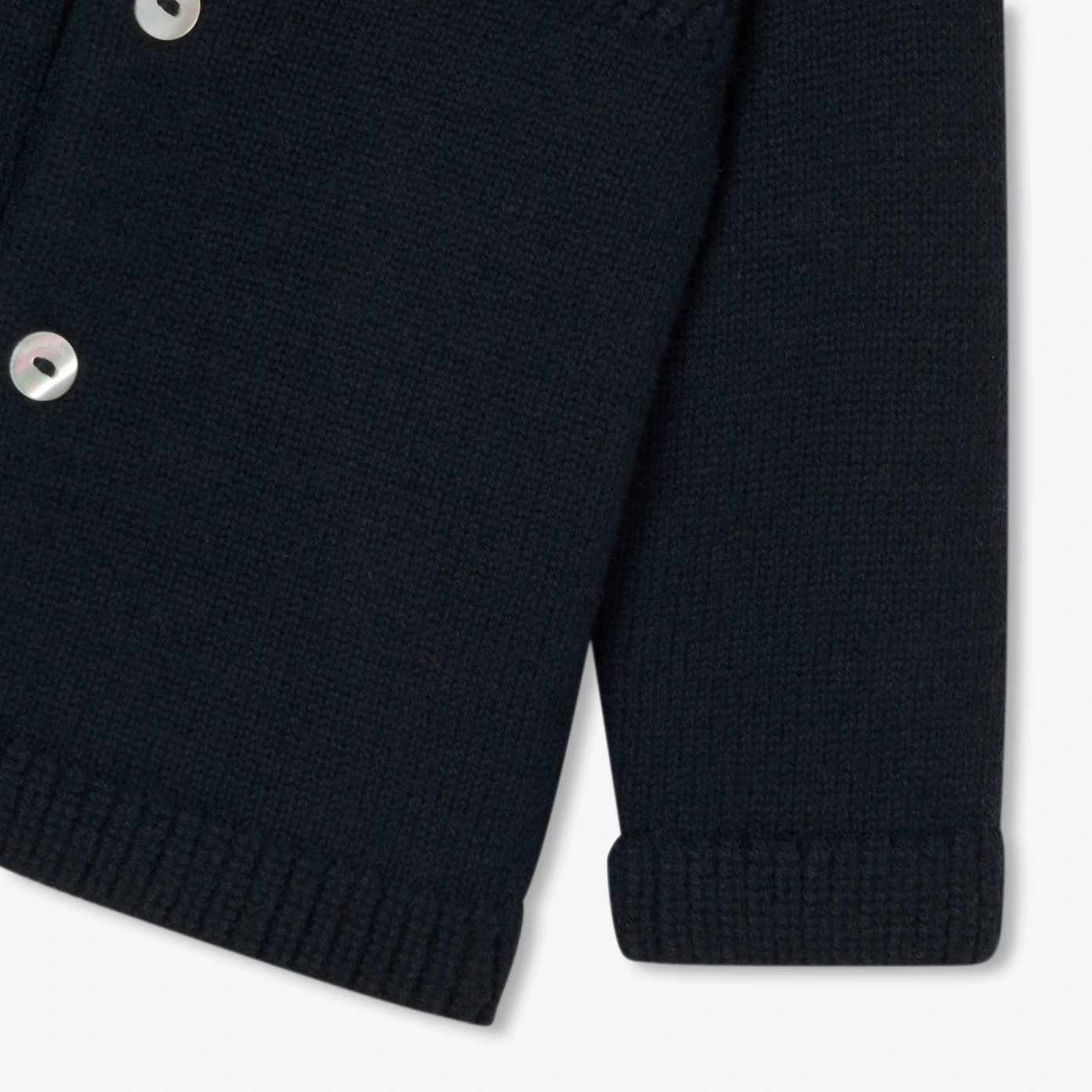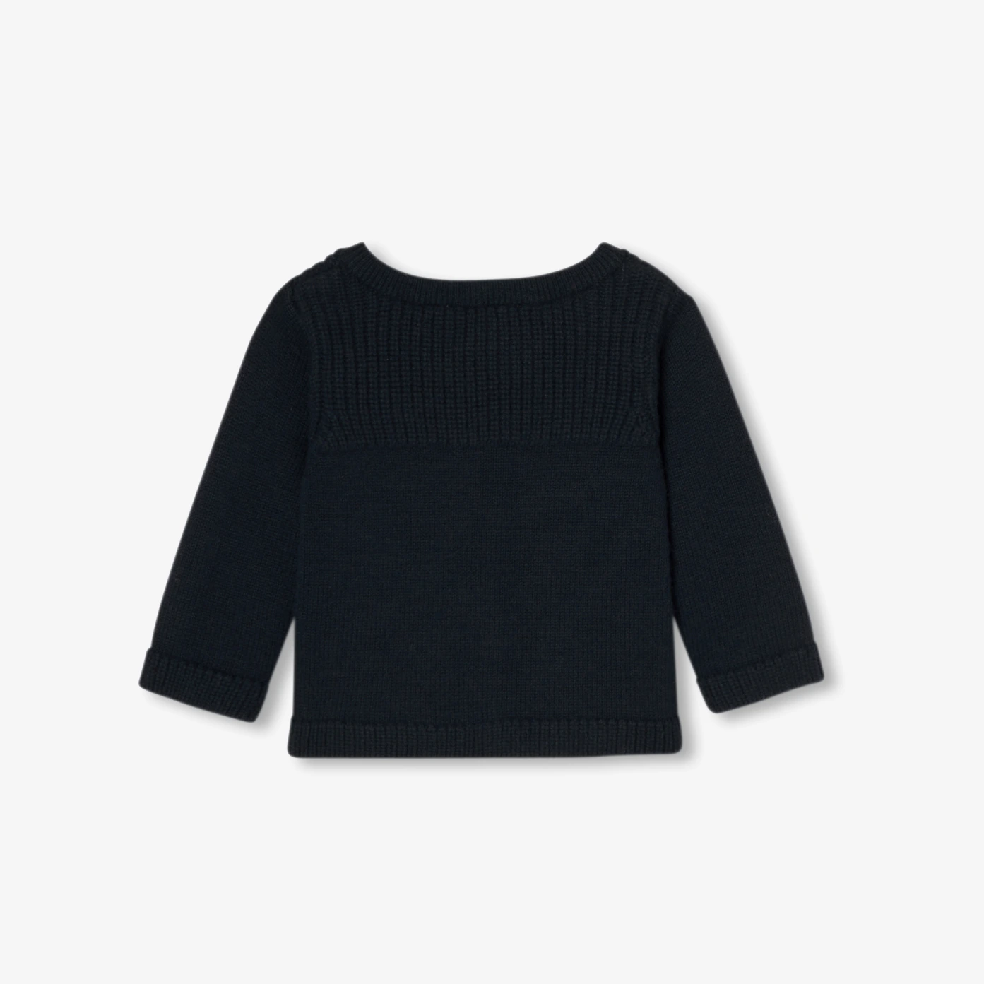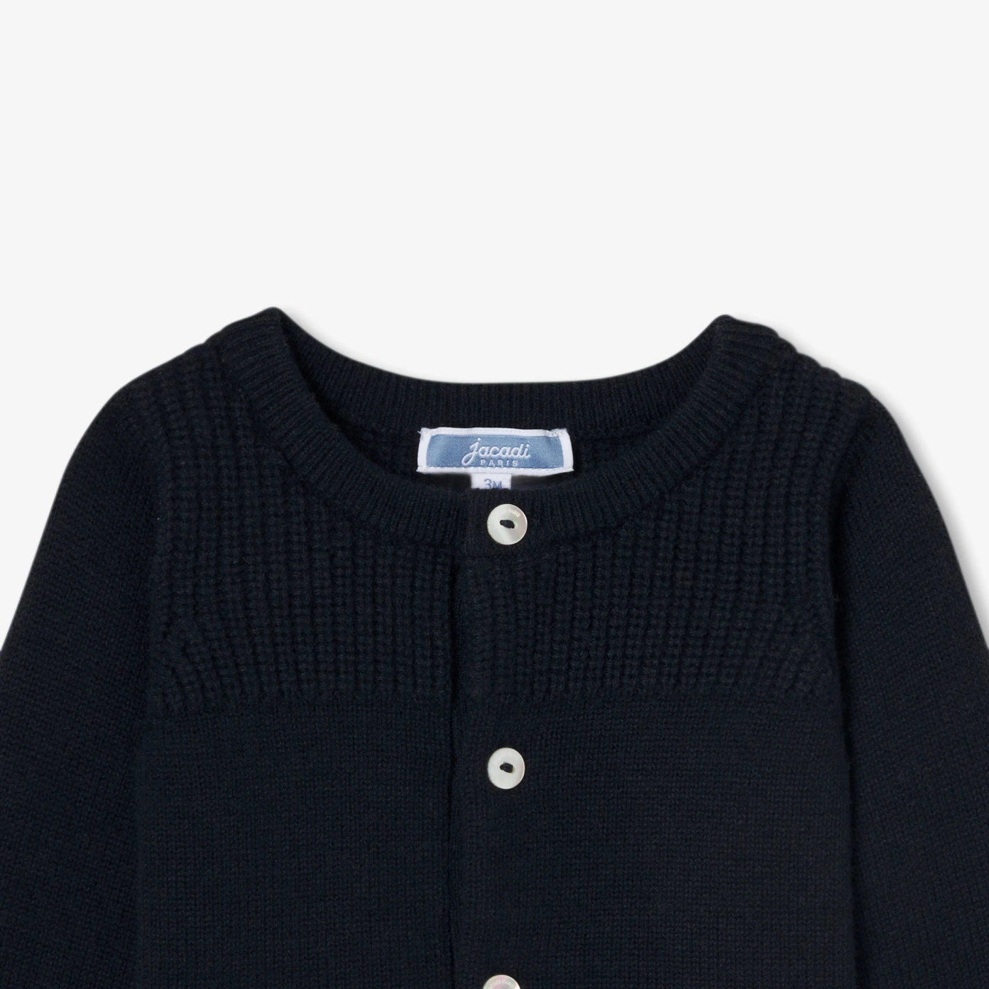 柔軟潔白或經典海軍藍,這款嬰兒開襟毛衣採用羊毛與喀什米爾山羊毛絨混紡,兼具柔軟與包覆感。經典的羅紋織肩設計,展現極簡風格,百搭且多功能,完美呼應整個Jacadi系列服飾。
