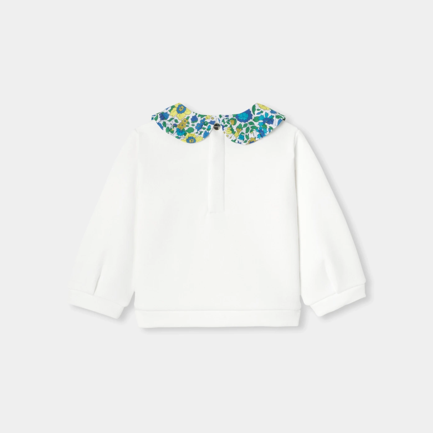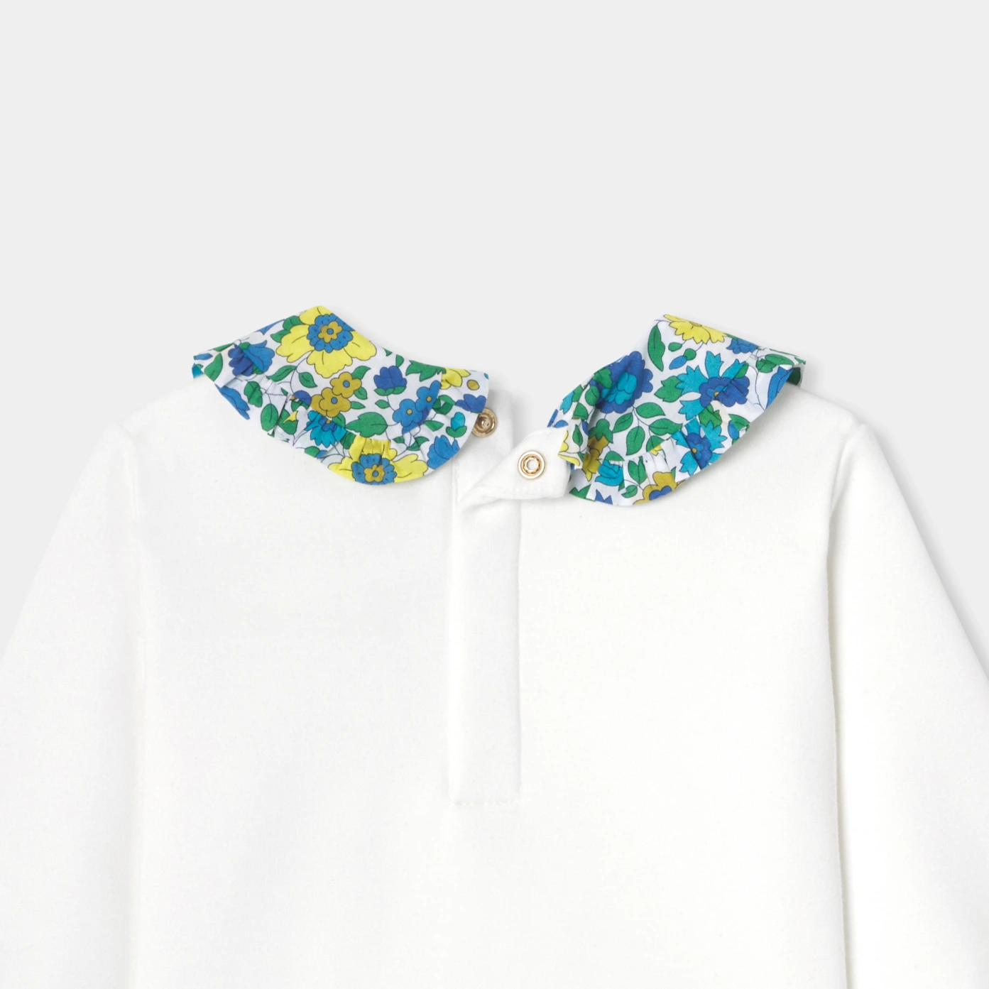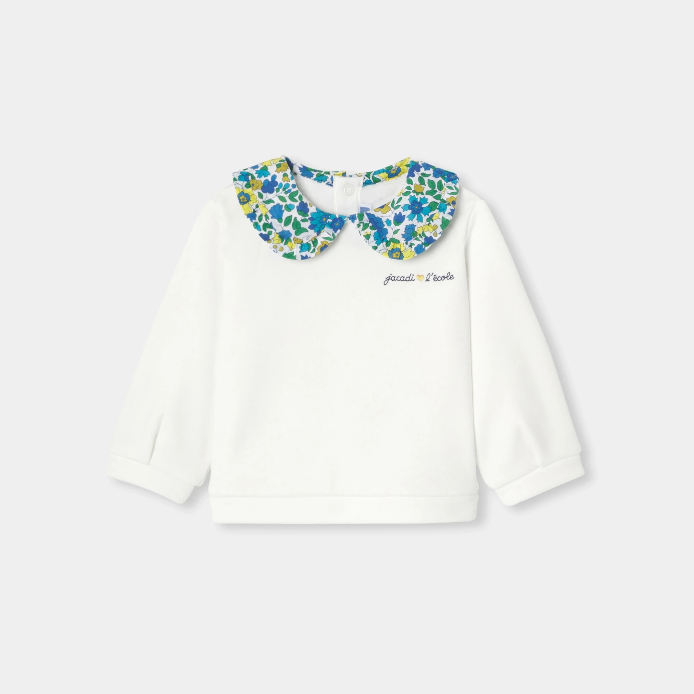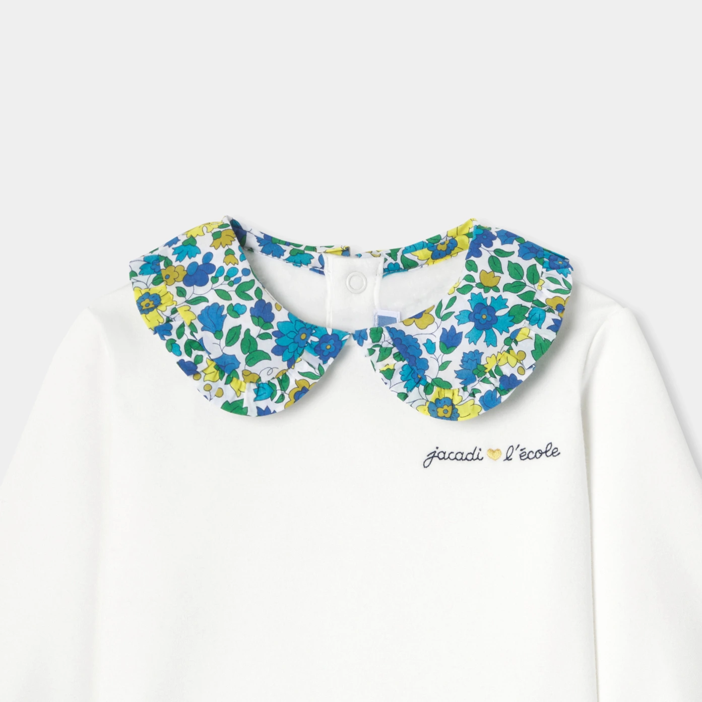 這款女寶寶套頭上衣,將柔軟內刷毛布料與浪漫彼得潘領完美結合,領口以 Jacadi 獨家 Liberty Theresa Petals 花布配色點綴荷葉邊細節,增添法式優雅氛圍。背面按釦開合設計方便穿脫,無論搭配短褲或牛仔褲,都是秋日日常造型的必備單品。