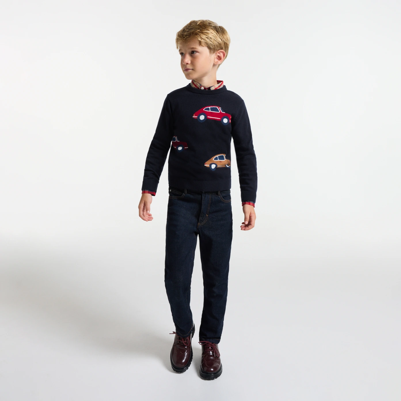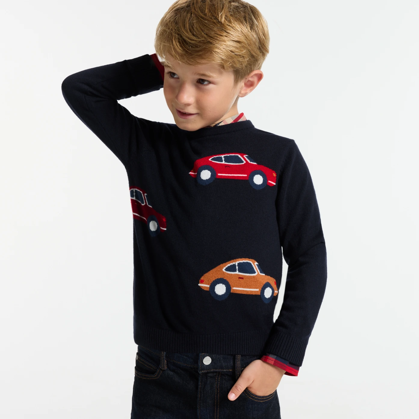 這款男童針織毛衣專為賽車迷設計,以柔軟舒適的羊毛編織,搭配復古汽車嵌花圖案,呈現俏麗且富趣味的細節。可與斜紋布長褲及沙漠靴搭配,打造休閒優雅的法式造型,深受小男孩喜愛。