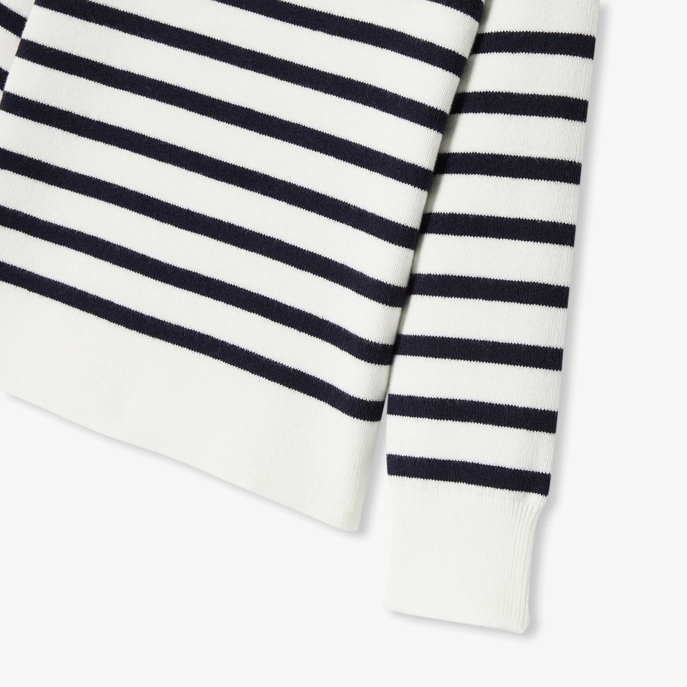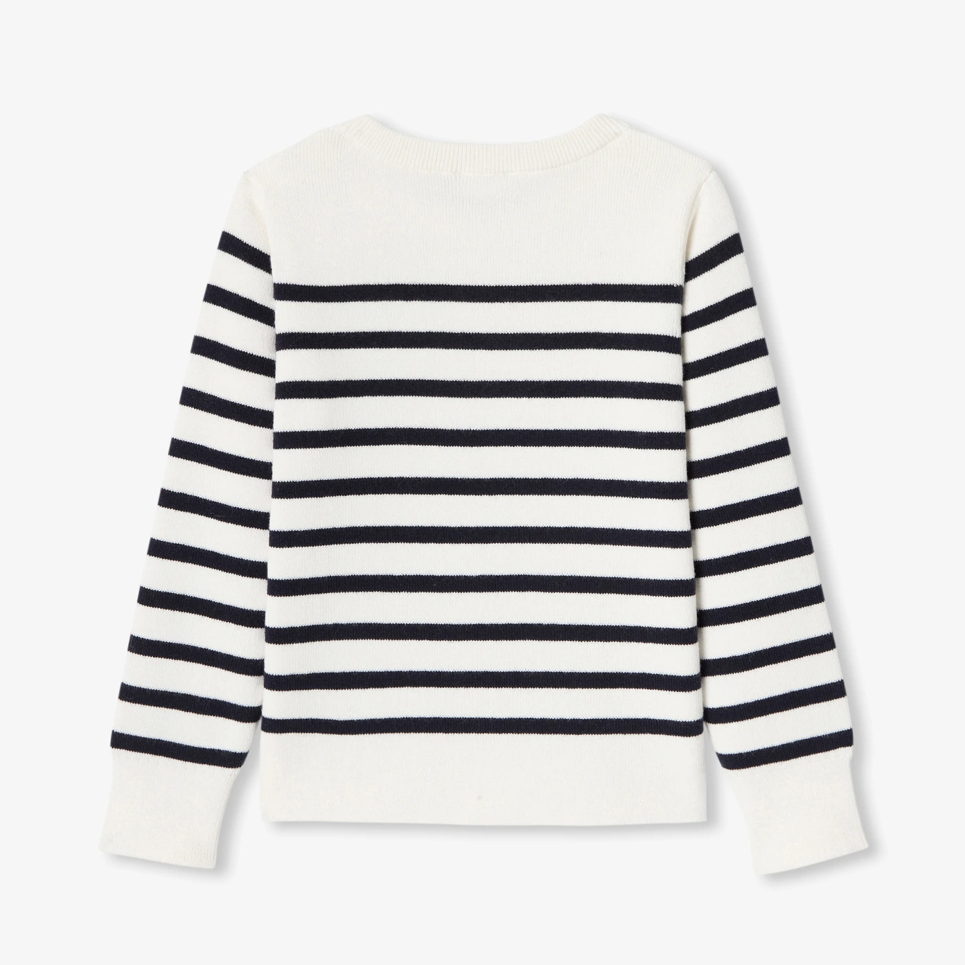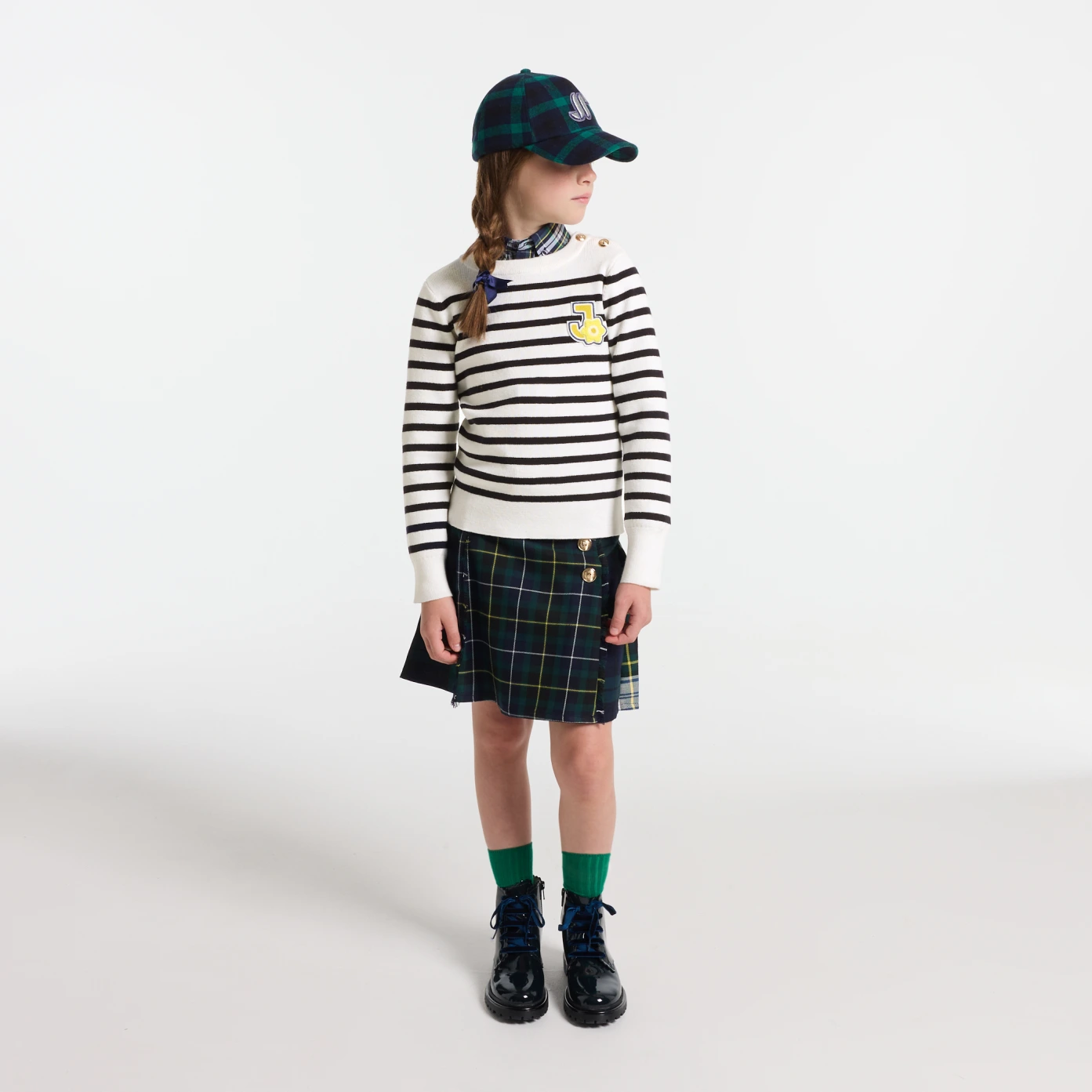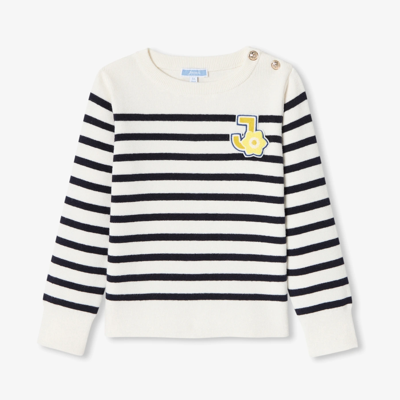 充滿學院風格的這款大女童毛衣,採用有機棉與羊毛混紡製成,是秋季衣櫥的理想之選。經典海軍藍條紋設計,肩部按釦開合方便穿脫,胸前以「J」字母與花朵徽章刺繡點綴,展現時髦細節。可搭配寬褲與格紋羽絨外套,打造俏皮混搭造型。