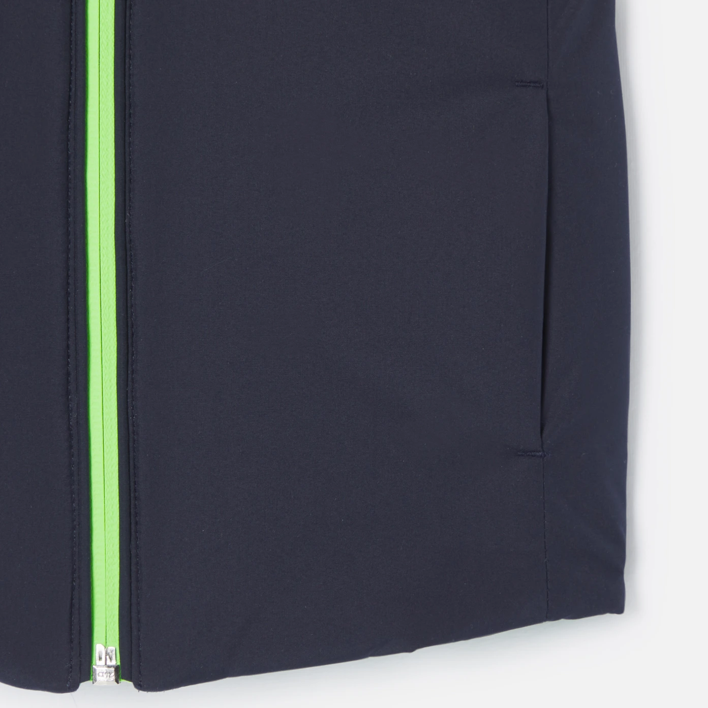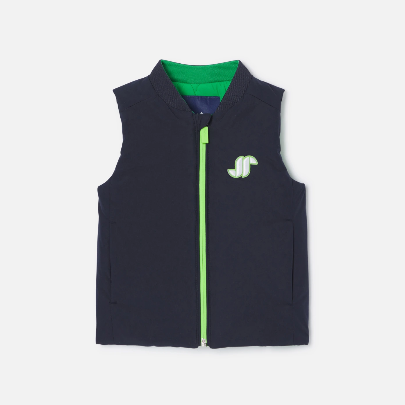 這款背心外套以時尚風格開啟新季節,由防潑水尼龍製成,配有拉鍊開襟設計,小男孩可以選擇海軍藍或綠色,展現多樣風格。外搭運動衫、米色長褲和運動鞋,這款可雙面穿的背心是日常穿著的必備單品。