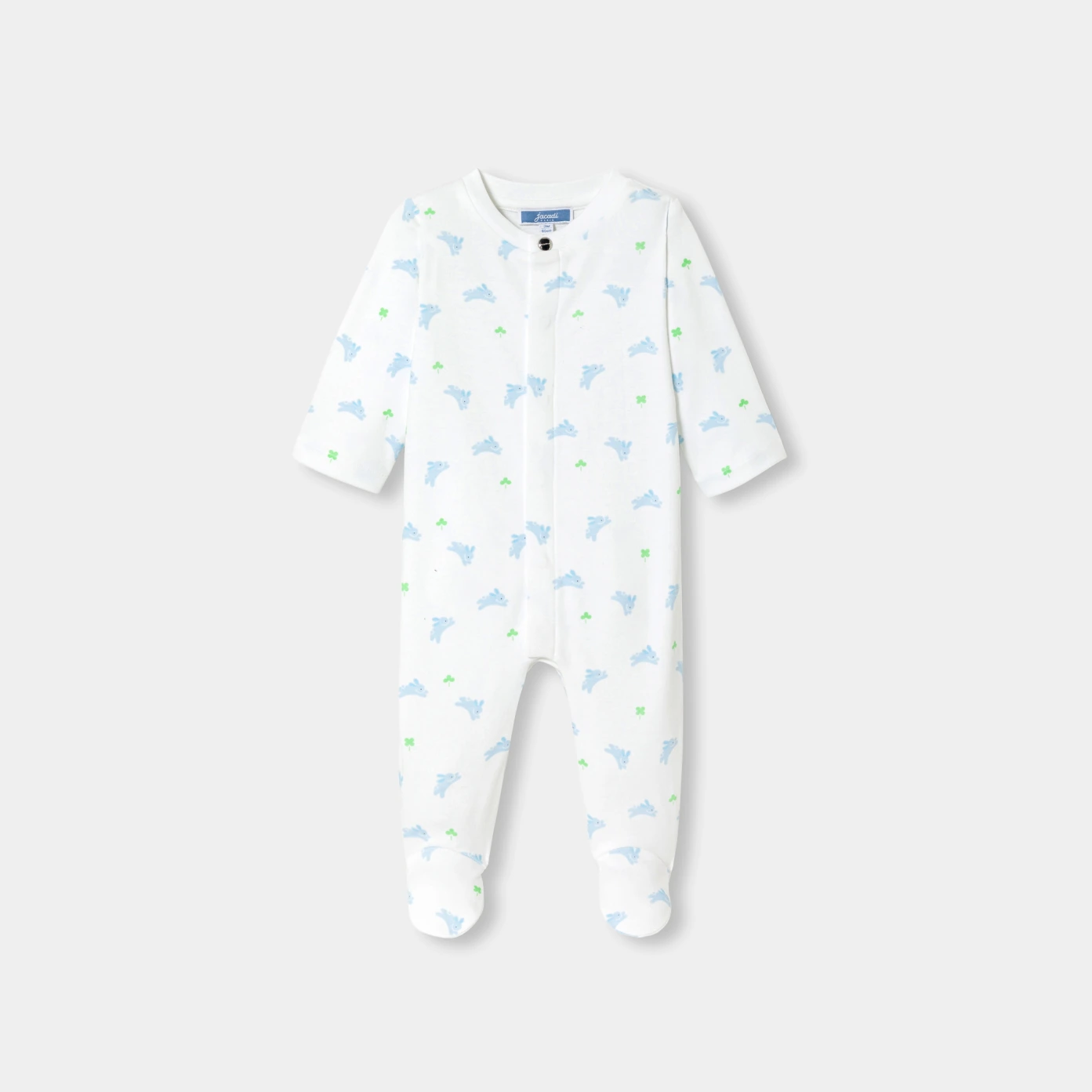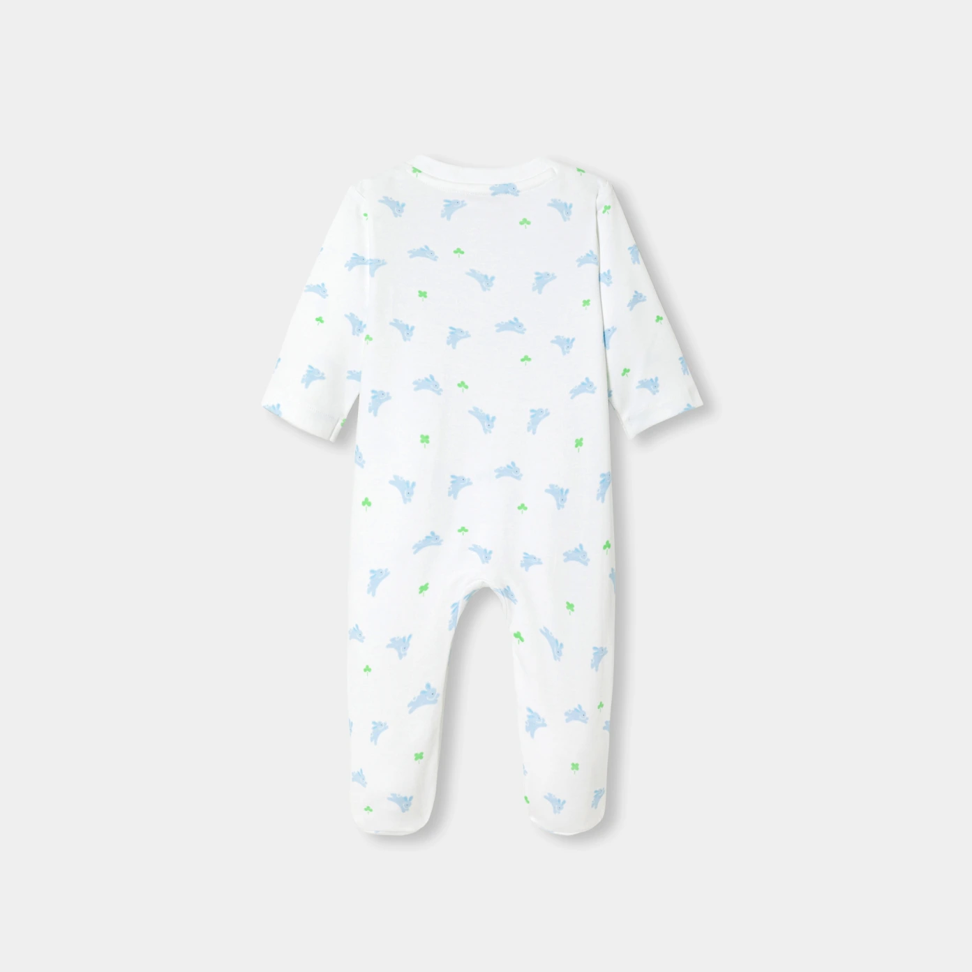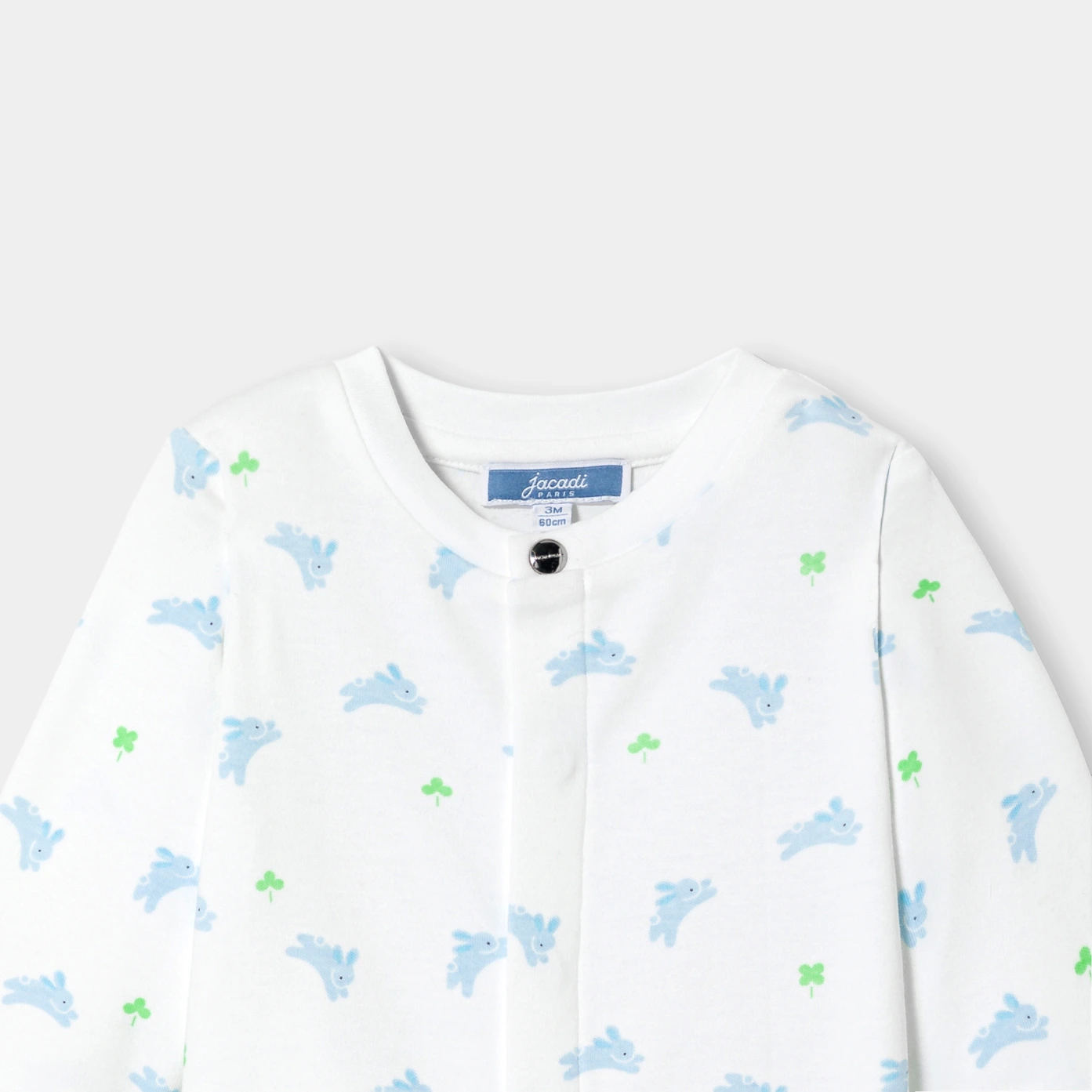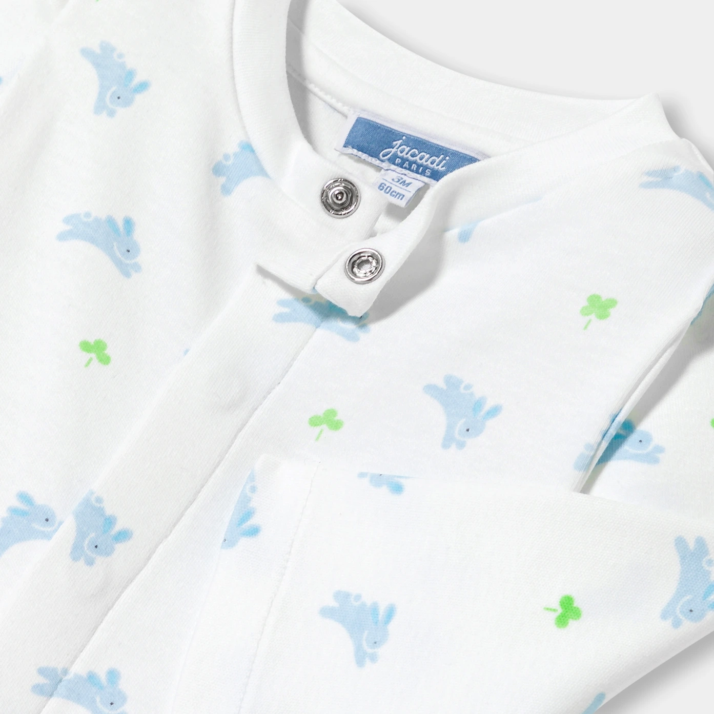 本季兔裝採用柔軟、輕盈的有機棉製成,帶有俏皮圖案,款式休閒。無領片的設計和前扣式開口,方便又輕鬆的穿衣,從換季開始,它們將成為您孩子小睡和夜晚的受歡迎的一件兔裝