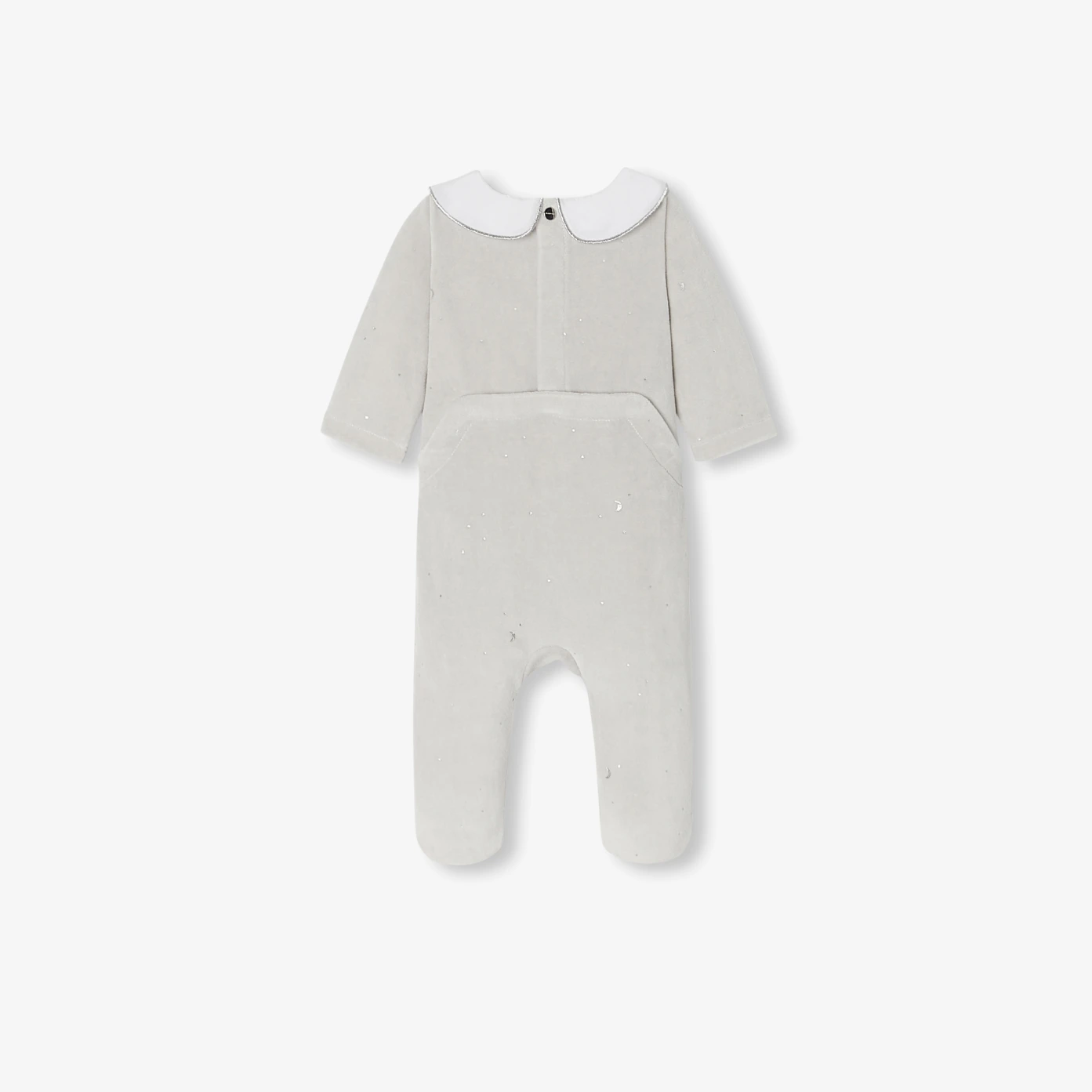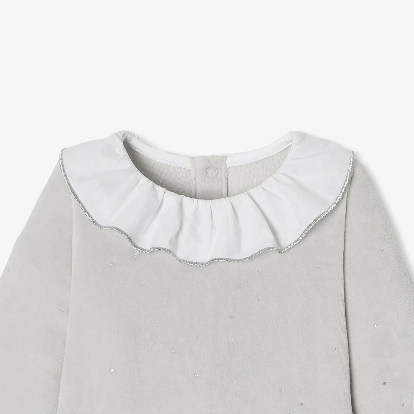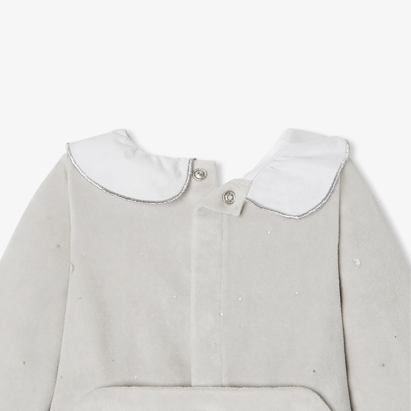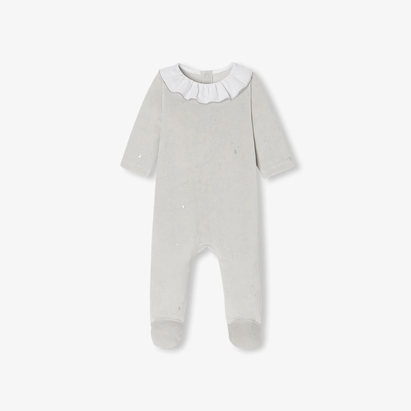 這款柔軟天鵝絨兔裝別緻又舒適,適合秋天穿著。有著中性又典雅的顏色可供選擇,波登縫線荷葉邊和小小的銀色月亮和星星,使得這款衣櫃必備品更具獨特性。背面有按釦,方便穿衣,它將成為您寶寶整個季節的伴侶。