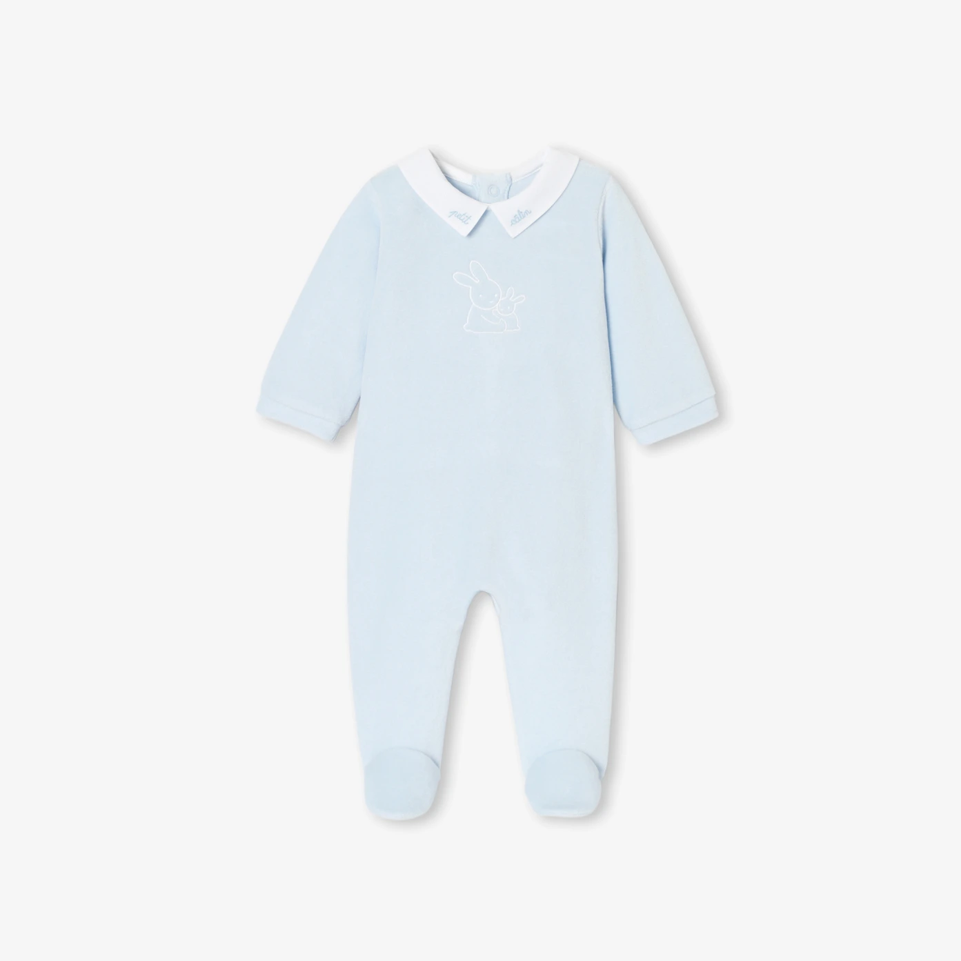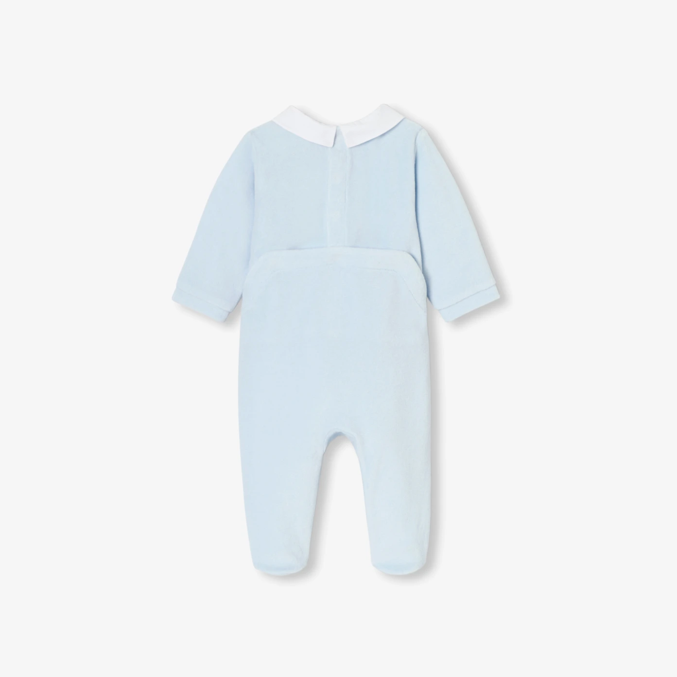 這款優雅的嬰兒兔裝是住院待產包中的理想單品。採用柔軟親膚的有機棉天鵝絨製成,搭配對比色的純棉布領片,後背隱藏式按釦設計方便穿脫,讓新生寶寶在初生時期的每一次小憩與夜晚都被溫柔包覆。