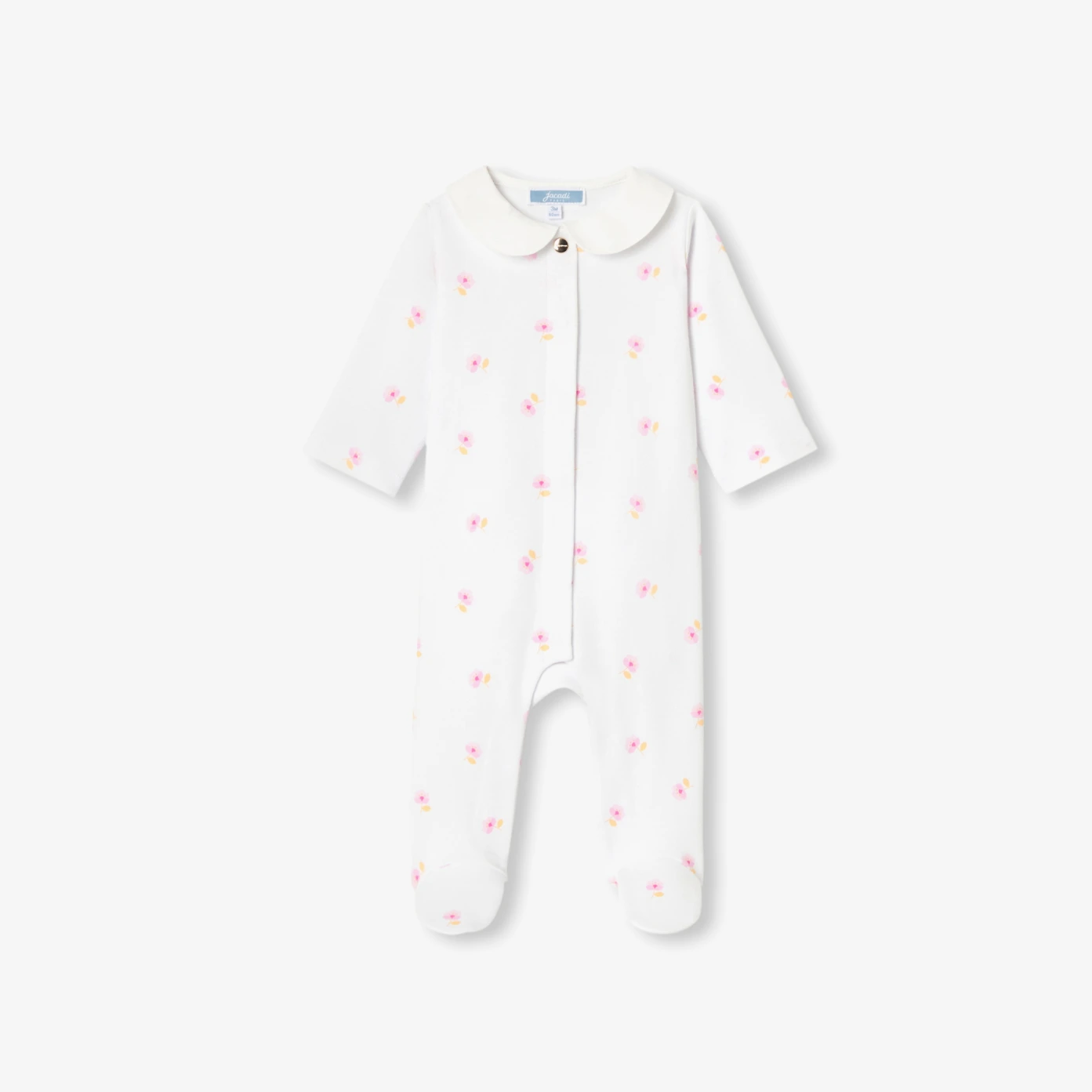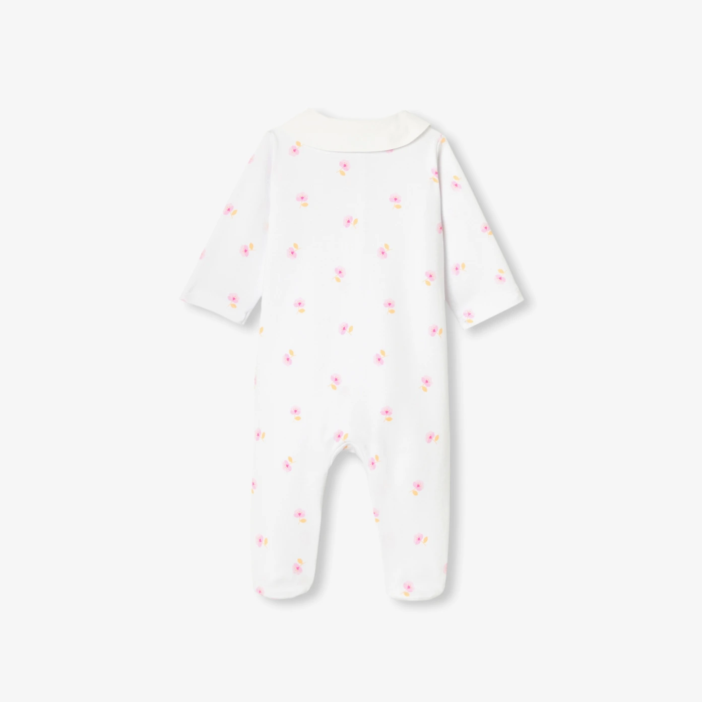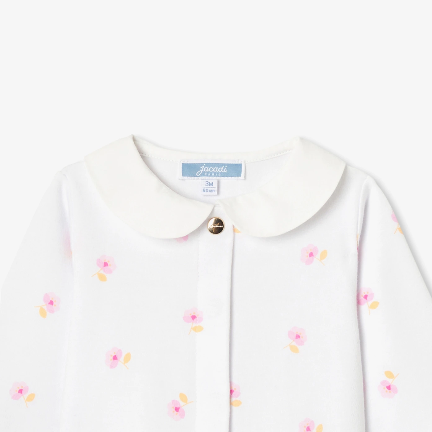 這款新生女嬰連身兔裝以經典優雅風格,為寶寶帶來甜美安穩的夜晚。選用柔軟且包覆性佳的有機棉彈性布製成,搭配細緻的花卉圖案與白色棉質彼得潘領,展現溫柔氣質。正面採用隱藏式按釦設計,方便穿脫,是日常生活不可或缺的實用單品。