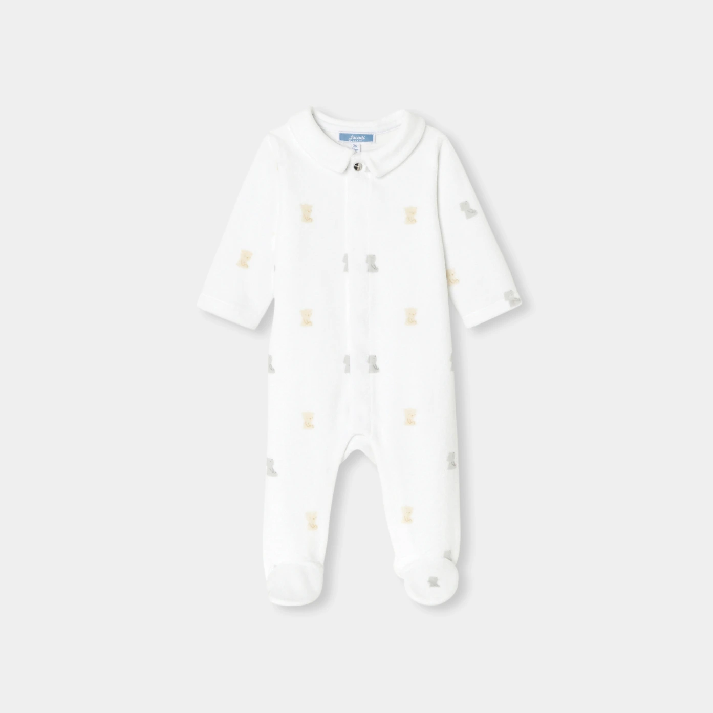 這款必備嬰兒連身兔裝以柔和色調結合溫馨小熊圖案,展現出溫柔細膩的設計感。選用柔軟絨布材質,提供新生兒舒適貼身的穿著體驗,適合日常使用,陪伴每一夜的安穩入睡。標誌性的純棉襯衫式領口增添法式優雅風格,前側隱藏式按釦設計則讓穿脫更加輕鬆便利。是經典的新生兒必備單品,無論作為出生禮或納入寶寶的第一份衣櫥都非常合適。