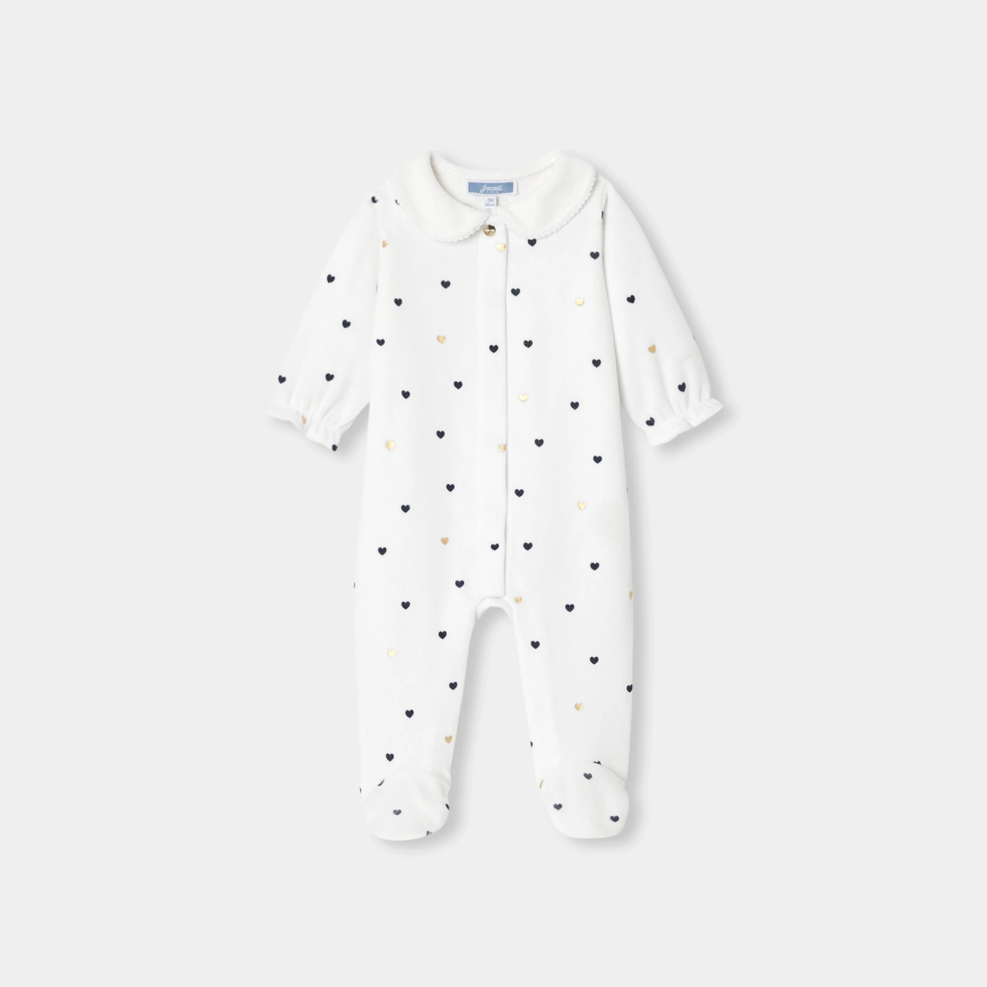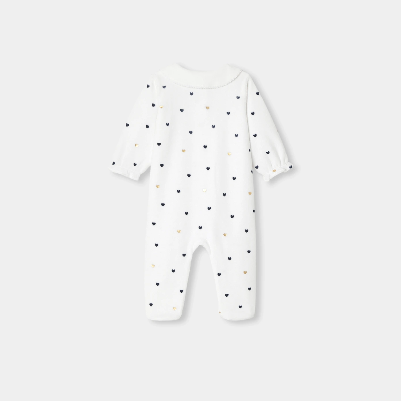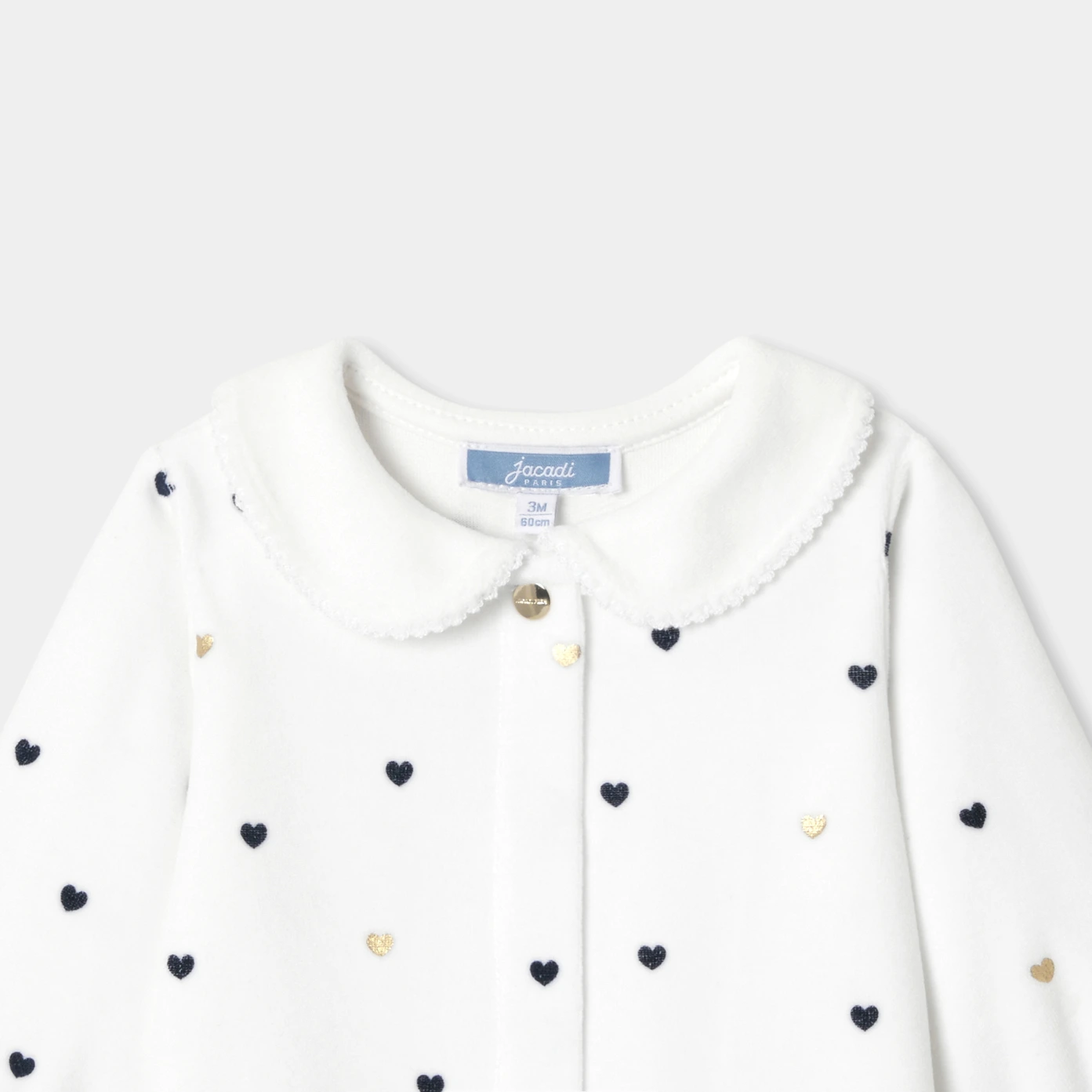 本季兔裝飾以深藍與金色小愛心,點亮新生女嬰的夢幻時光。採用柔軟保暖的有機棉絨布製成,溫暖包覆感極佳,並以優雅的天鵝絨花瓣領搭配精緻捲邊飾邊,增添秋冬氣息。正面隱藏式按釦設計方便穿脫,袖口鬆緊設計則添一抹俏皮細節,實用又迷人。