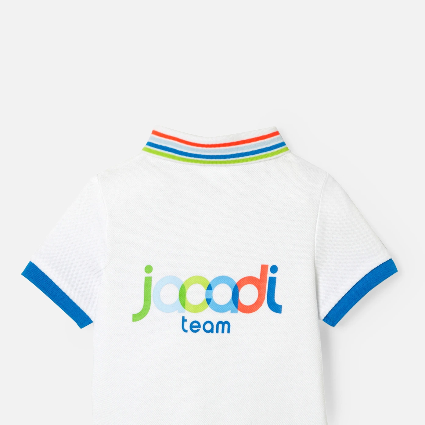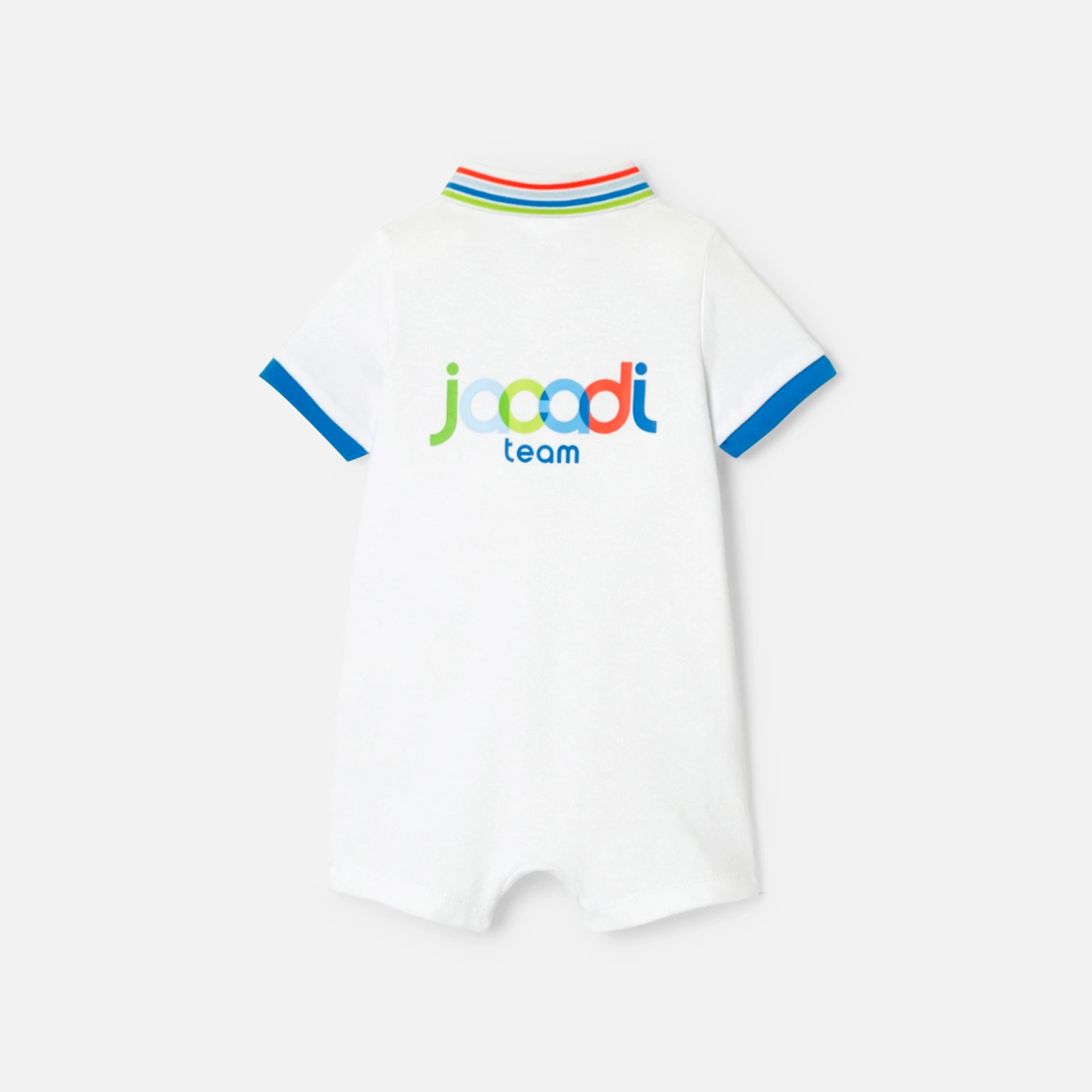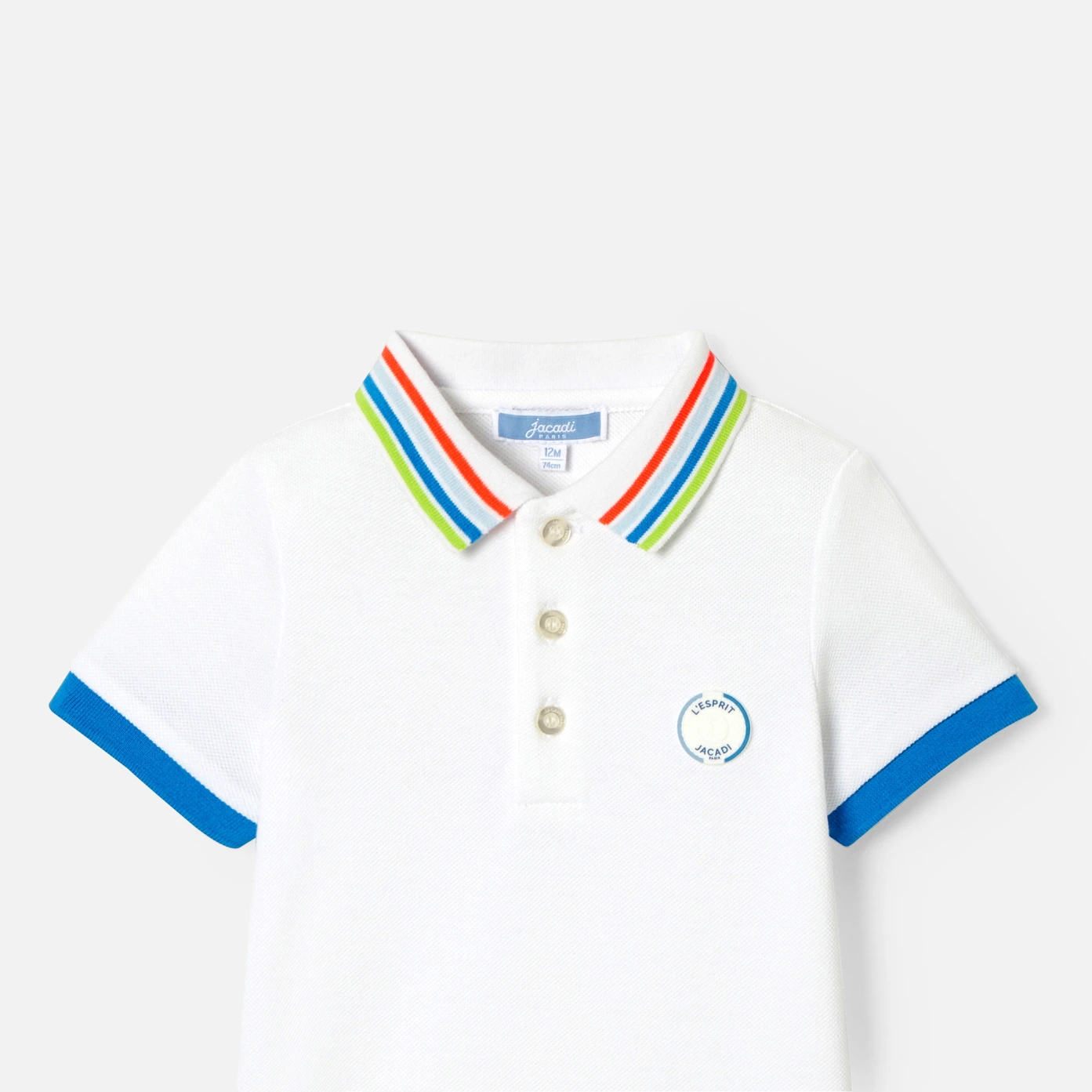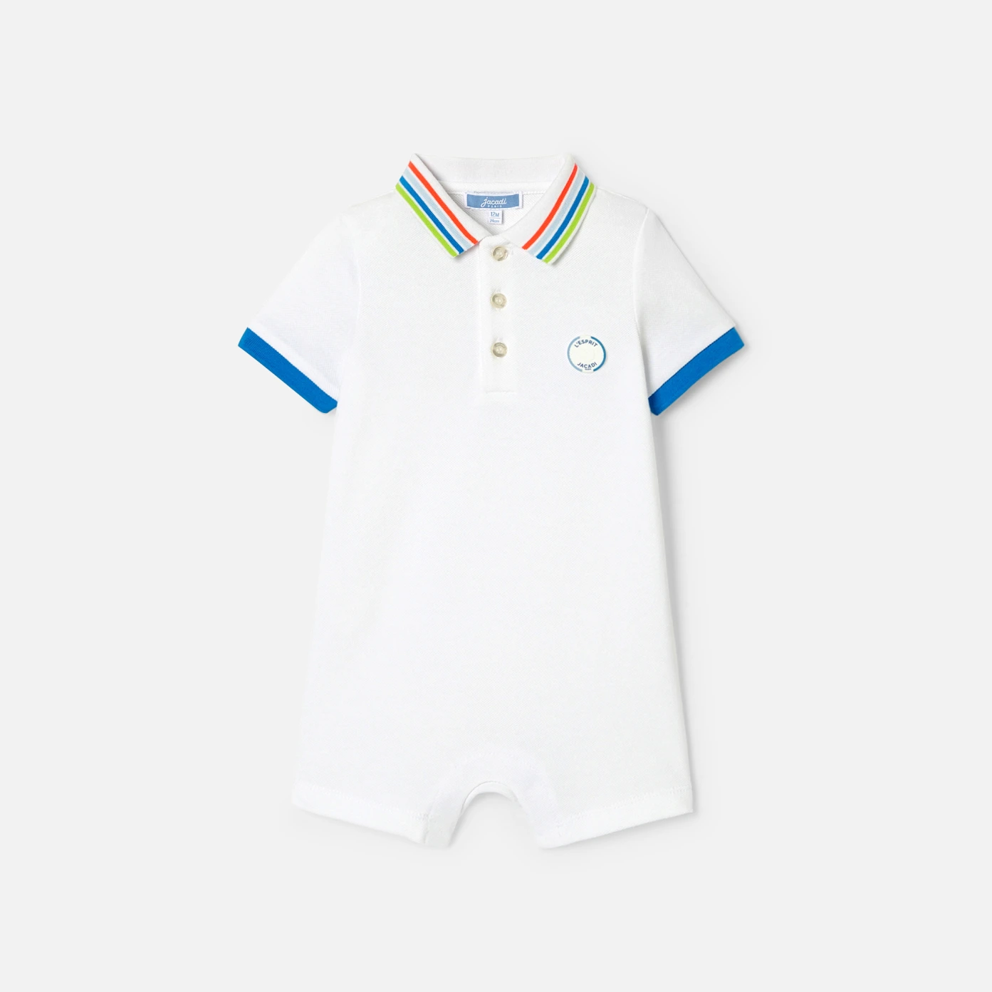 這款男童連身裝充滿巴黎人時尚的細節感。具有Polo 衫造型感,採用柔軟、柔軟的棉質珠地布製成,條紋衣領和撞色袖口為這款連身裝帶來運動時尚感並注入活力,適合在城飾生活或海灘穿著。