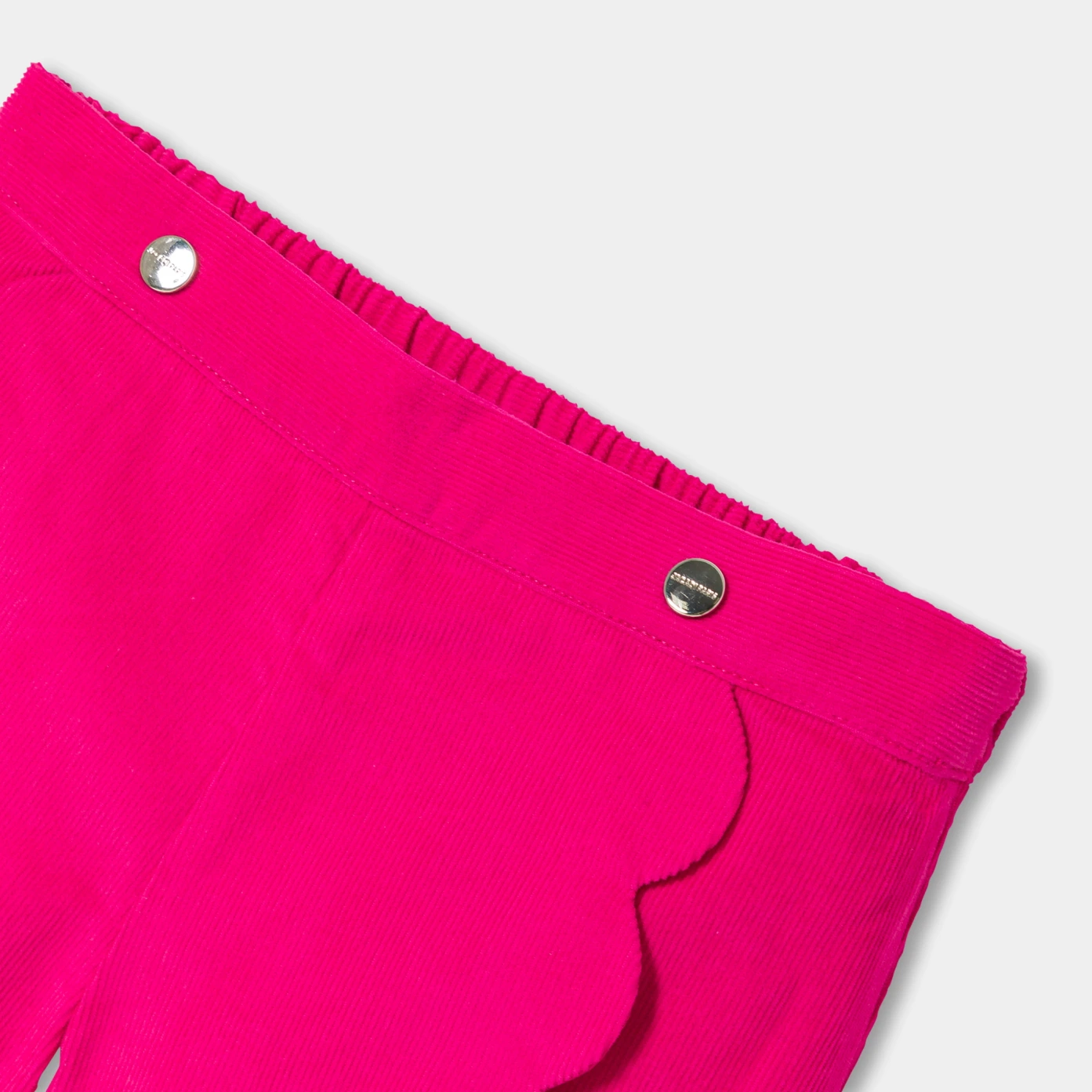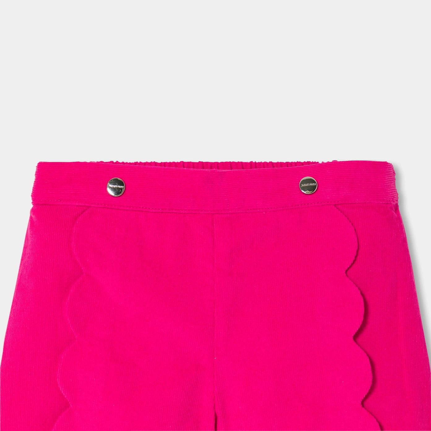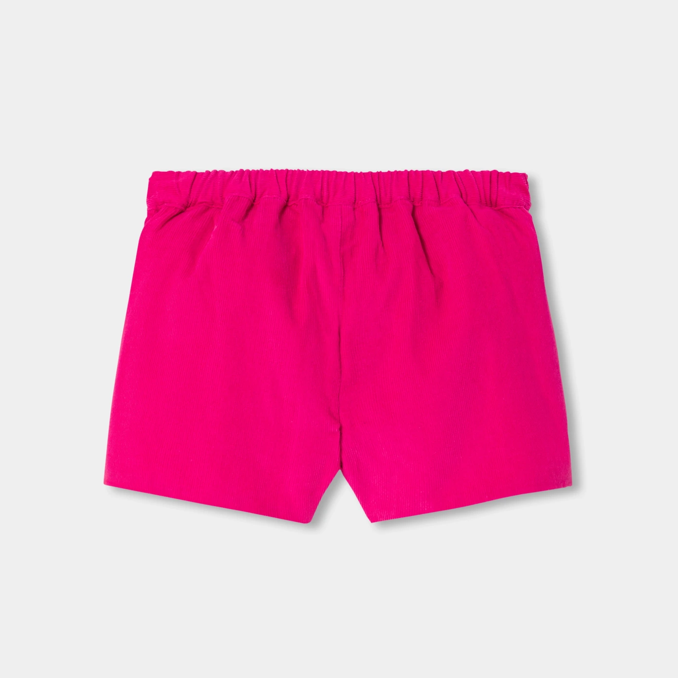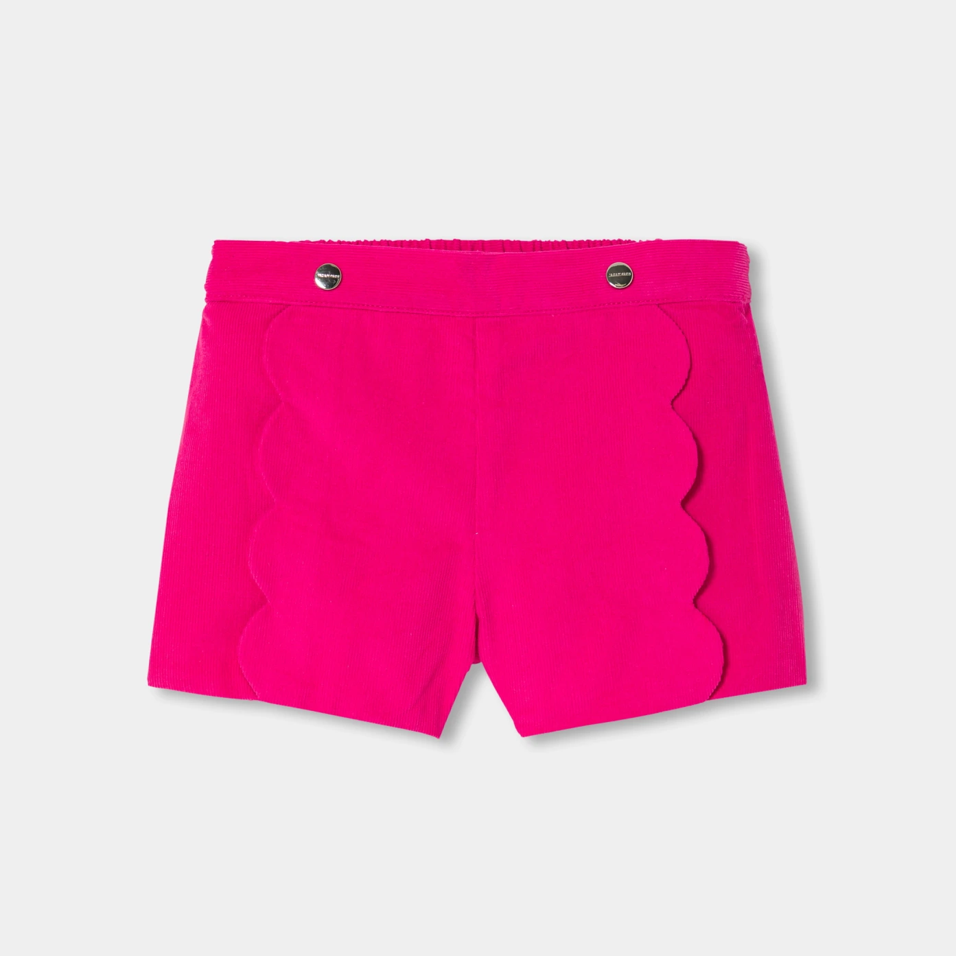 這款復古時尚的短褲為小女童增添典雅氣息。採用亮粉色細條絨製成,前片的波浪邊設計與銀色鉚釘細節更添精緻感,搭配格紋襯衫和開襟毛衣,輕鬆展現法式時尚。