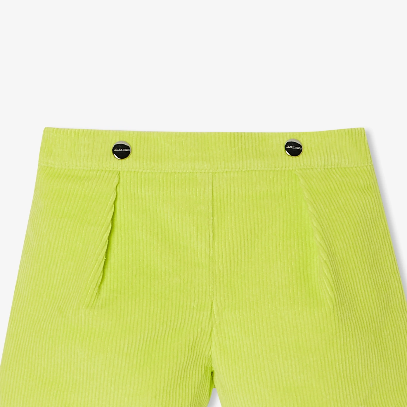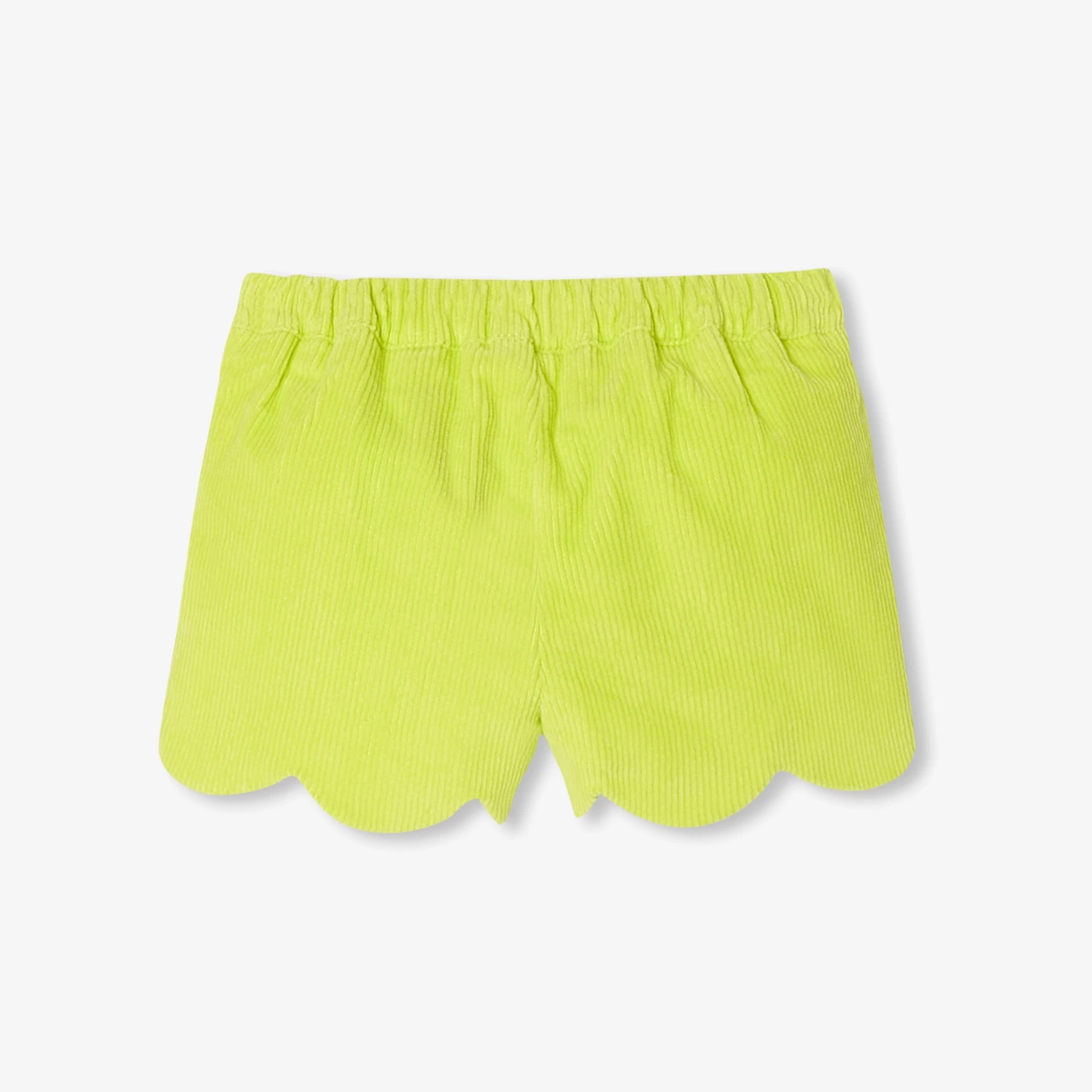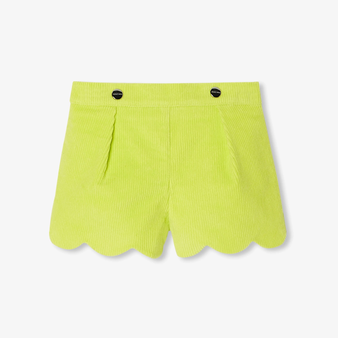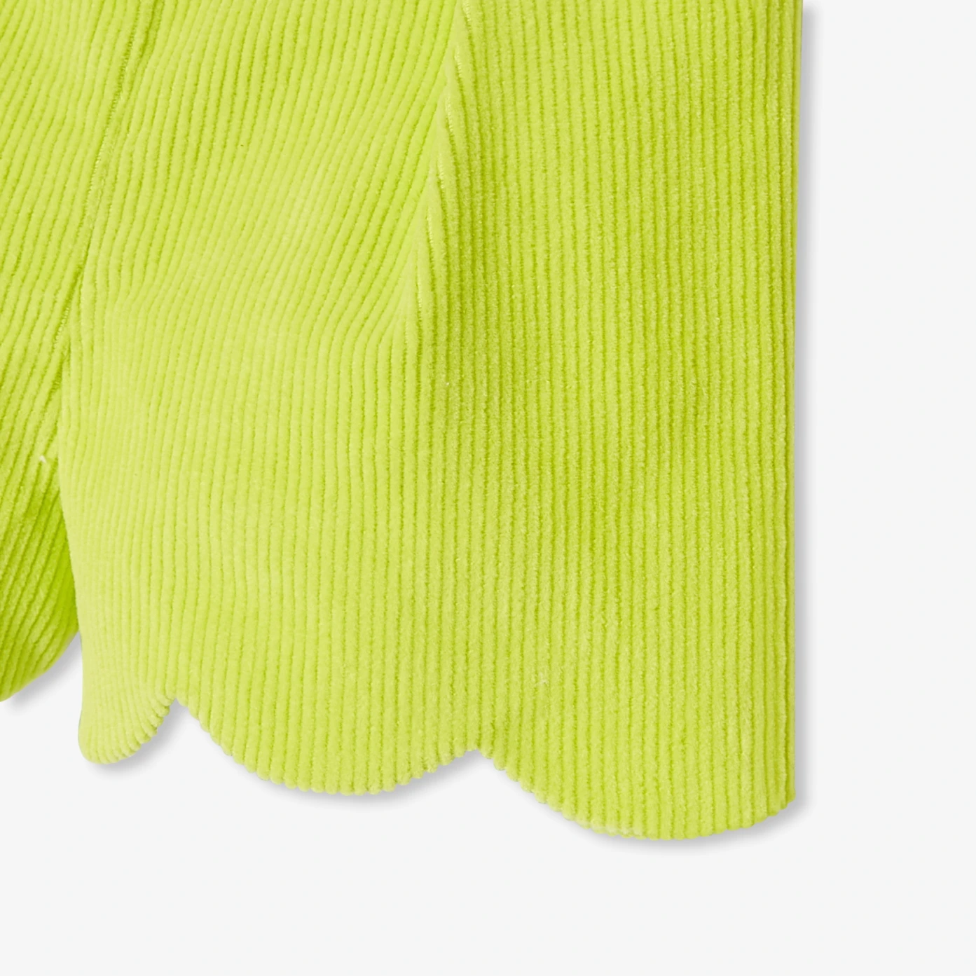 這款女寶寶短褲帶來時尚摩登的冬季風格,提供白色或萊姆綠選擇,精緻的波浪剪裁和銀色鉚釘增添活力。搭配領口設計的連身衣與針織外套,營造時髦造型。
