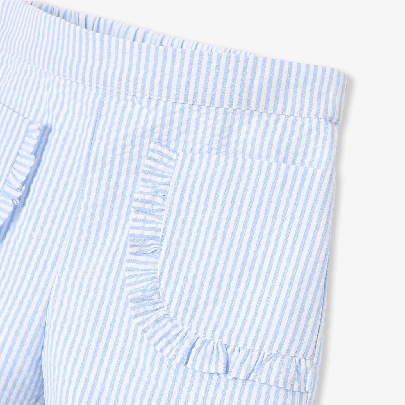經典的泡泡紗以極致輕盈與透氣舒適感華麗回歸!這款小女童短褲巧妙融合立體條紋質感與荷葉邊貼袋設計,展現復古學院風的優雅韻味。搭配襯衫或 T 恤,輕鬆打造精緻法式造型,迎接愉悅夏日時光。