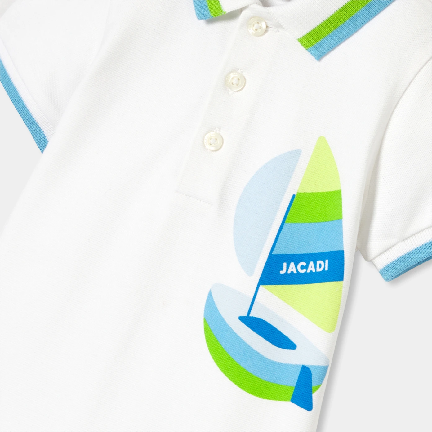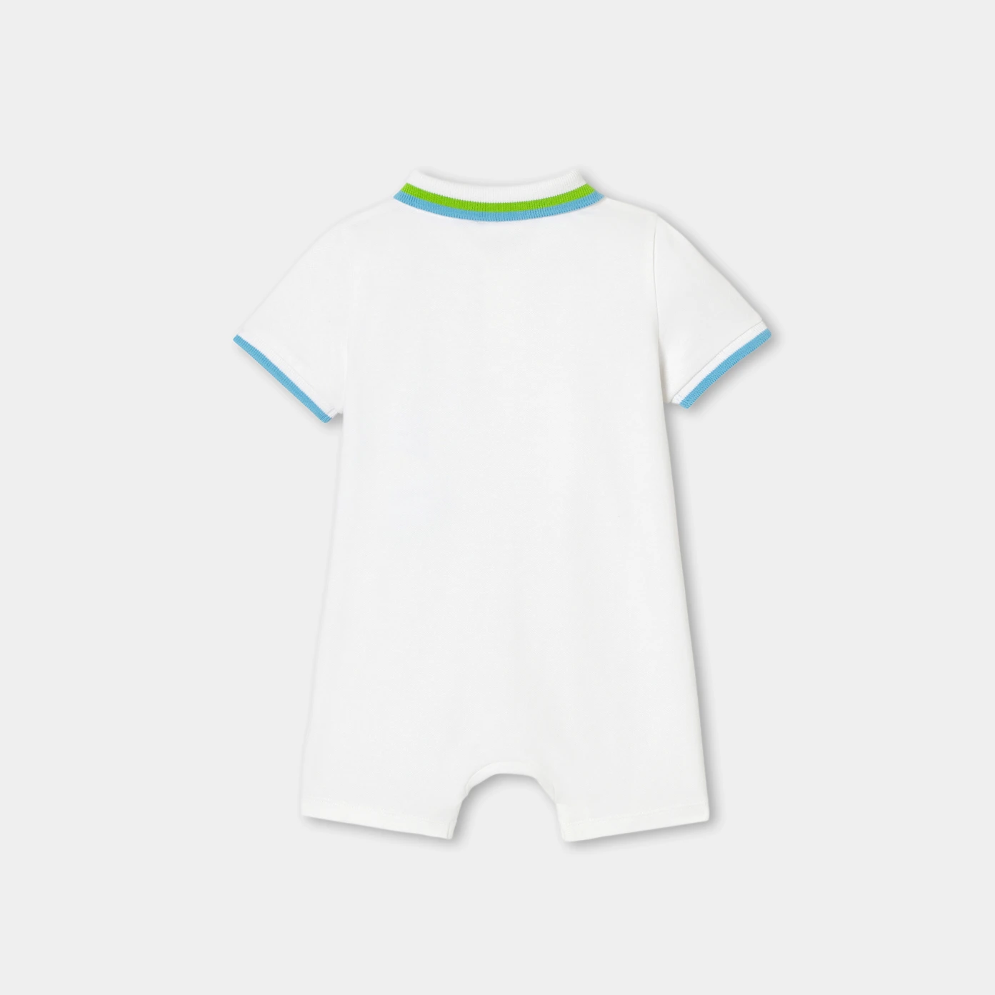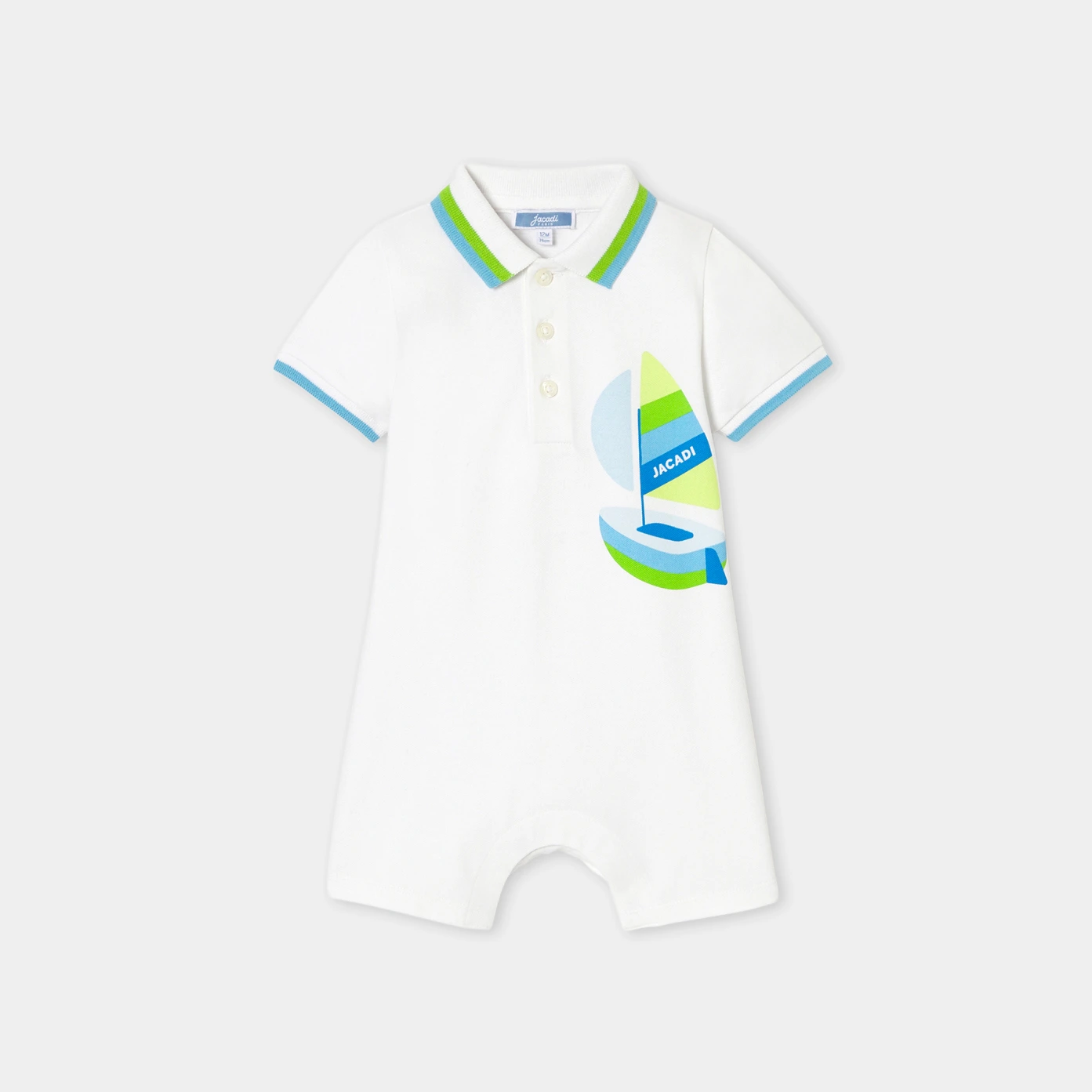 這款小男童連身短褲融合運動與時尚風格,舒適柔軟的有機棉珠地布如 Polo 衫般俐落。印花小船圖案、條紋領與撞色袖口為夏日造型注入活潑氣息,無論城市漫遊或海邊度假都適合穿著。