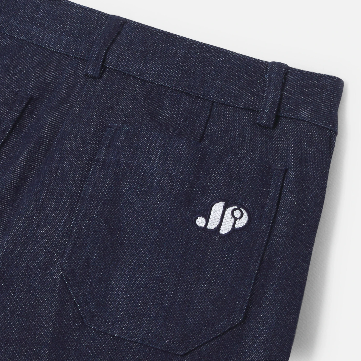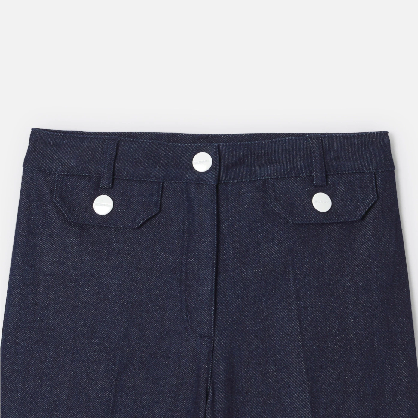 這款女孩闊腿牛仔褲是春季必備單品。前後貼袋和腿部打褶為這款賦予復古時尚感,可搭配 T 恤和愛心圖案法式開襟外套,打造具有巴黎魅力的城市造型。